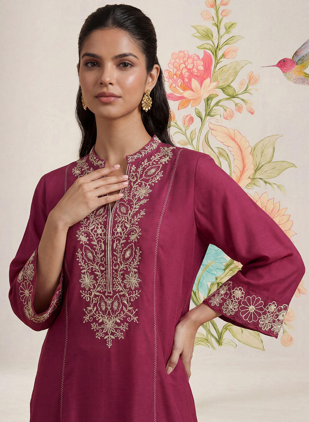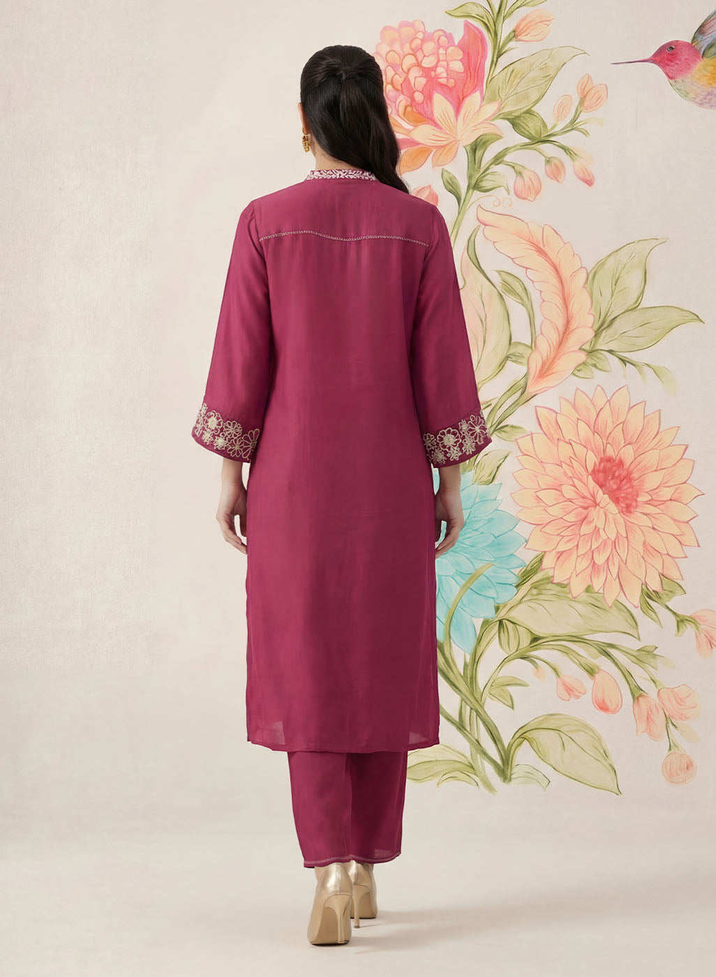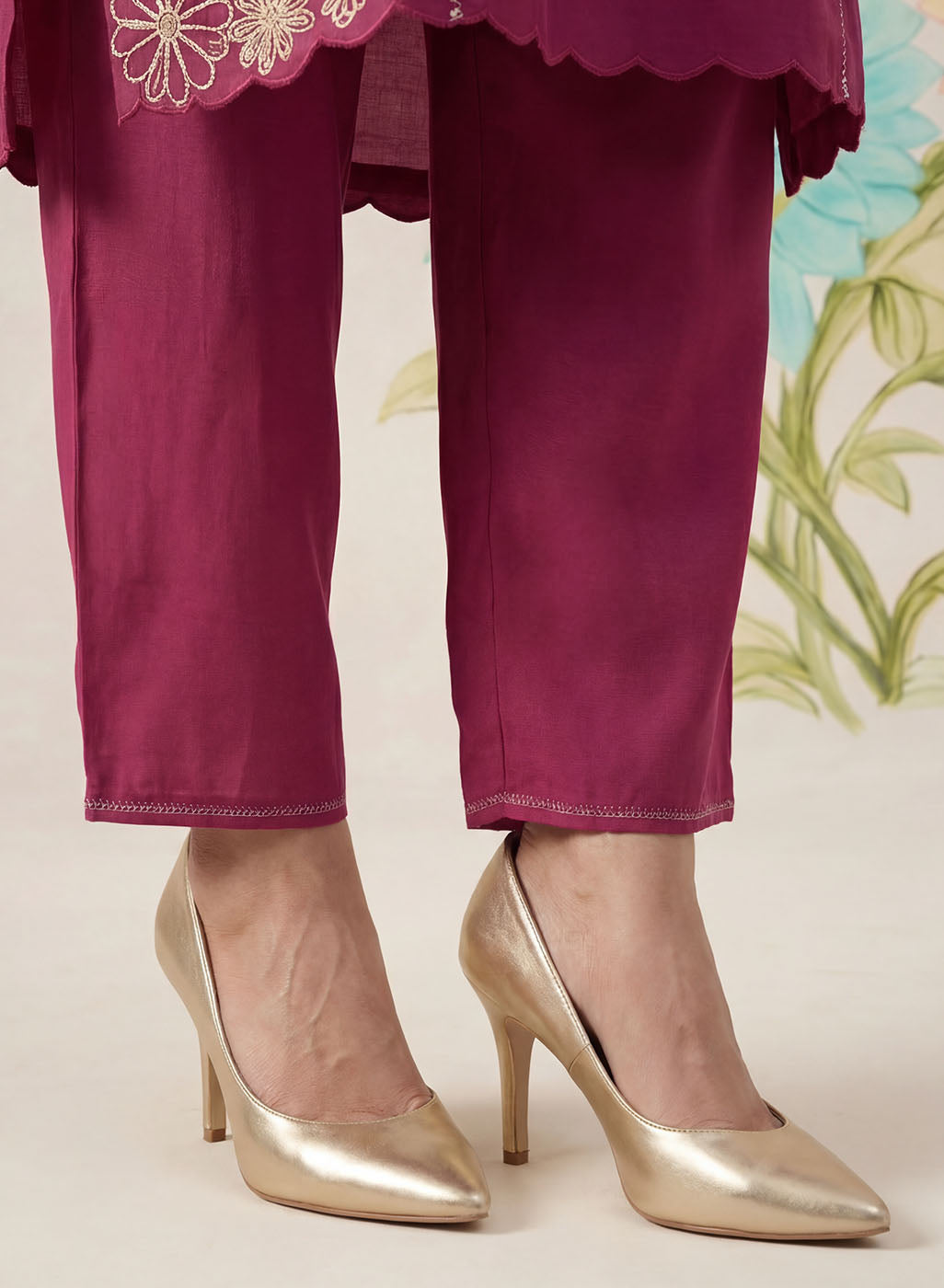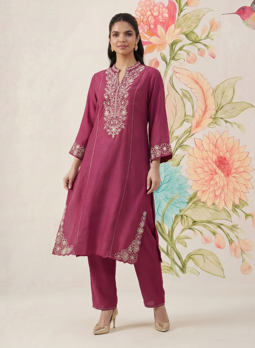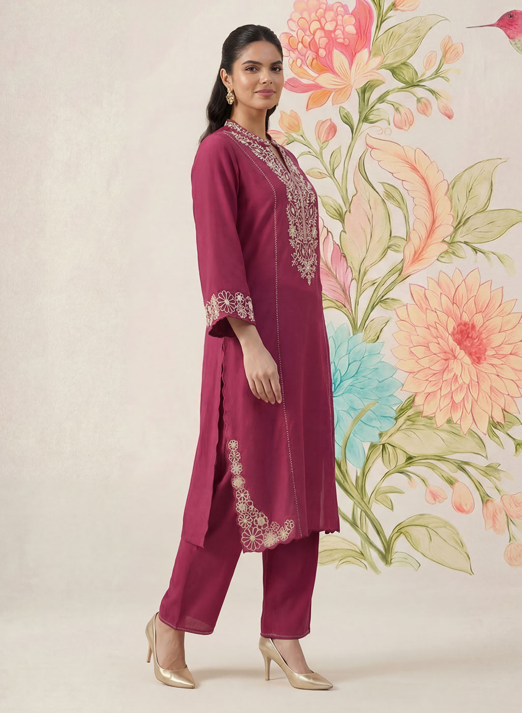 Striking yet refined, this dark fuchsia kurta set is designed in a breathable cotton blend with a soft, linen-like texture that flows beautifully through the day. The kurta is adorned with intricate dori embroidery in contrasting white thread, elevated with subtle sequin highlights. Tailored in a flattering A-line silhouette with princess panels, the kurta features a mandarin collar and elegant bell sleeves. Delicate interlock detailing along the princess seams and scalloped accents on the hemline and side slits add thoughtful finishing touches. - Flowy, breathable cotton blend with linen-like texture. - Contrast dori embroidery with sequin highlights on front, back neckline, sleeves, and hemline. - Mandarin collar with a clean neckline finish. - A-line, princess panelled silhouette for a flattering fit. - Interlock detailing along princess seams. - Bell sleeves with embroidered accents. - Scalloped detailing on hemline and side slits. - Mid-rise straight pants with elastic waist, pockets, and interlock detailing