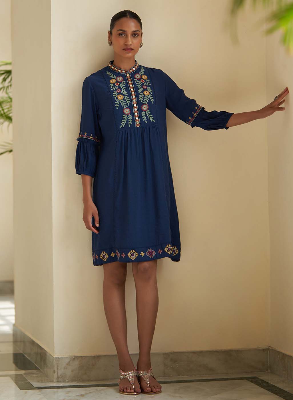Classic Blue Embroidered Kurta for Women with Puffed Sleeves