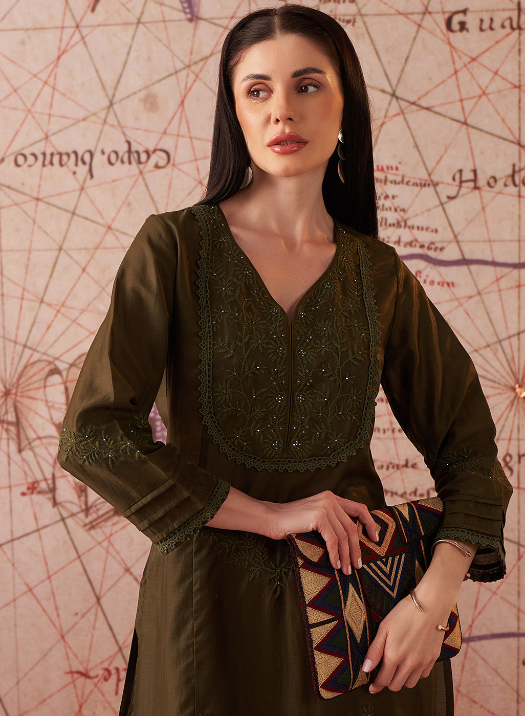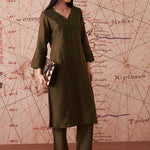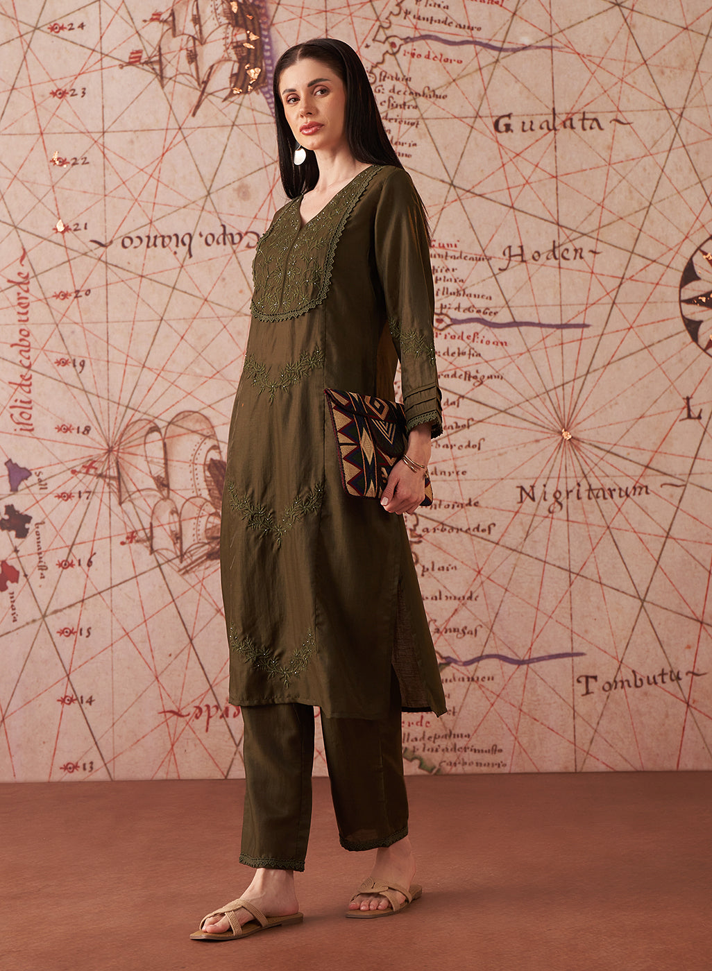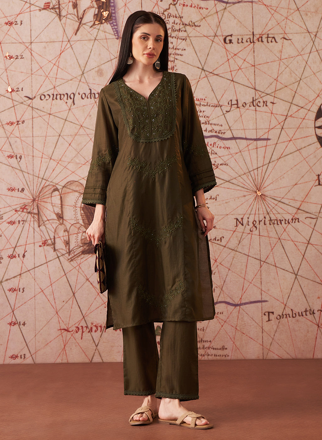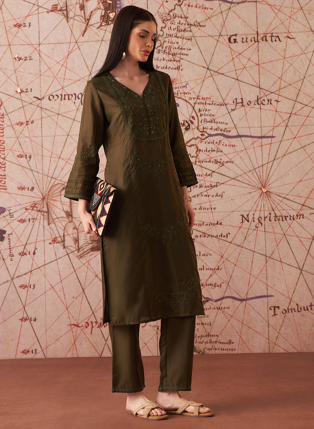 Jashn Olive Self Embroidered Satin V-neck Straight Co-ord Set
