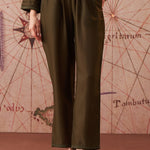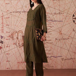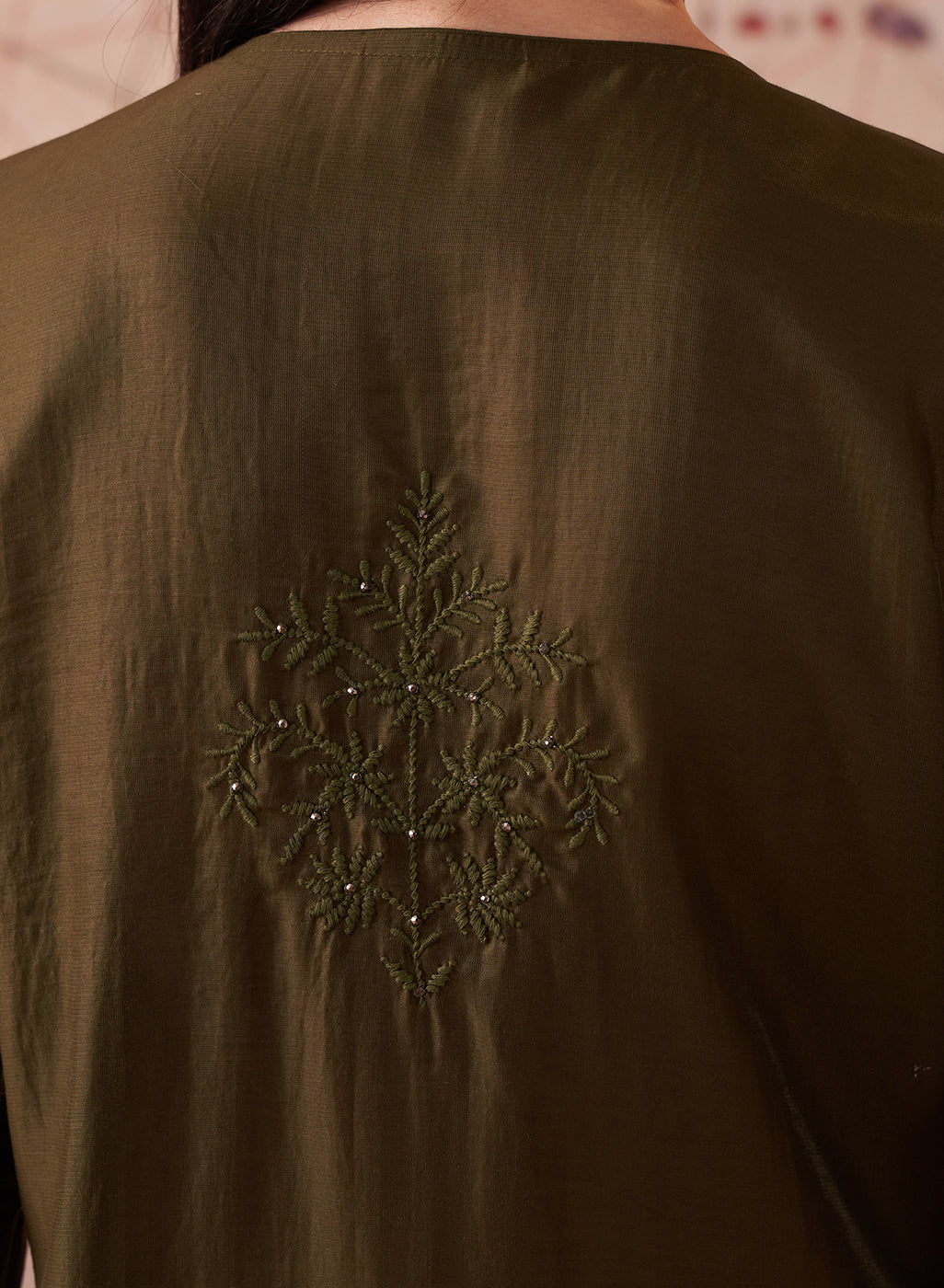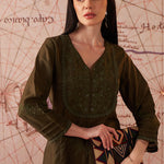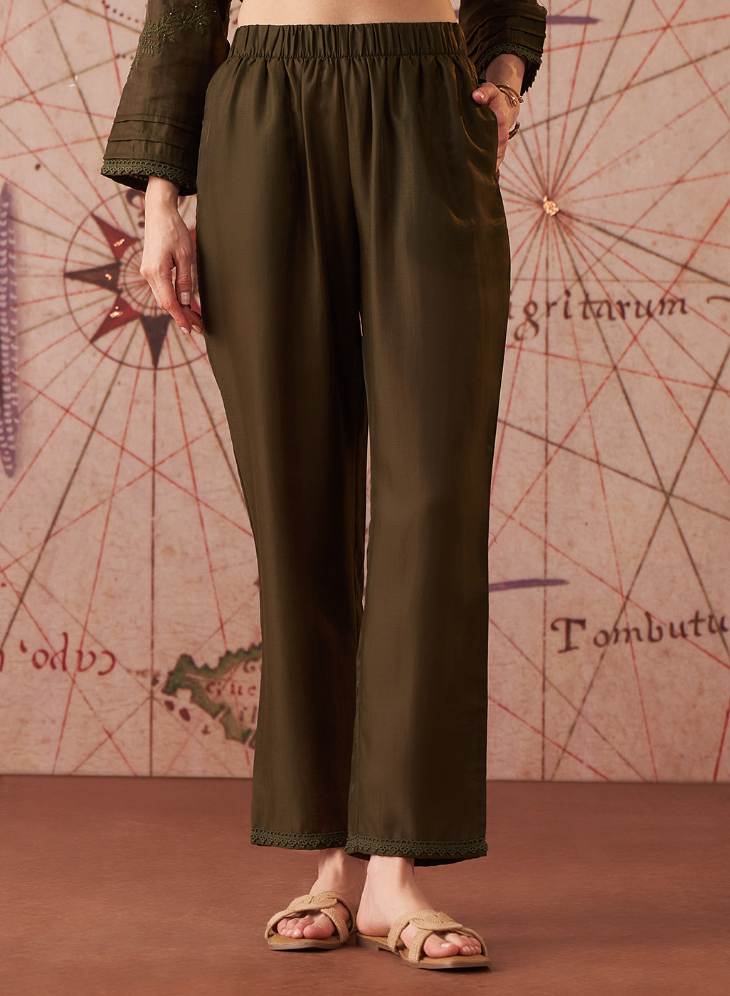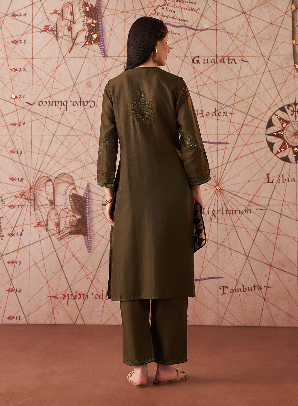 Jashn Olive Self Embroidered Satin V-neck Straight Co-ord Set
