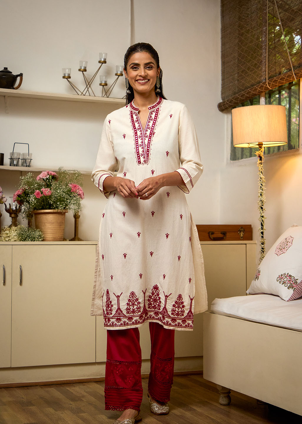 Aks Cream Embroidered Modal Chanderi Tunic for Women