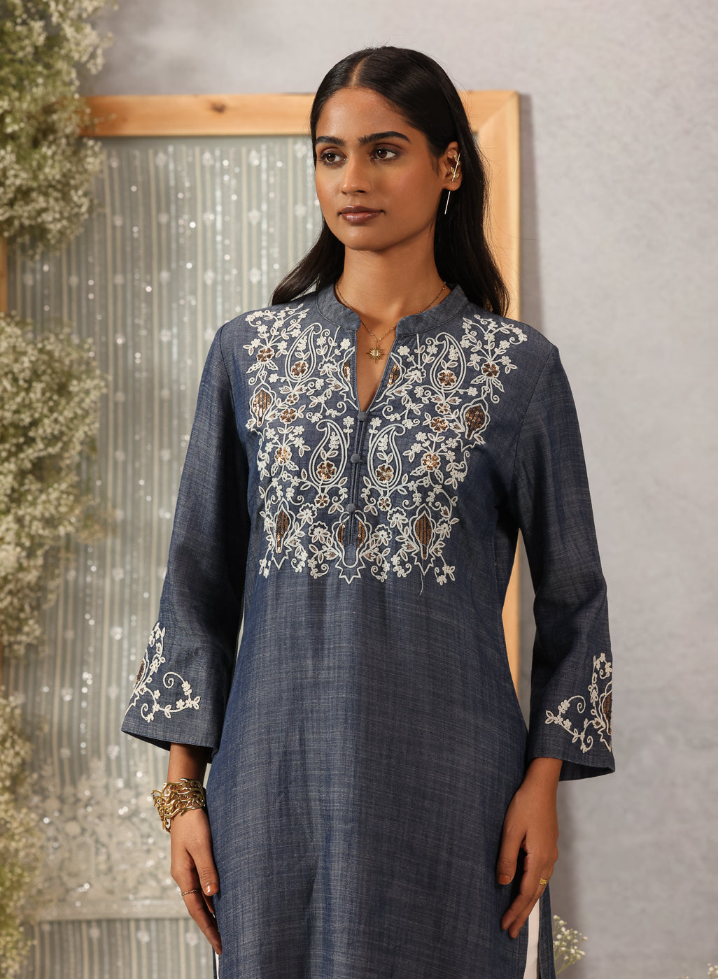 Manzar Royal Blue Embroidered Cotton Linen Tunic for Women