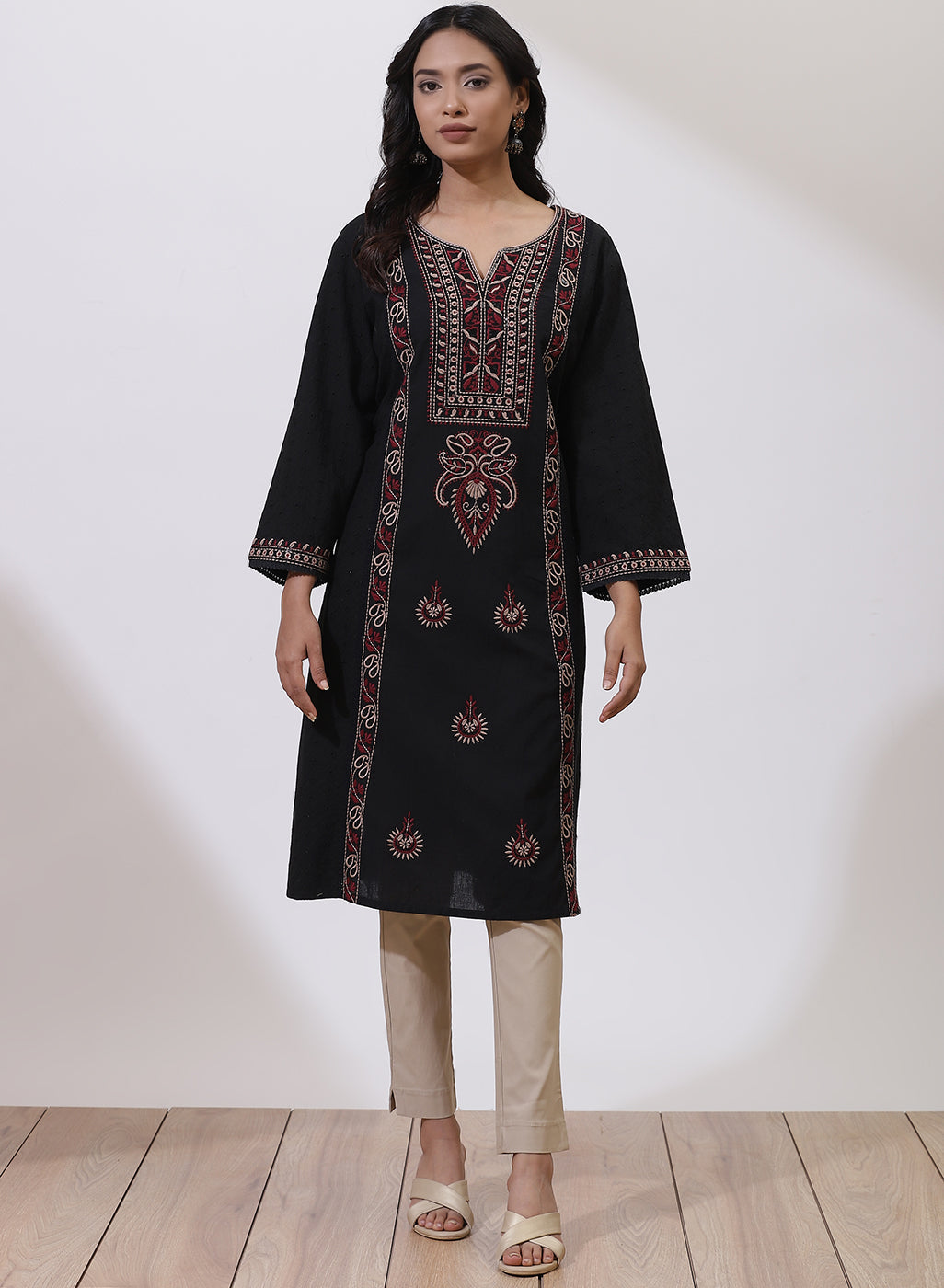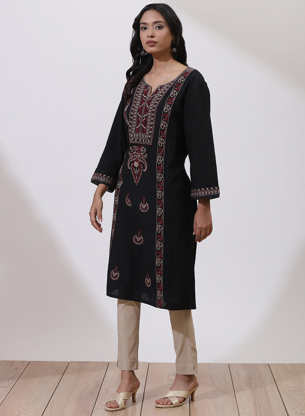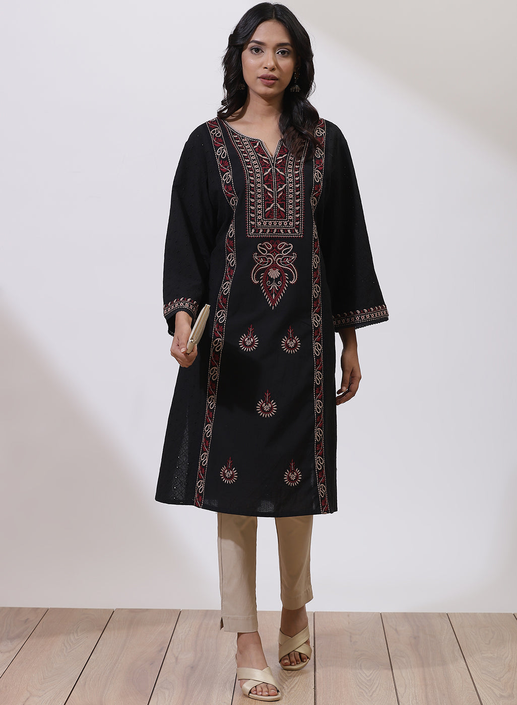 Amp up your style game with this black embroidered kurta by Lakshita featuring a solid base with laid-out floral & paisley embroidered panels at the neckline and bodice. Crafted with the finest material, pair this kurta with a pair of black palazzos for a casual or semi-formal look.