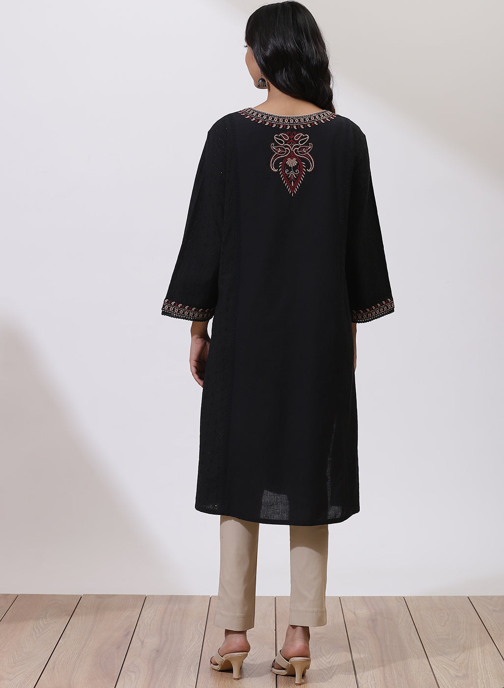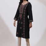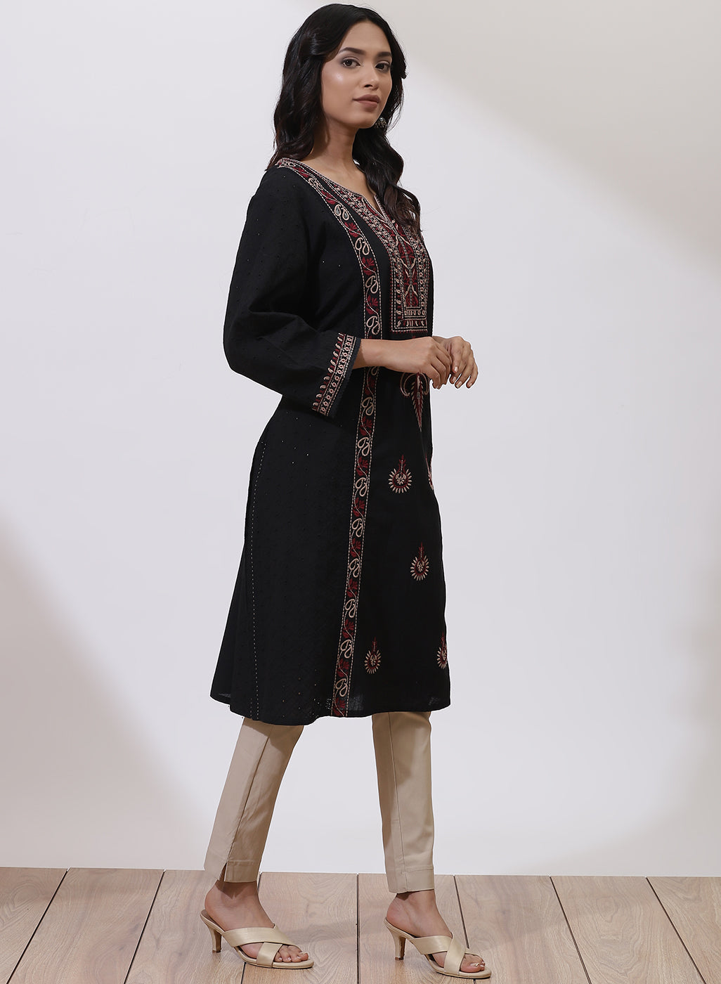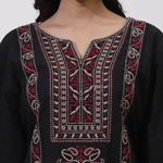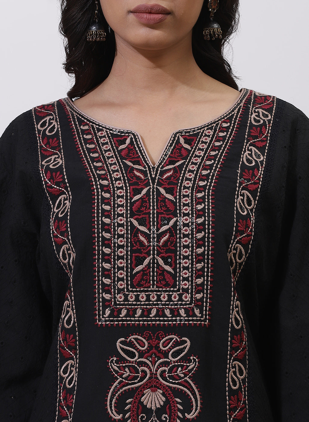 Amp up your style game with this black embroidered kurta by Lakshita featuring a solid base with laid-out floral & paisley embroidered panels at the neckline and bodice. Crafted with the finest material, pair this kurta with a pair of black palazzos for a casual or semi-formal look.