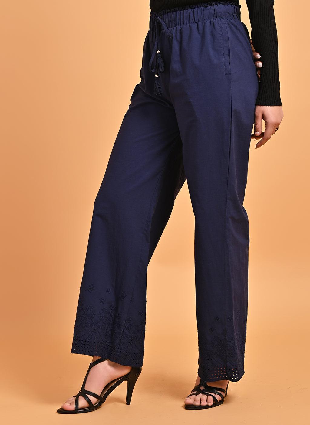Maya Navy Blue Embroidered Relaxed Fit Cotton Palazzos for Women