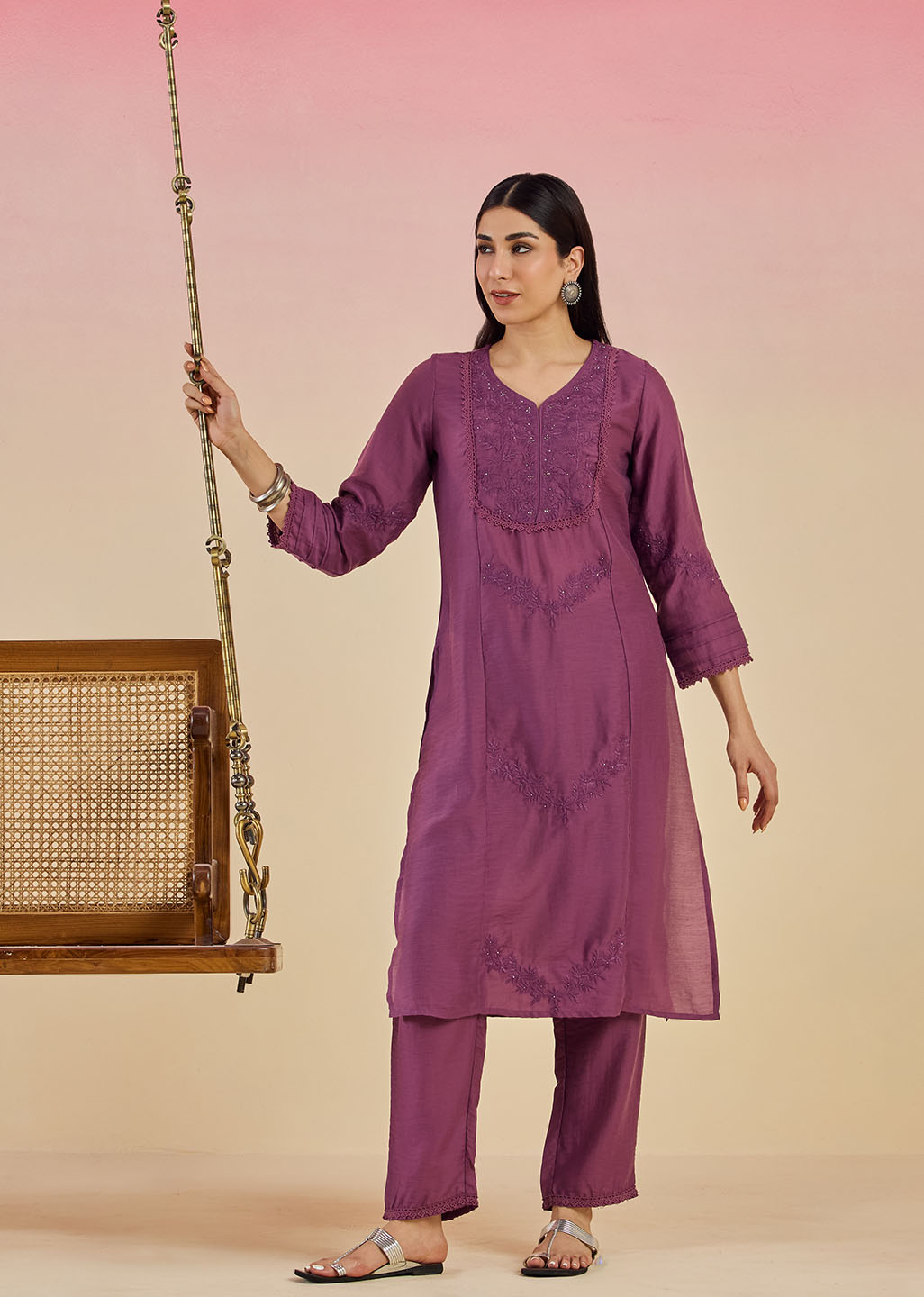 Ibadat Deep Purple Floral Embroidered Rayon V-neck Kurta Set with Pockets