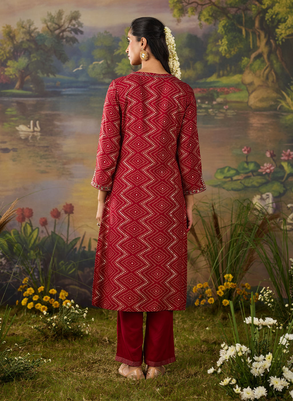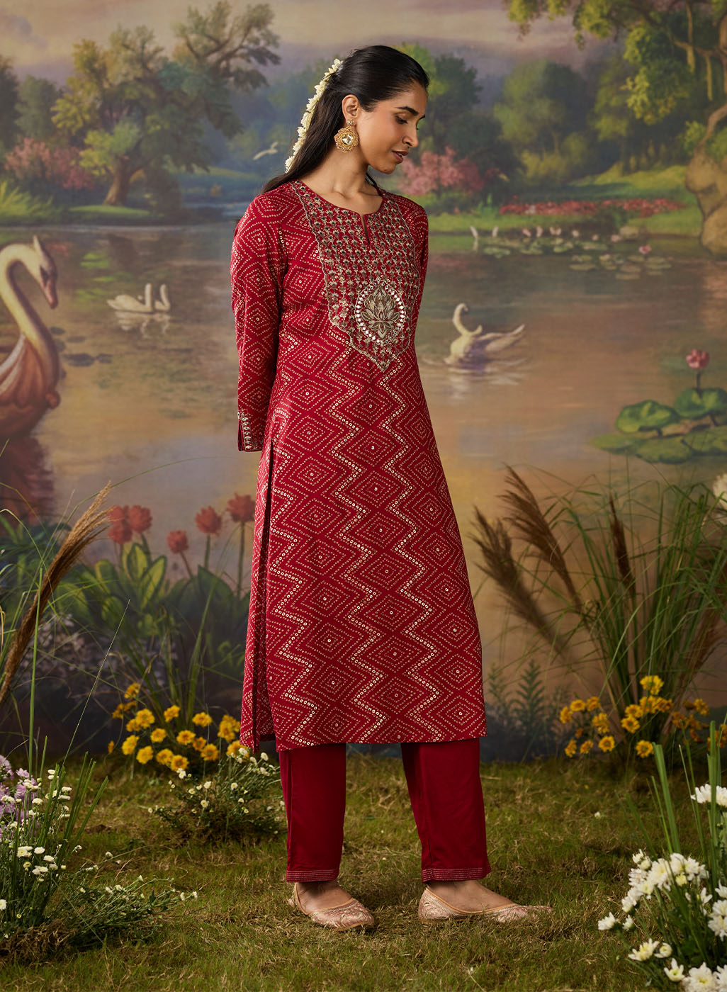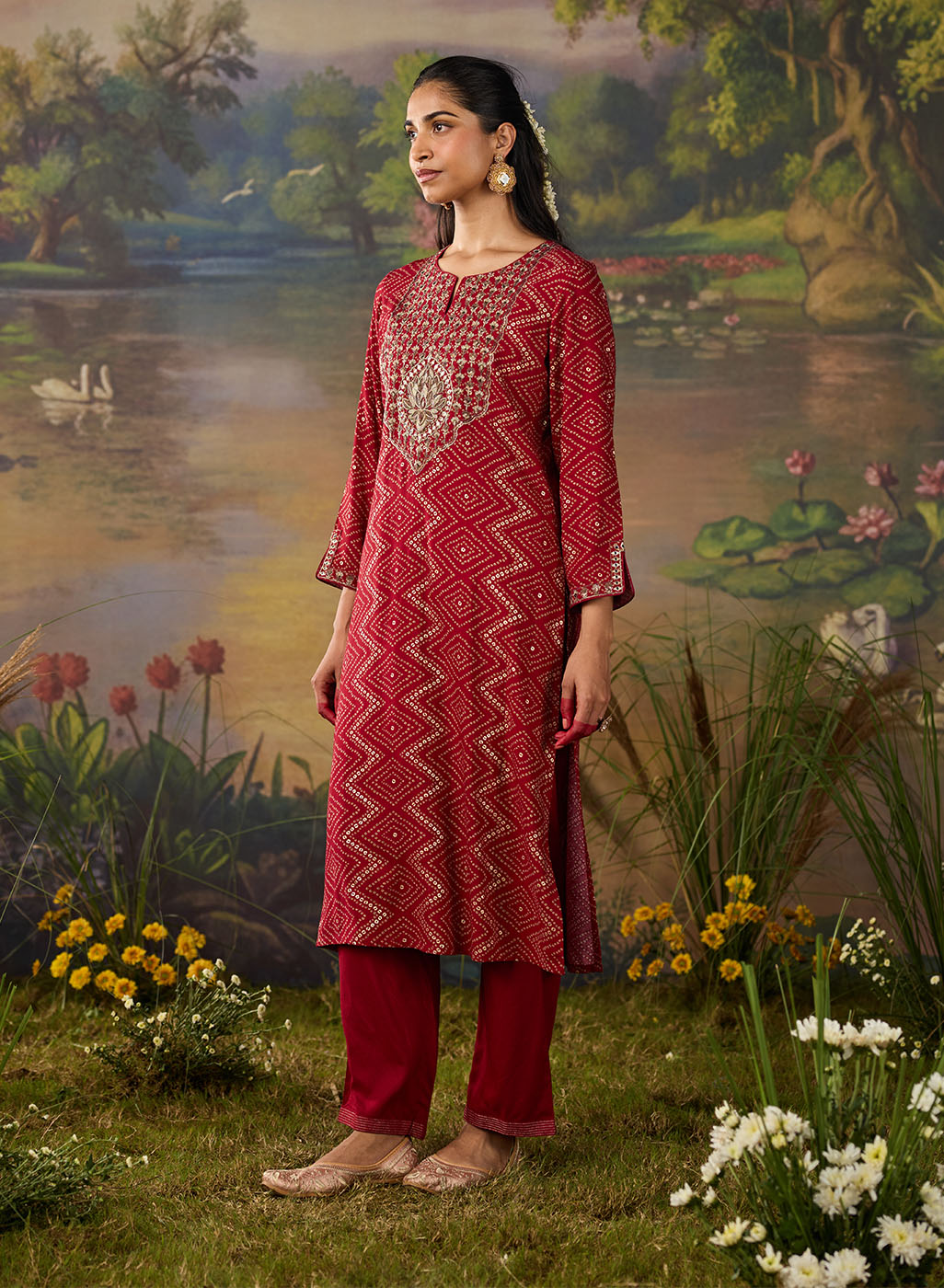Vibrant and festive, this red kurta set is a celebration of tradition reimagined for modern elegance. Crafted from lightweight viscose, the straight kurta features an all-over bandhni-inspired print in a chevron pattern, accentuated with delicate gold foil detailing for a subtle shimmer. The neckline and sleeves are elevated with intricate zari embroidery, sequin highlights, and mirror accents that add the perfect amount of festive flair. The sleeve hem is finished with a slit and embroidery detail, blending charm with comfort. Paired with solid straight bottoms embroidered at the hem, this set is the perfect balance of festive flair and wearable ease.
