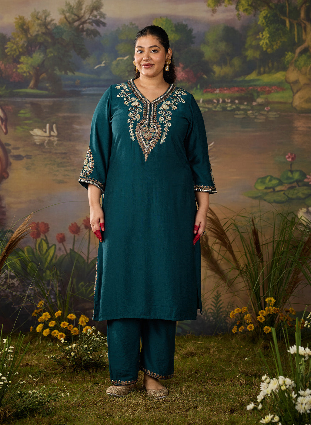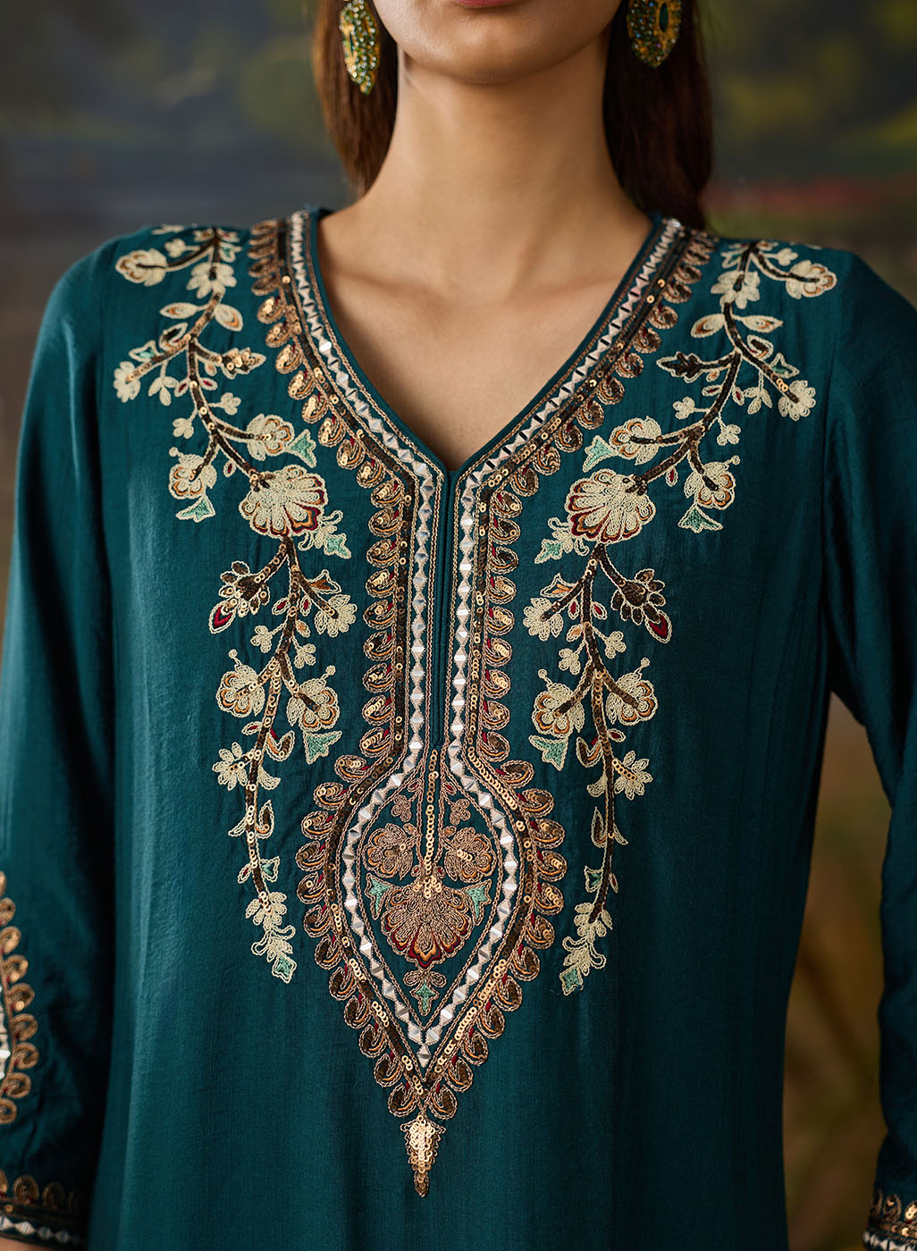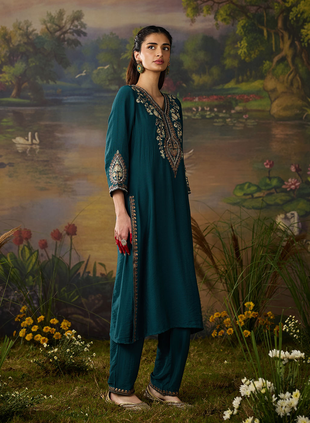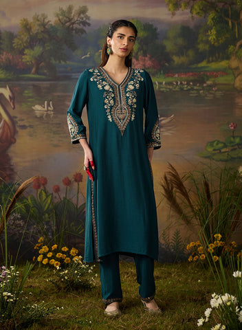 Graceful and intricately detailed, this teal blue viscose kurta set is a perfect blend of elegance and festive flair. Crafted in a soft, breathable fabric, with a soft sheen, the straight kurta is elevated with exquisite dori work and resham embroidery, highlighted by zari, sequins, and delicate mirror accents. The embroidery is thoughtfully placed along the neckline, sleeve hems, and centre back, while zari and sequin embellishments on the side slits add just the right touch of shimmer. Paired with solid straight pants, the look is refined yet festive. The bottoms feature a neatly embroidered hem with zari and sequin borders that beautifully complement the kurta.