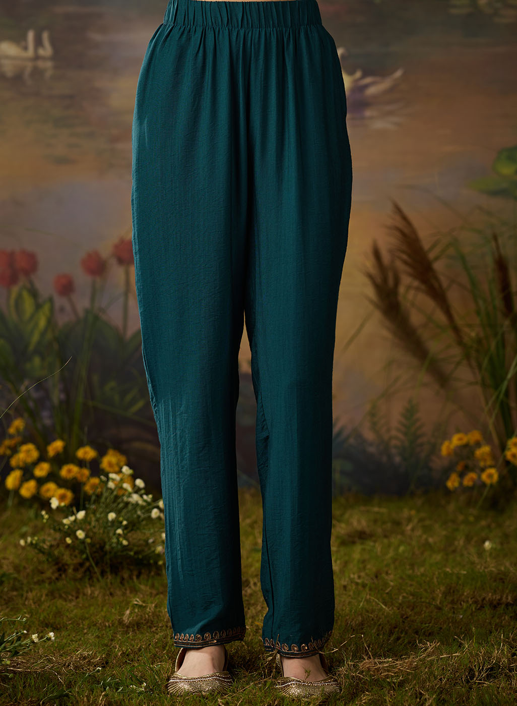 • Mid-rise, straight solid pants with elastic waistband and zari embroidered hem
