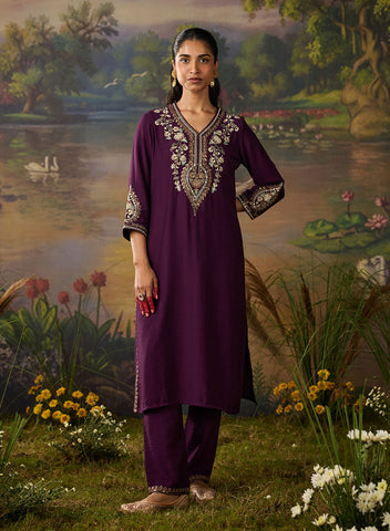 • Straight kurta with intricate embroidery on neckline, sleeve hems, side slits, and centre back