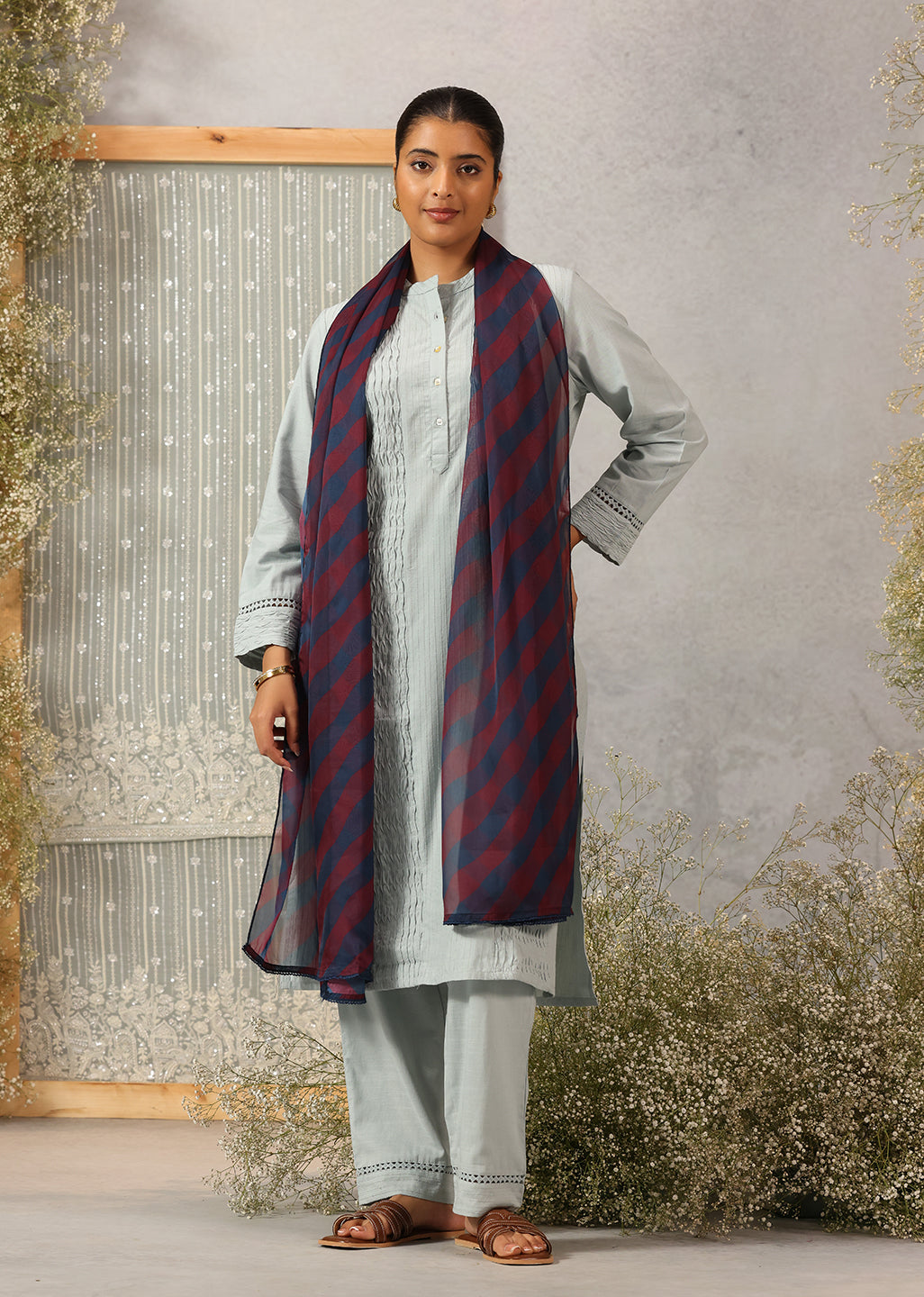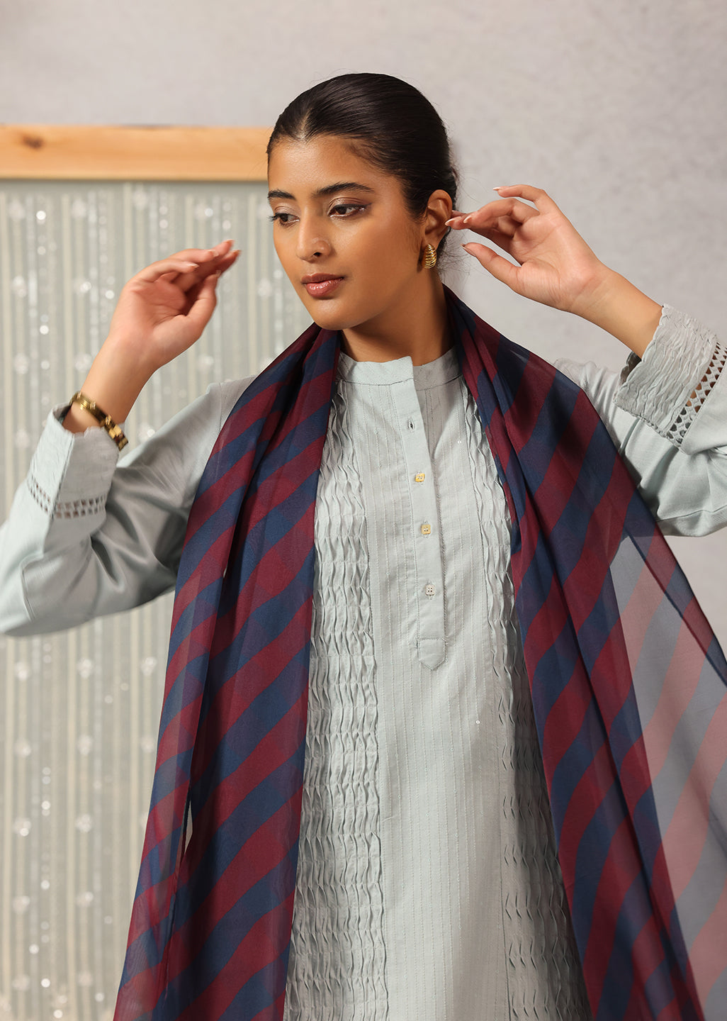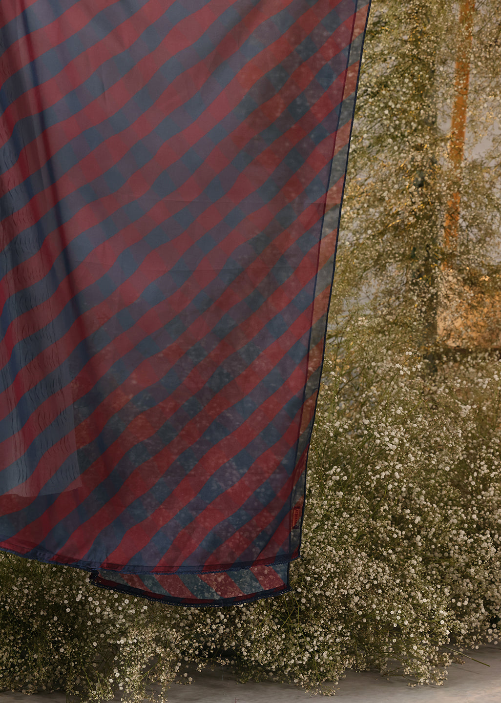 Rich and regal, this burgundy georgette dupatta makes a striking statement with its leheriya-inspired print. Finished with lace edging on both ends, it effortlessly adds depth and elegance to your everyday pairings.
