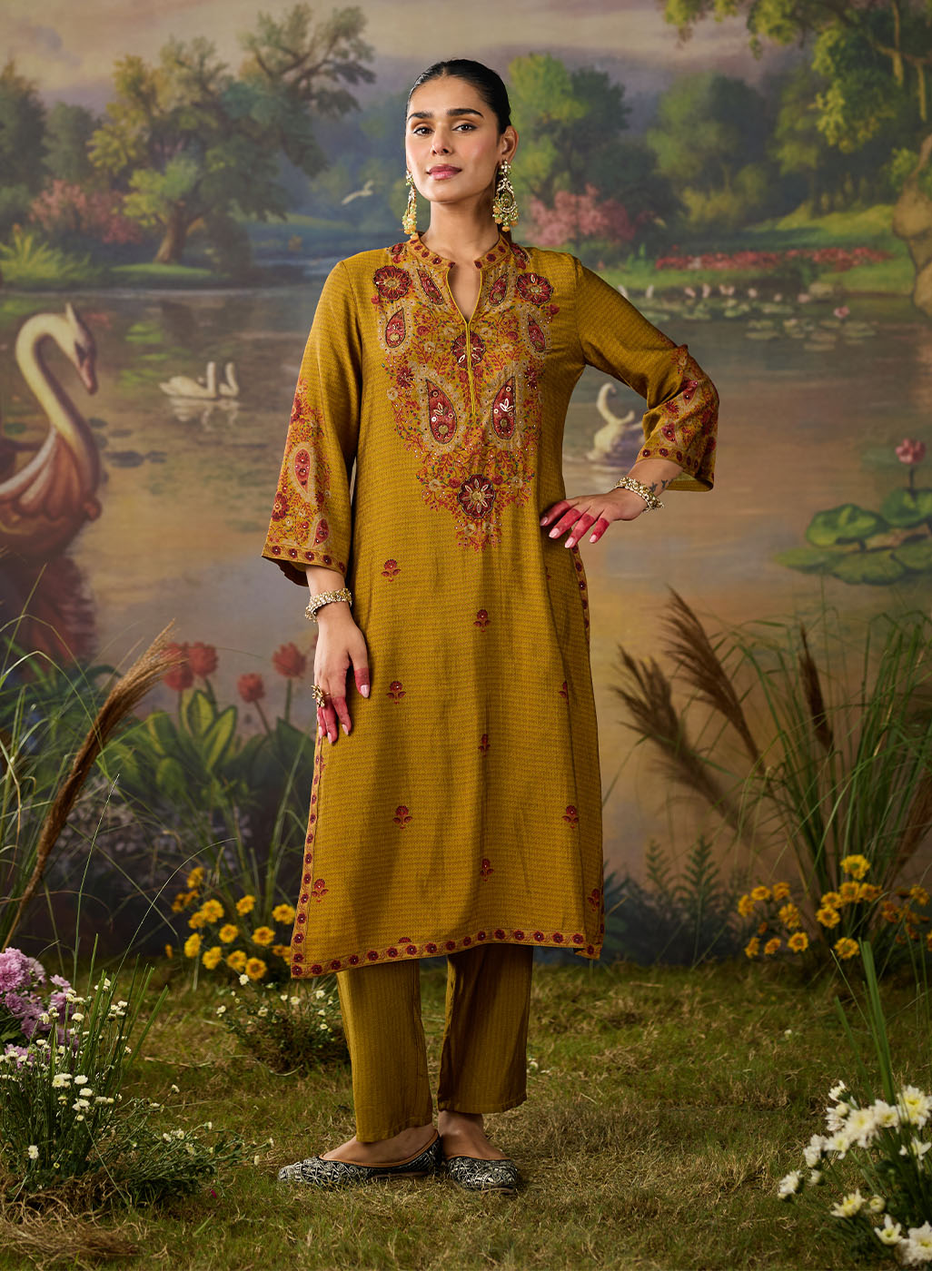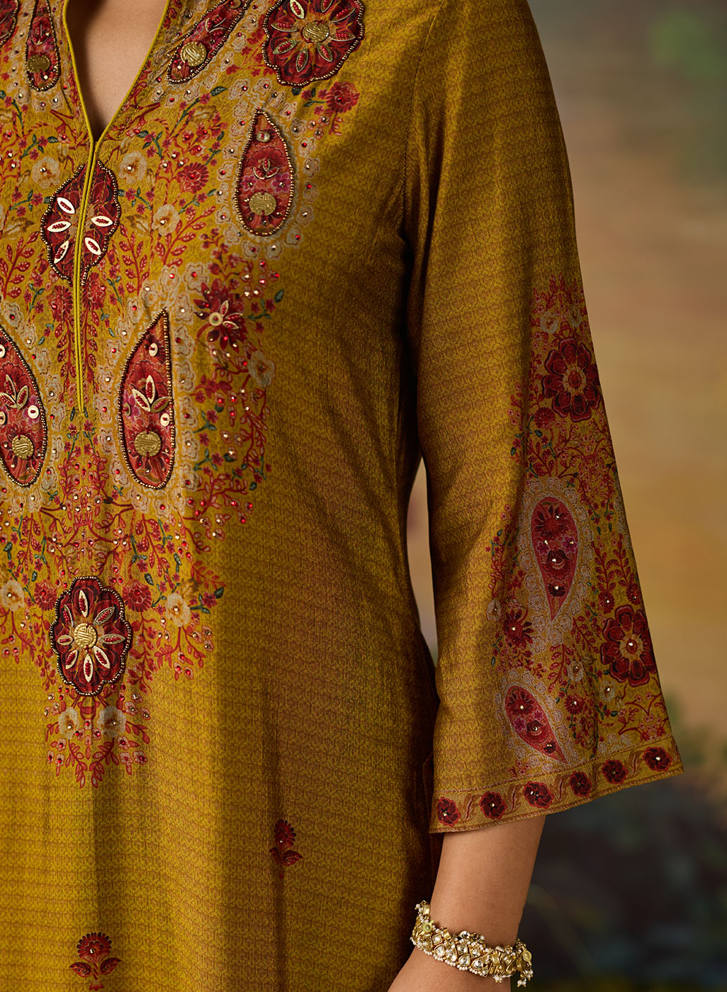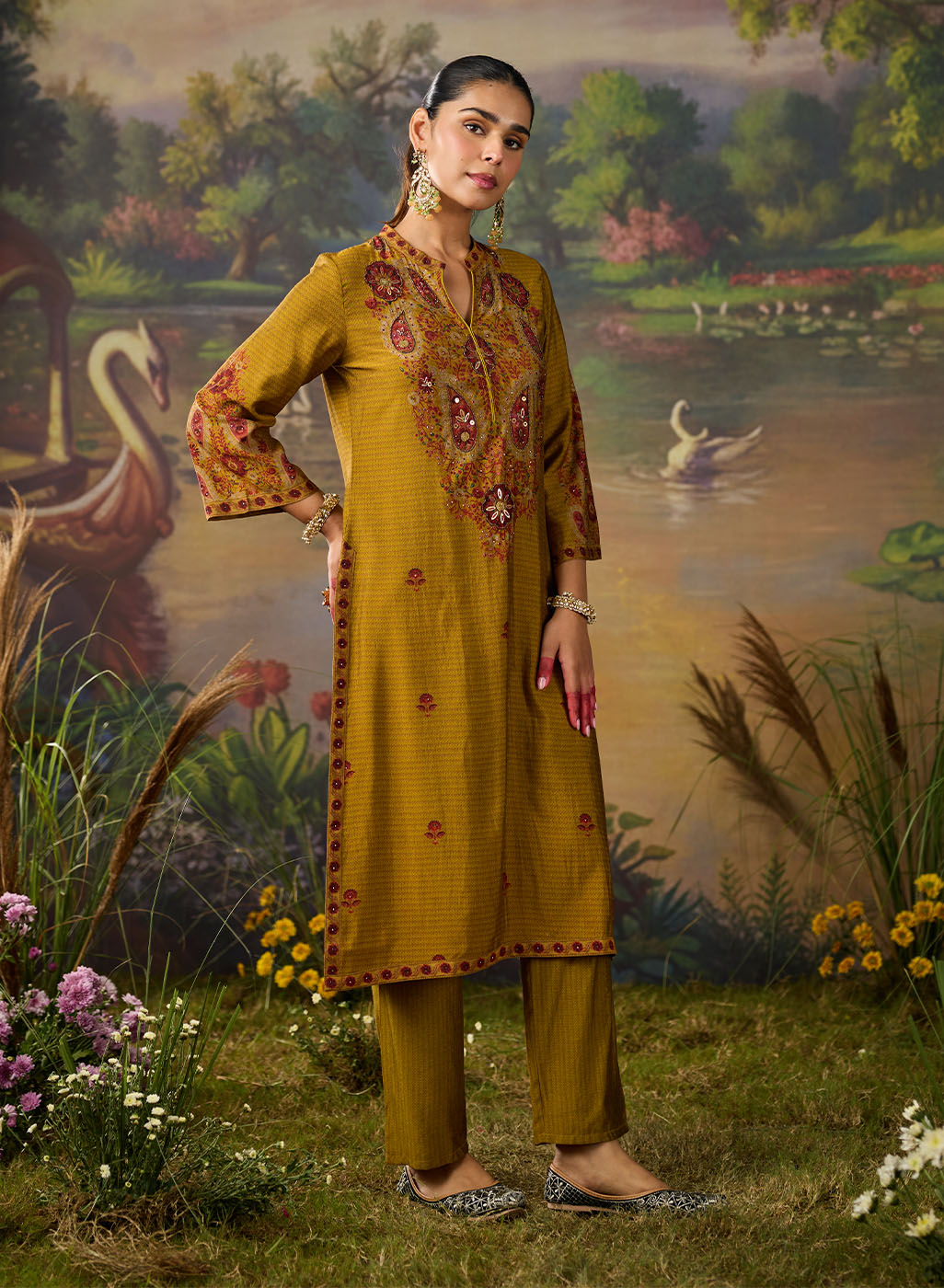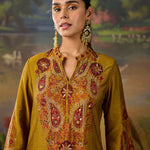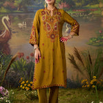 Bright, bold, and beautifully detailed! This mustard printed kurta set is designed to make a statement while keeping things effortlessly elegant. Crafted in lightweight shantoon, the straight ethnic kurta features an all-over print, elevated with striking embroidery on the yoke and mandarin collar. The intricate threadwork, highlighted with rhinestones, beads, and coin accents, adds festive sparkle to this shantoon kurta set. Paired with matching printed bottoms, this embellished kurta set is the perfect pick for when you want an outfit that’s chic yet comfortable.