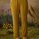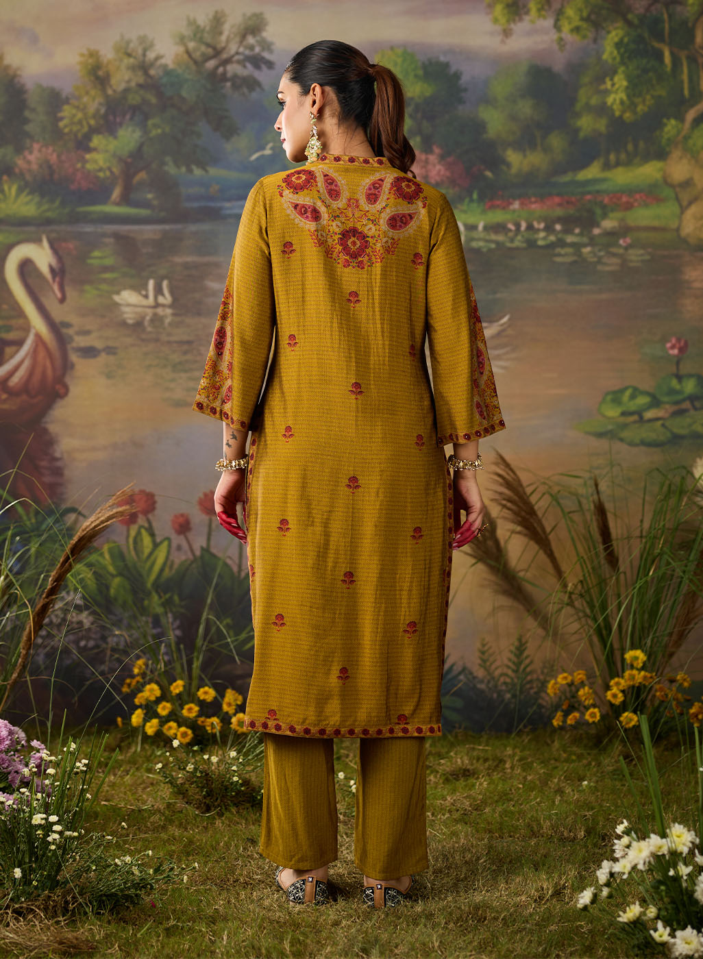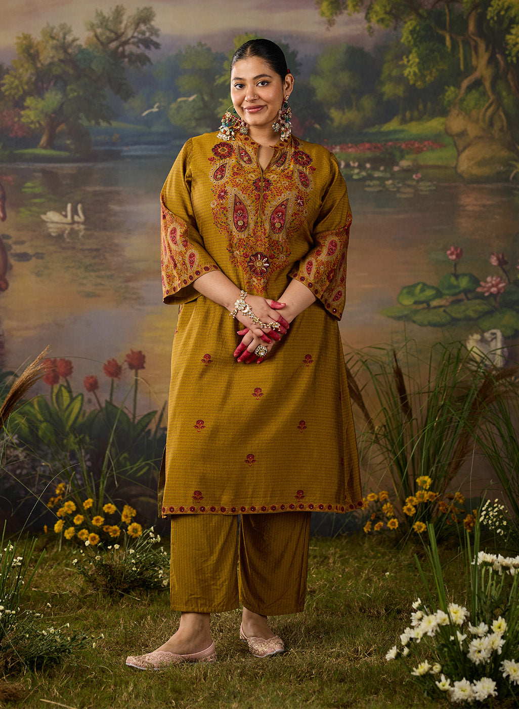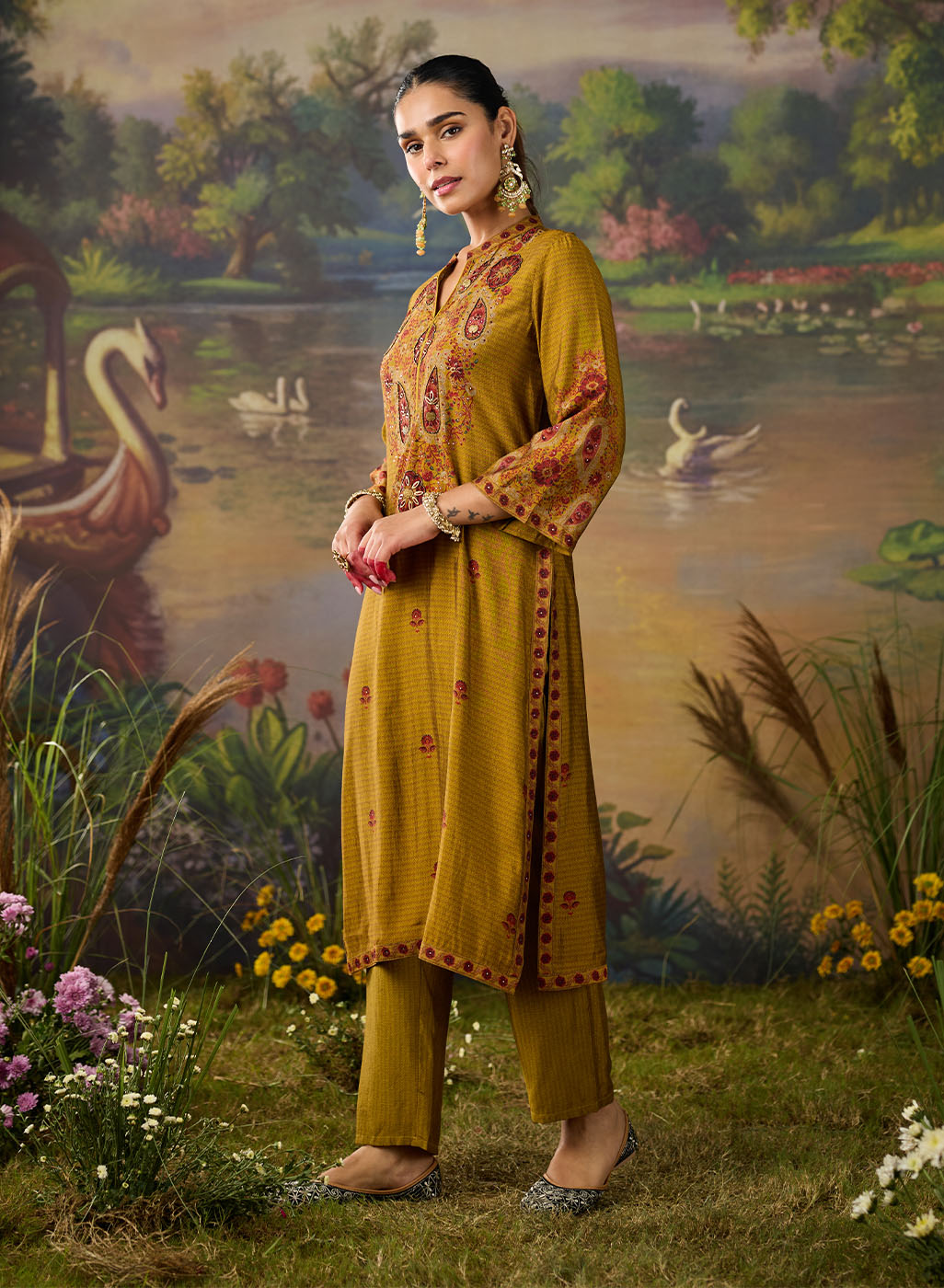 Bright, bold, and beautifully detailed! This mustard printed kurta set is designed to make a statement while keeping things effortlessly elegant. Crafted in lightweight shantoon, the straight ethnic kurta features an all-over print, elevated with striking embroidery on the yoke and mandarin collar. The intricate threadwork, highlighted with rhinestones, beads, and coin accents, adds festive sparkle to this shantoon kurta set. Paired with matching printed bottoms, this embellished kurta set is the perfect pick for when you want an outfit that’s chic yet comfortable.