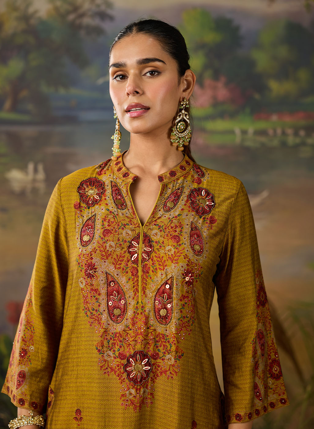 • Mandarin collar with intricately embroidered yoke, detailed with embellishments