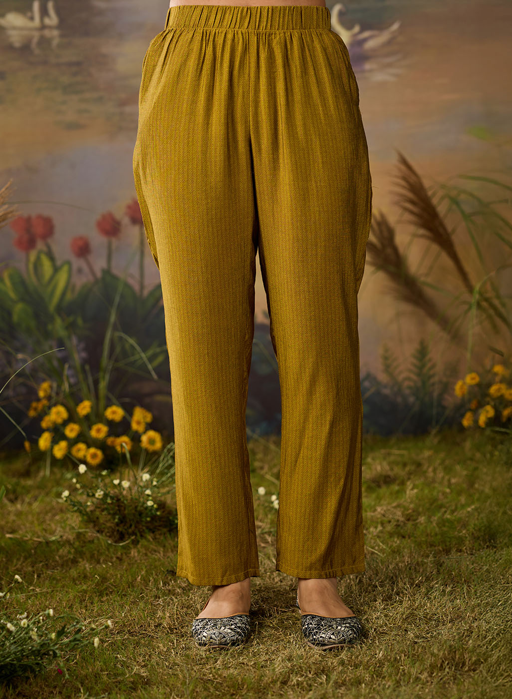 • Printed straight bottoms with mid-rise elastic waist & pockets