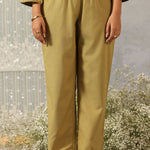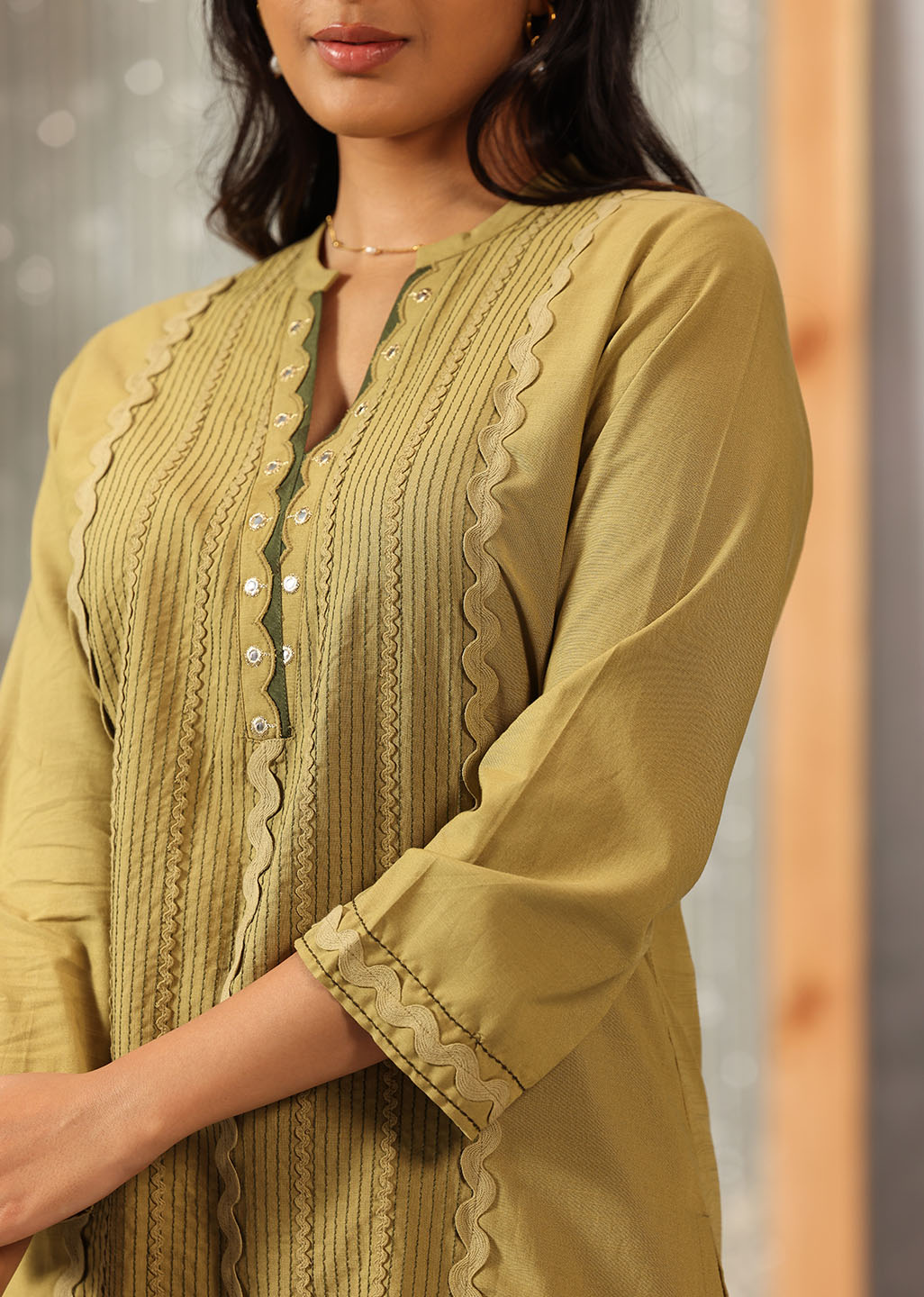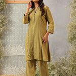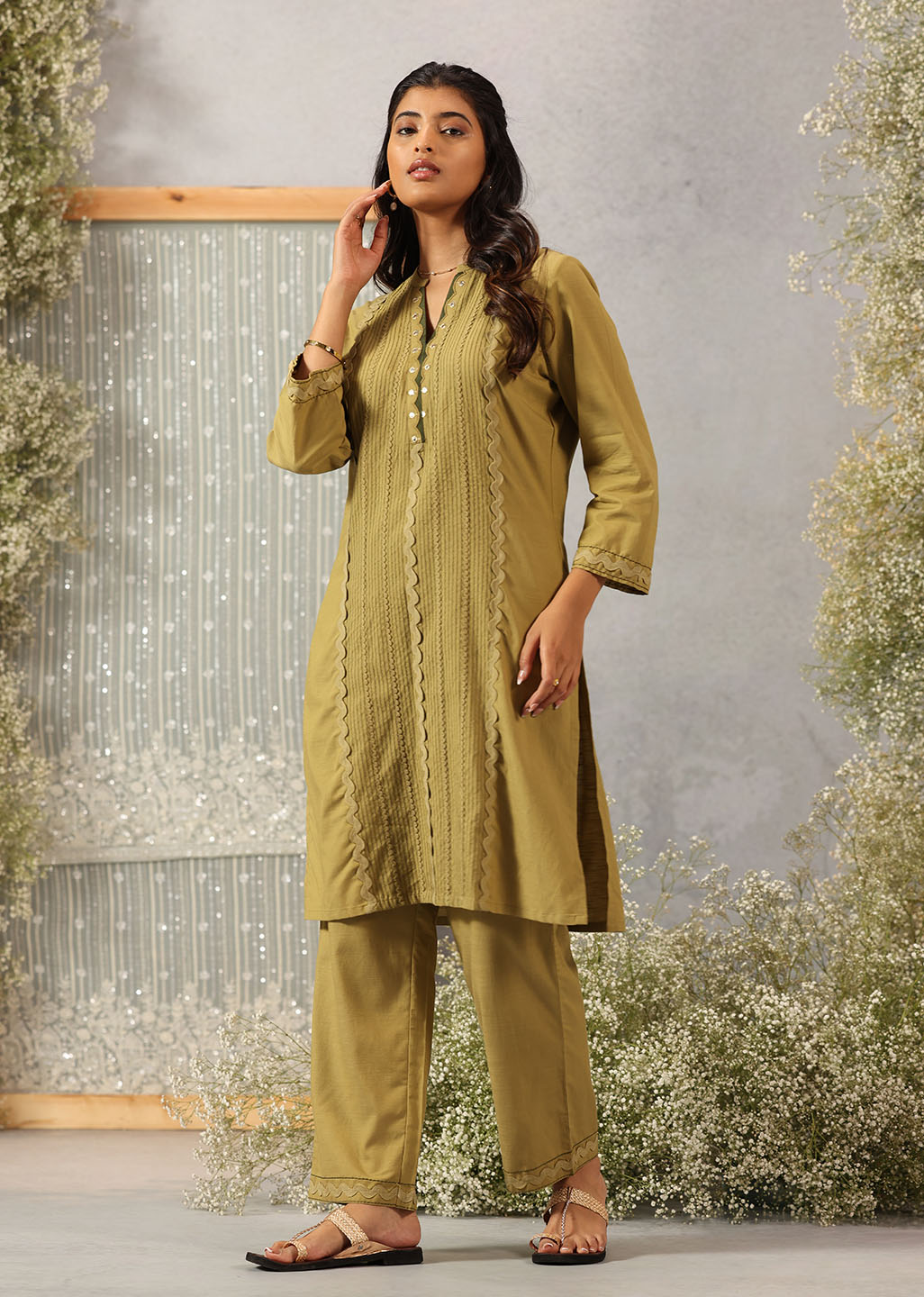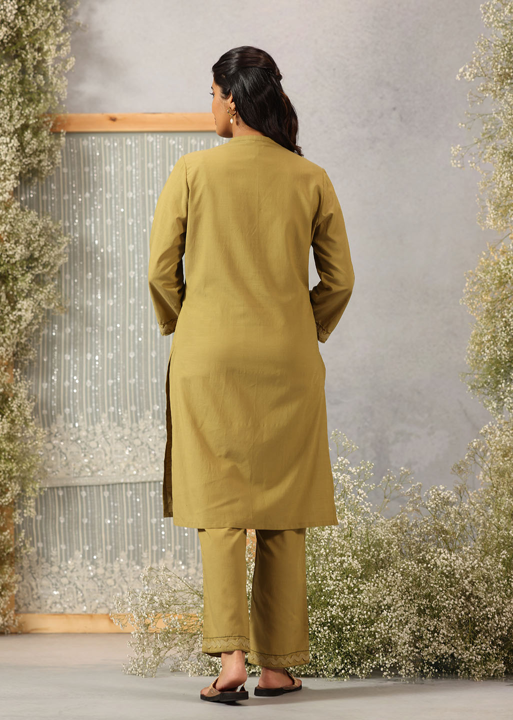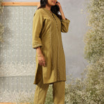 Rehmat Olive Monochrome Cotton Blend Mandarin Collar Straight Mid Co-ord Set