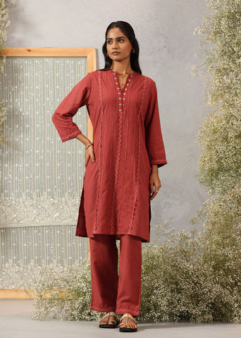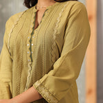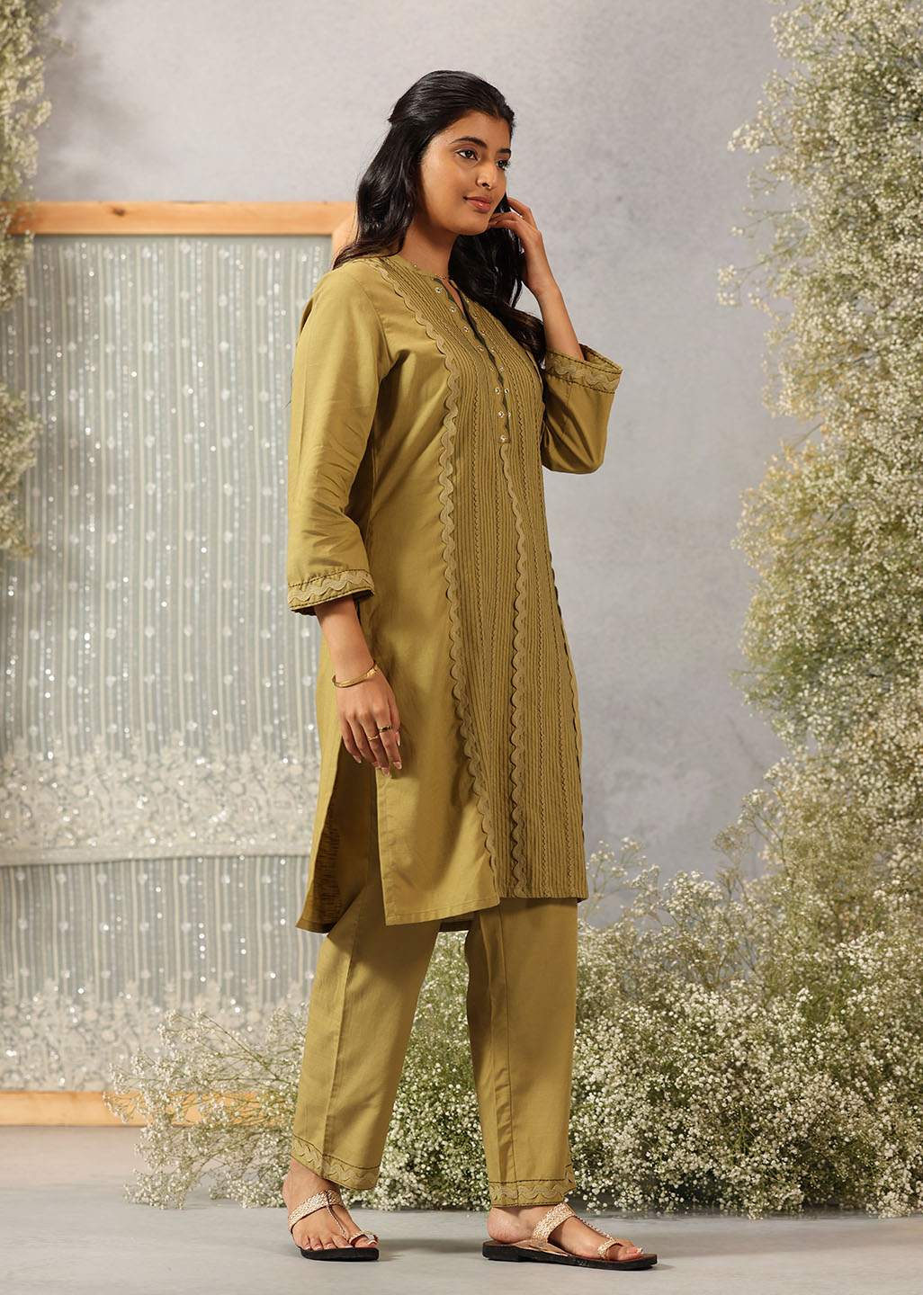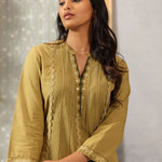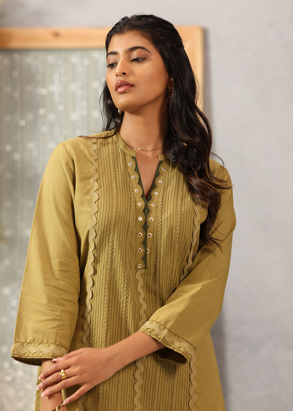 There’s a quiet charm about soft khaki—it’s warm, understated, and effortlessly chic. This co-ord set takes that colour and pairs it with easy tailoring and delicate details, giving you a look that works just as well for casual lunches as it does for small festive get-togethers. The mirrorwork on the neckline adds just the right amount of sparkle, while the cotton slub fabric keeps it light and breathable.