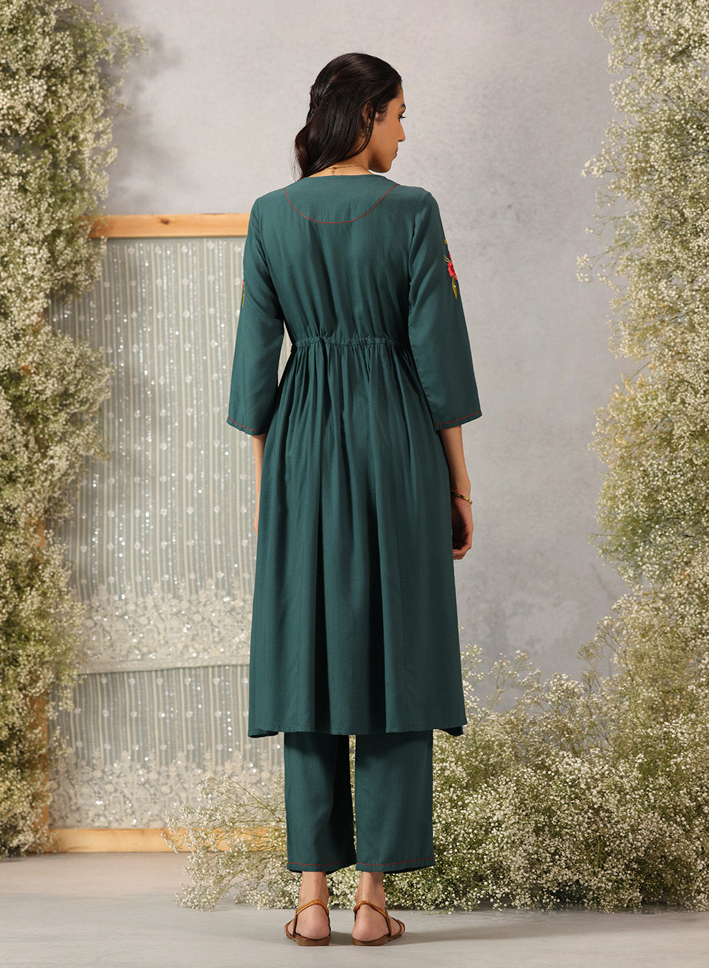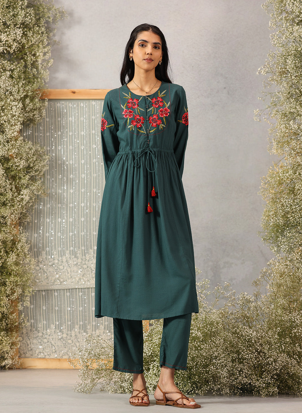 Lush, fluid, and quietly festive — this emerald Co-ord Set brings together the richness of tradition and the ease of modern grace. The flared kurta, crafted from breathable rayon slub, features a round neckline with contrasting silk threadwork and delicate shimmer accents on the yoke and sleeves. The straight pants, detailed with contrast stitch lines at the hem, complete the look.