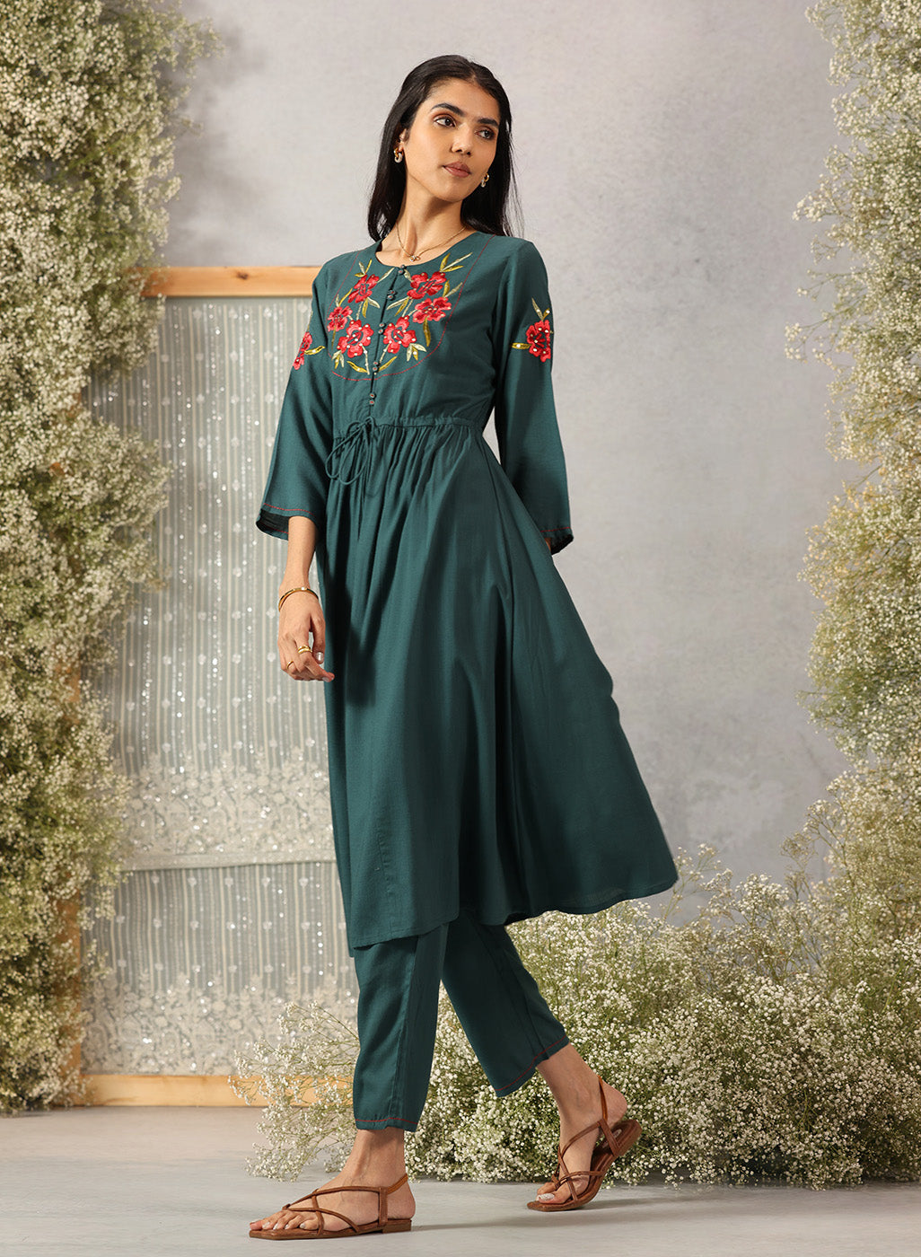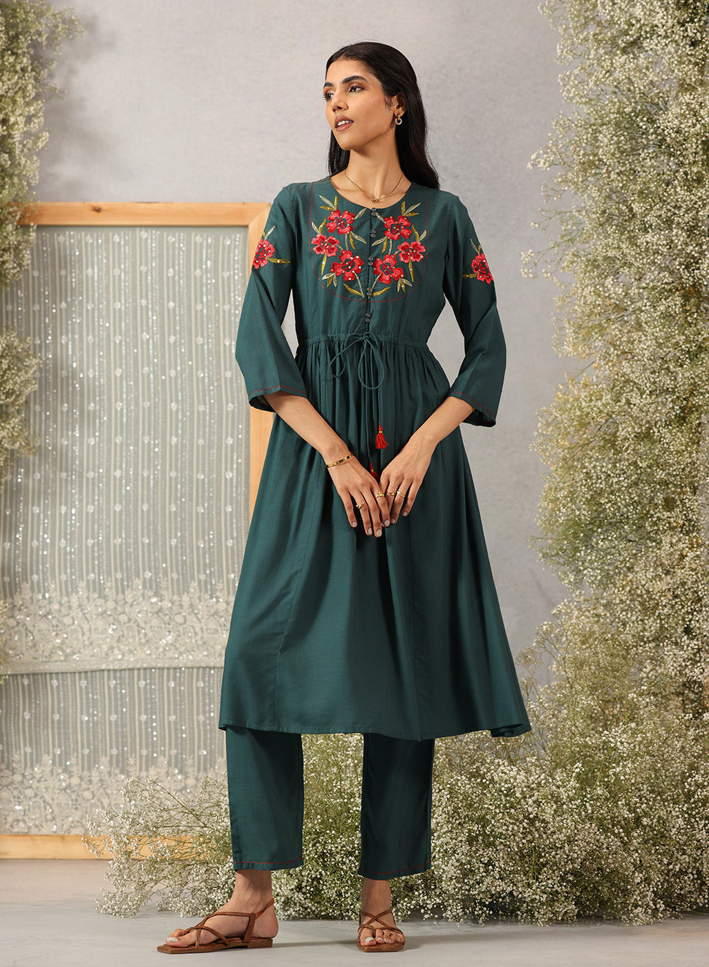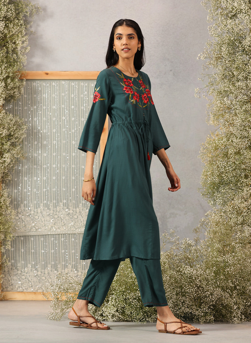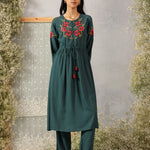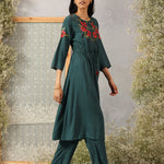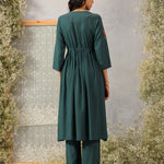 Ronaq Emerald Green Embroidered Rayon Slub Long Co-ord Set for Women