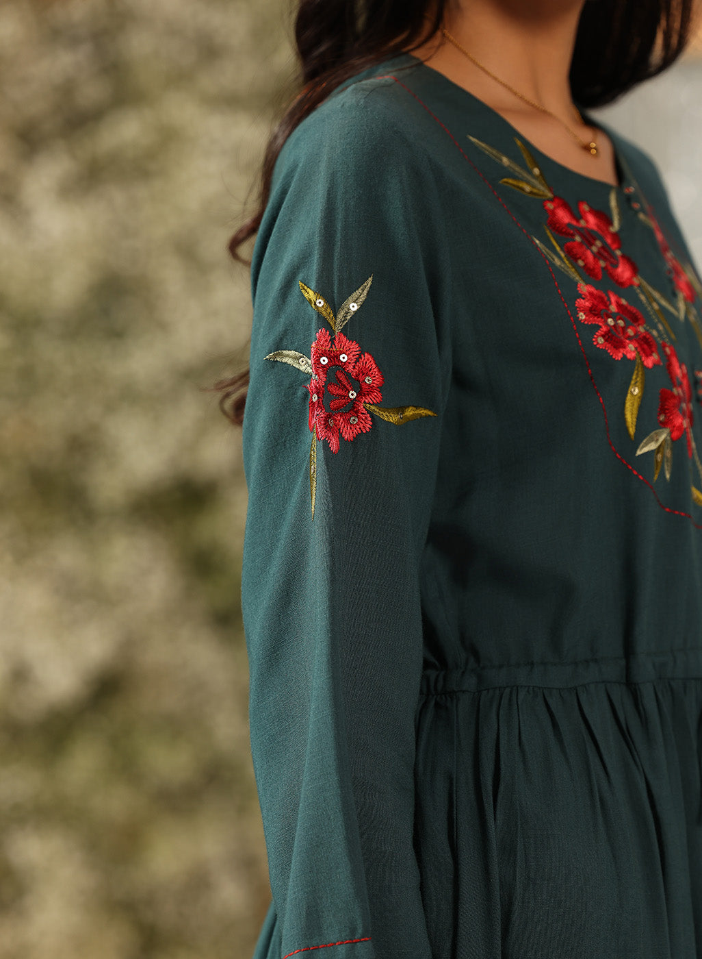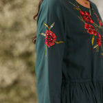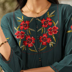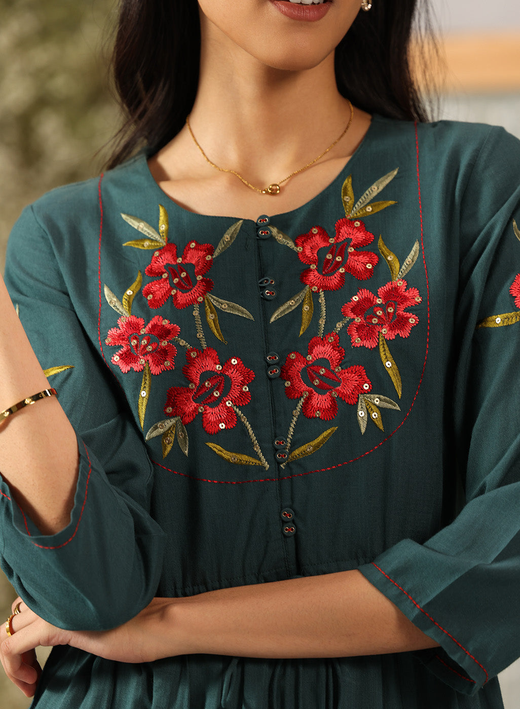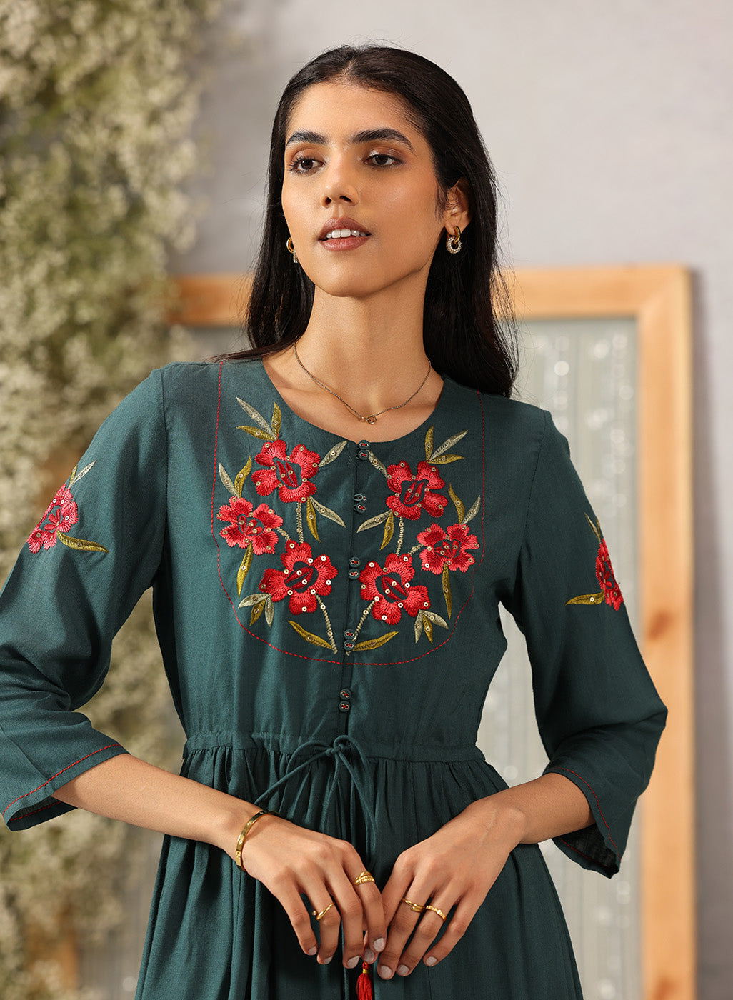 Ronaq Emerald Green Embroidered Rayon Slub Long Co-ord Set for Women