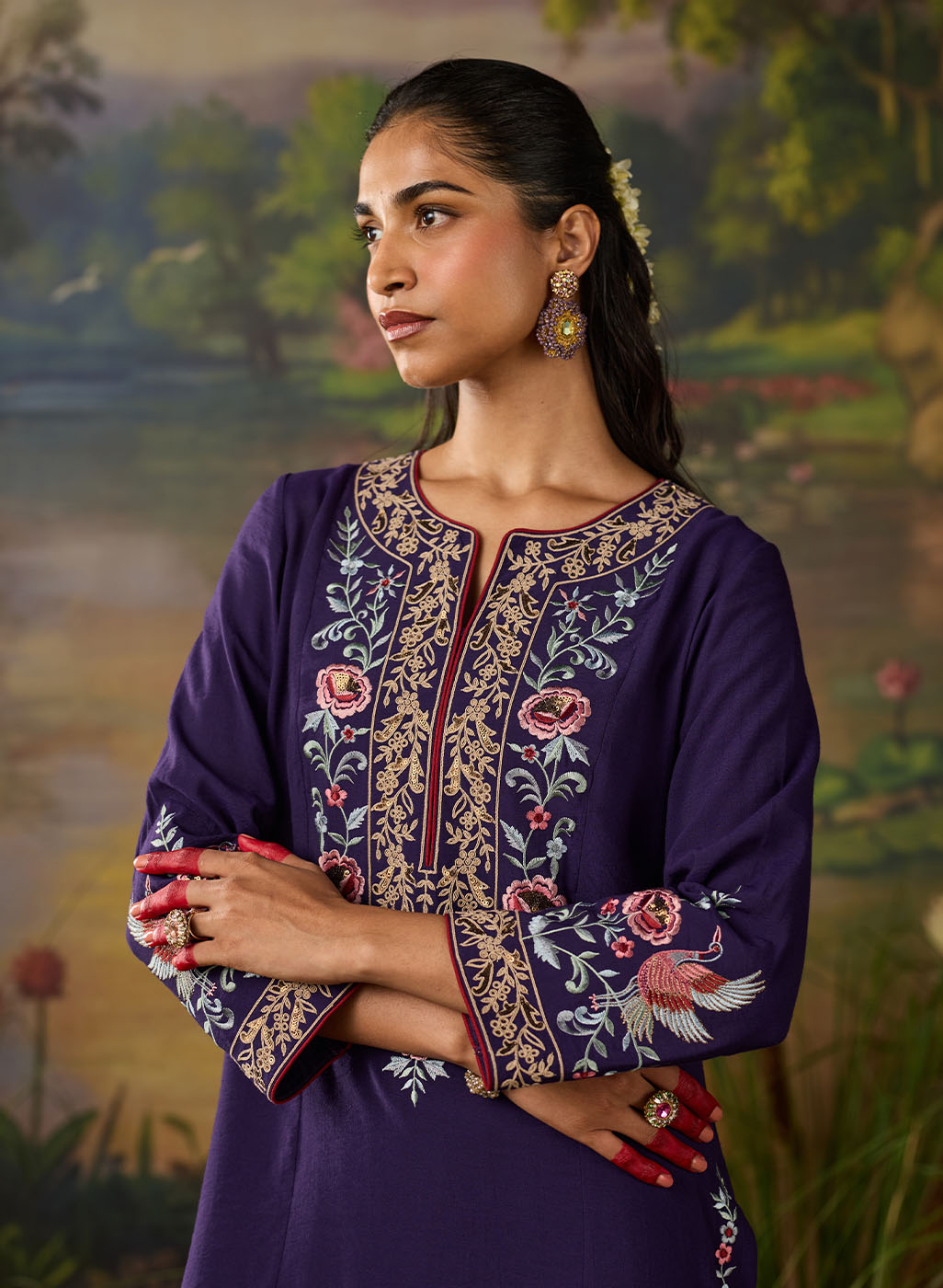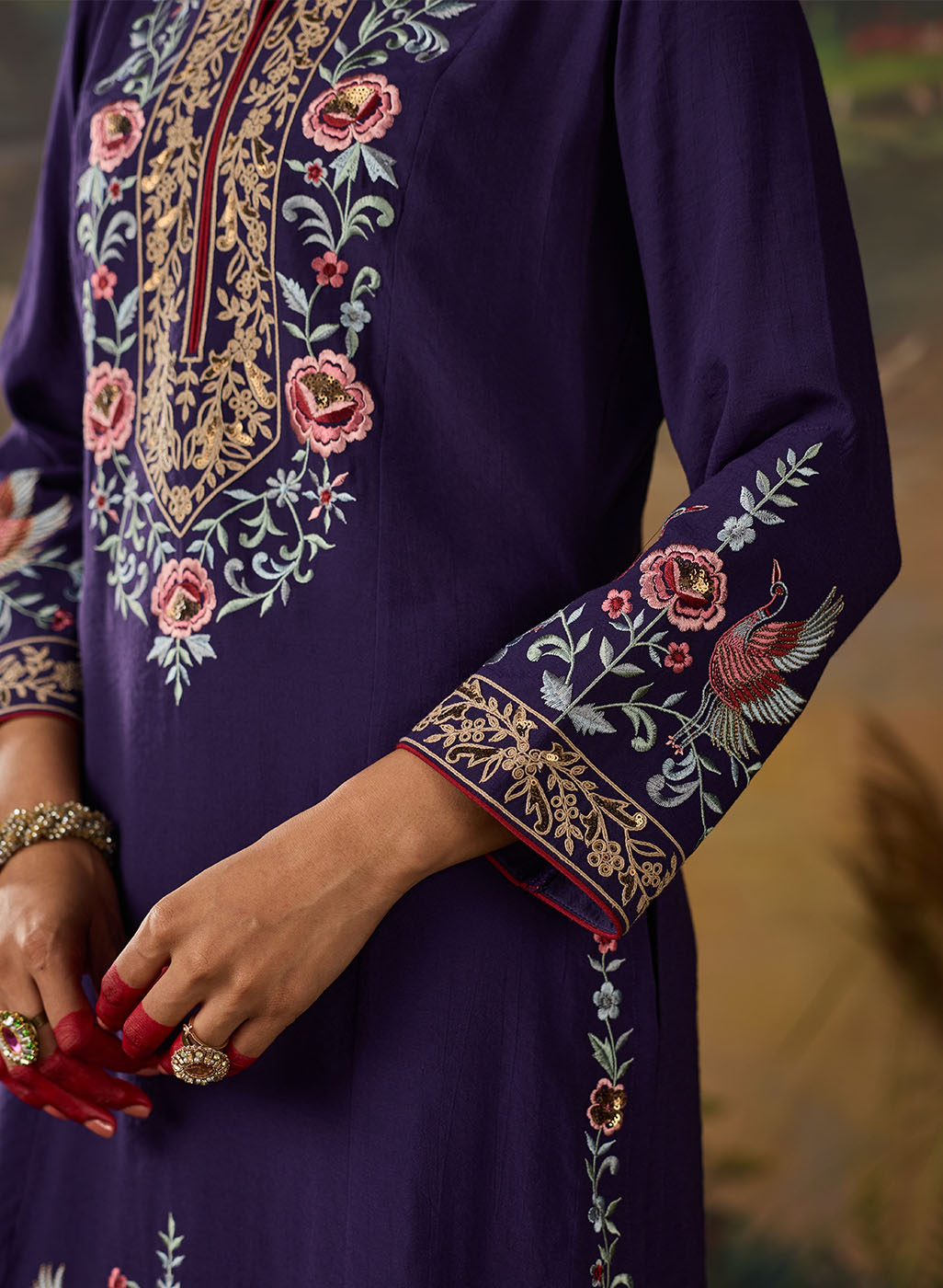 A striking bright purple co-ord set that blends festive vibrance with delicate detailing. The straight kurta is tailored in a soft, breathable fabric and adorned with Resham embroidery, accentiated with sequins, and zari. A notched neckline with contrast piping adds definition, while carefully placed embroidery on the sleeves, side slit, and back yoke lends it a statement edge. The look is completed with solid sharara bottoms finished with contrasting red piping. The flared silhouette makes this set perfect for celebratory evenings.
