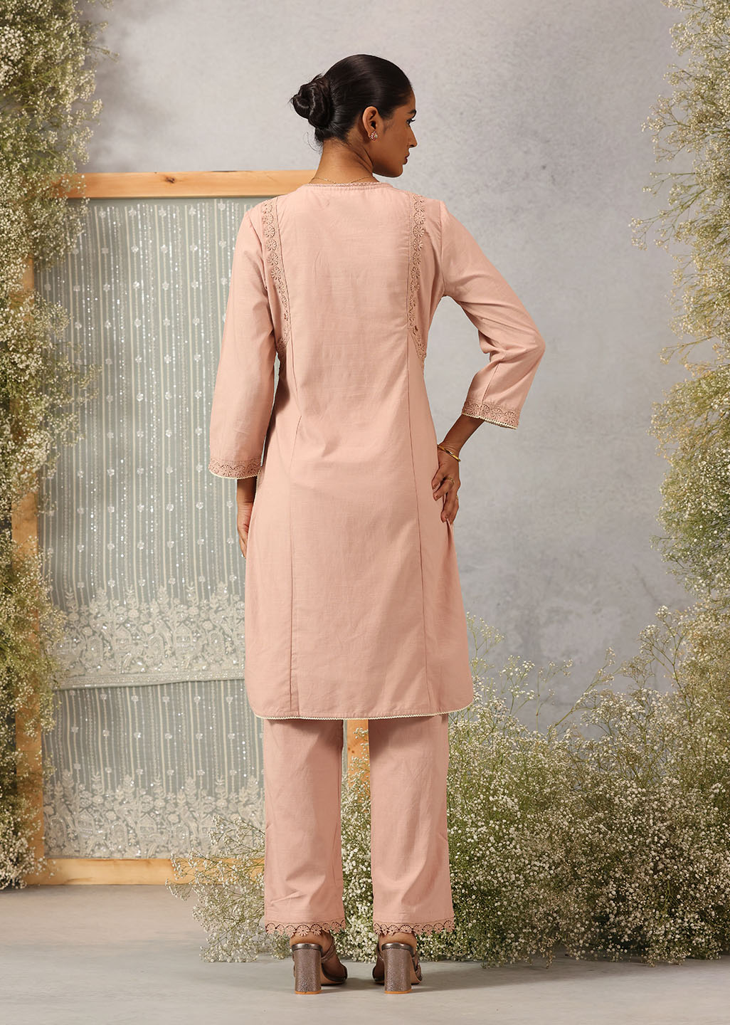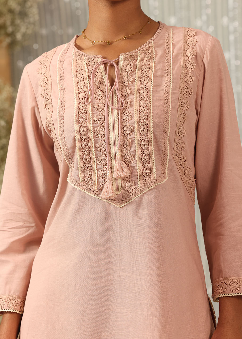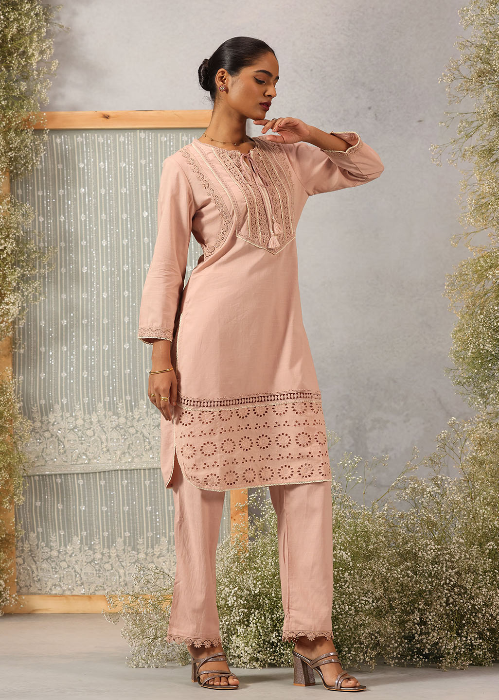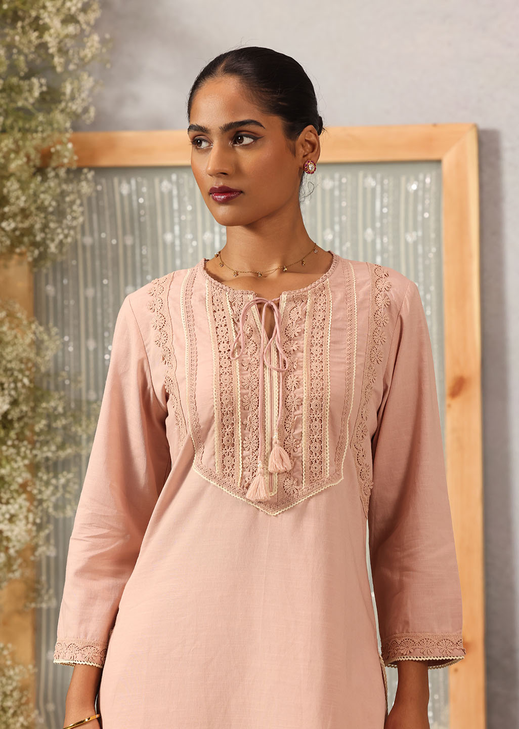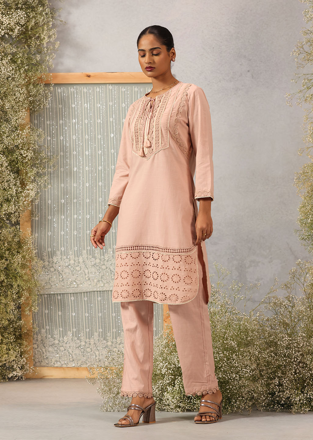 This Solid Peach Textured Kurta set is sure to turn heads. Crafted from a textured slub fabric and detailed with delicate schiffli and lace work, it is the perfect addition to your wardrobe. Look stylish and feel comfortable wherever you go.