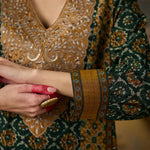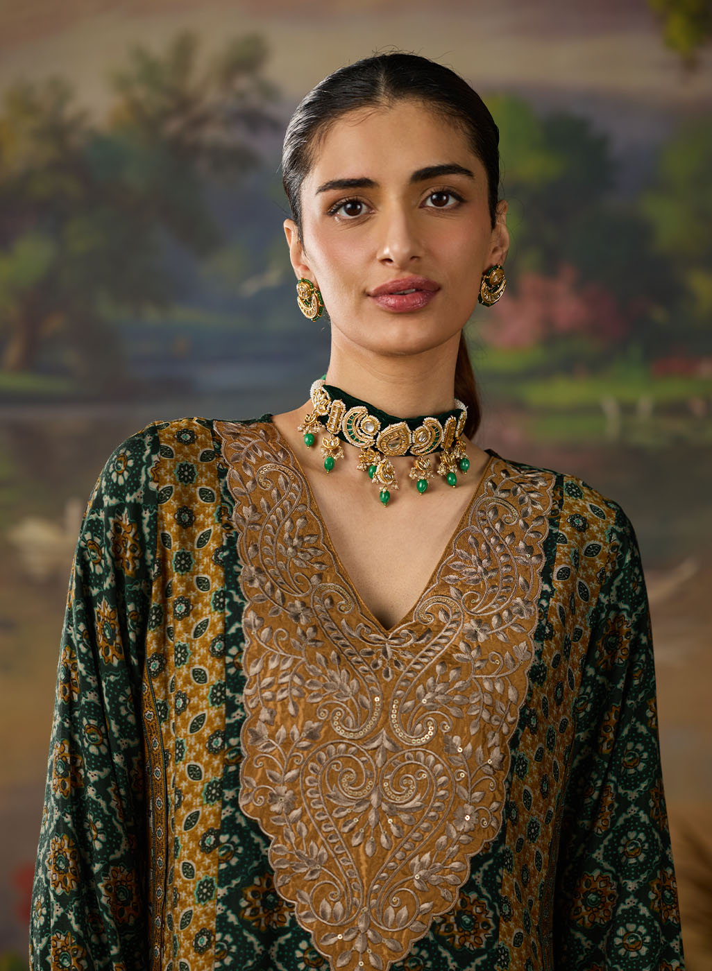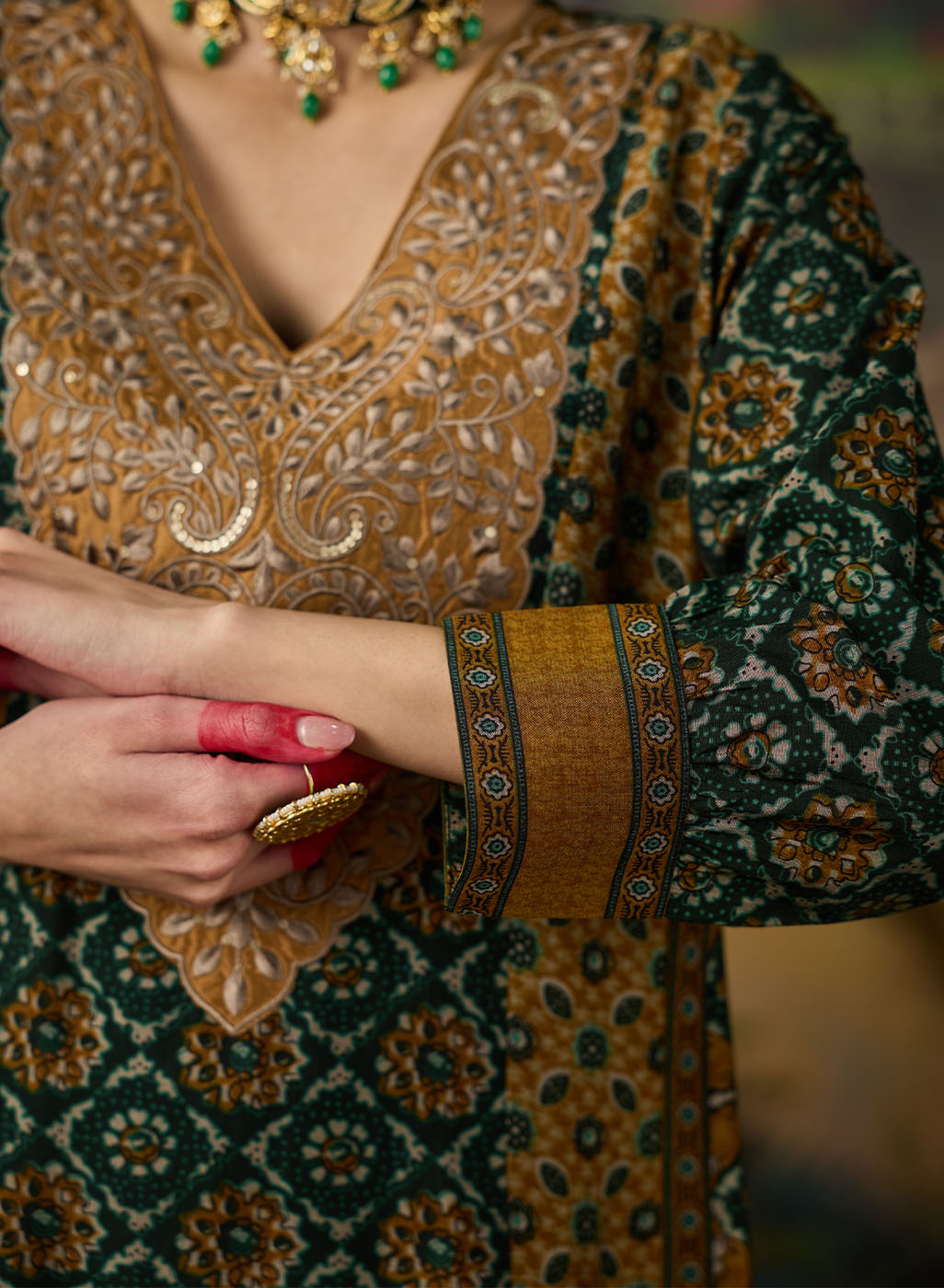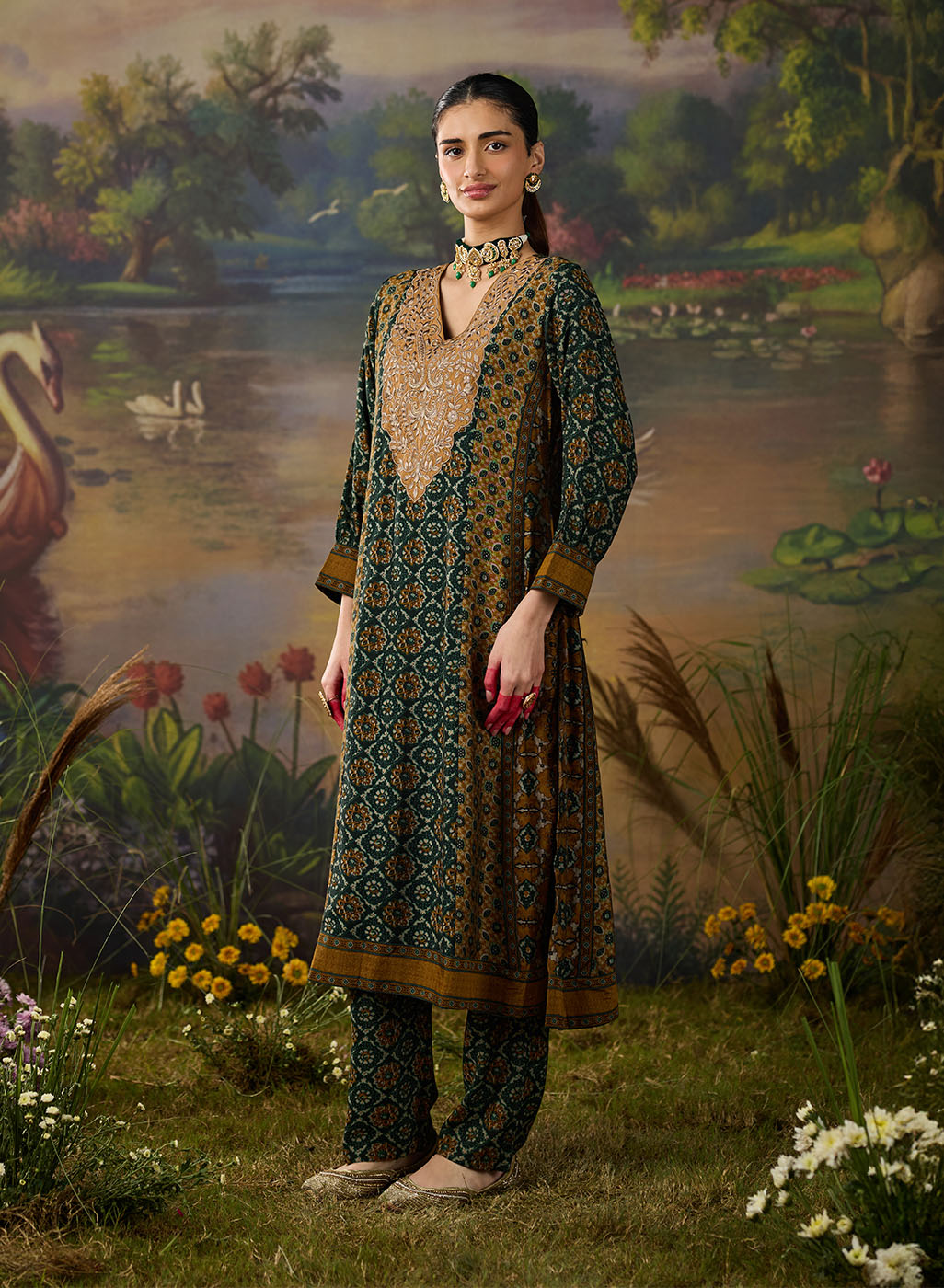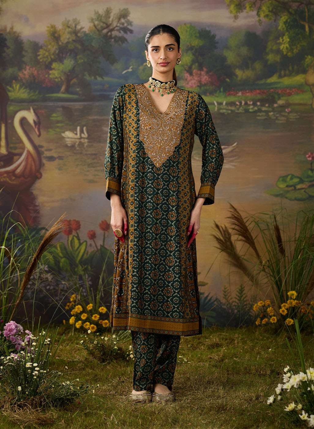 A vibrant mix of tradition and comfort, this green printed kurta set is made for days when you want to look effortlessly put together. The traditional viscose kurta feels light and breathable, while the striking printed panels bring depth and character to the design. The V-neckline is highlighted with delicate resham thread embroidery and subtle sequin touches, adding just the right hint of festive sparkle. Paired with straight pants, this straight kurta set perfectly balances contemporary chic with timeless ethnic appeal.