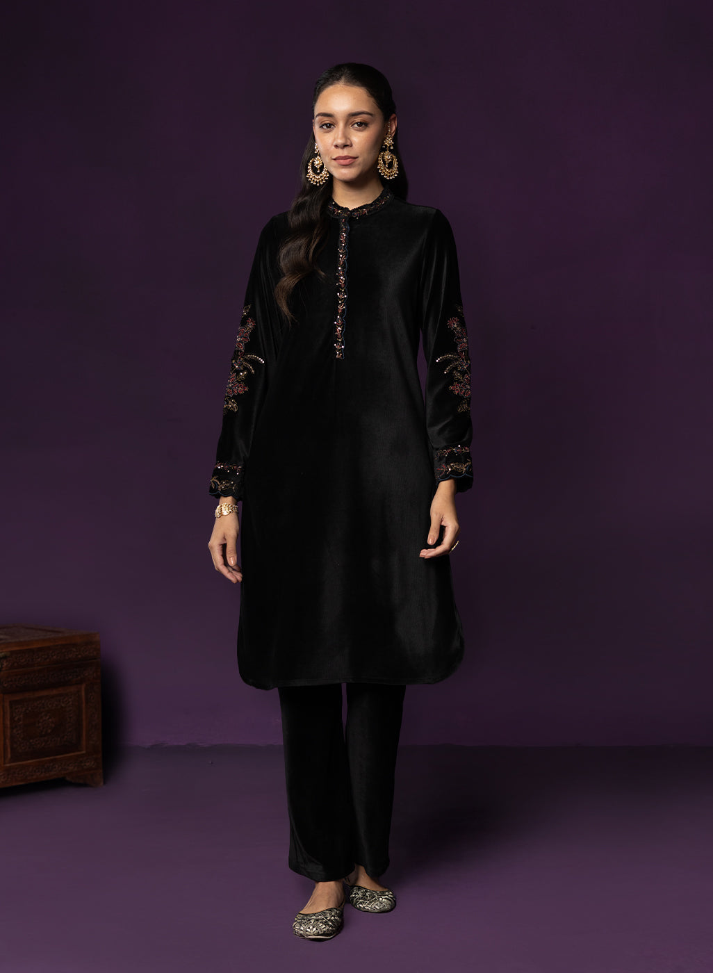 Charcoal Black Velvet Kurta Set With Heavy Front Yoke Zari Embroidery