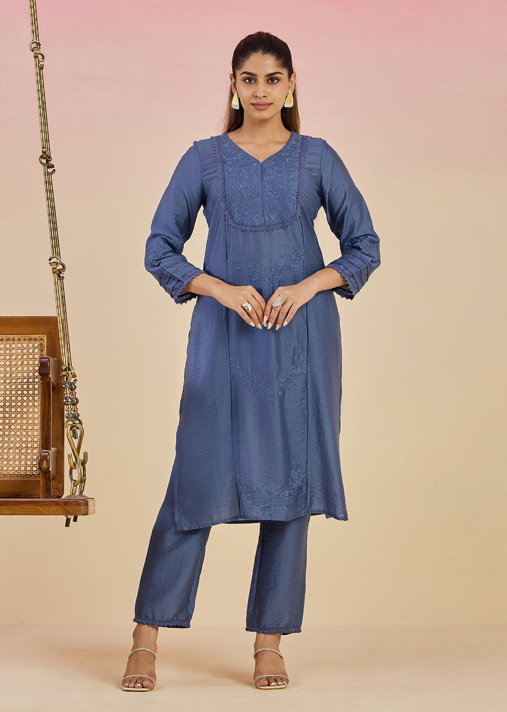 D.Teal Kurta Set With Intricate Embroidery & Front Slit