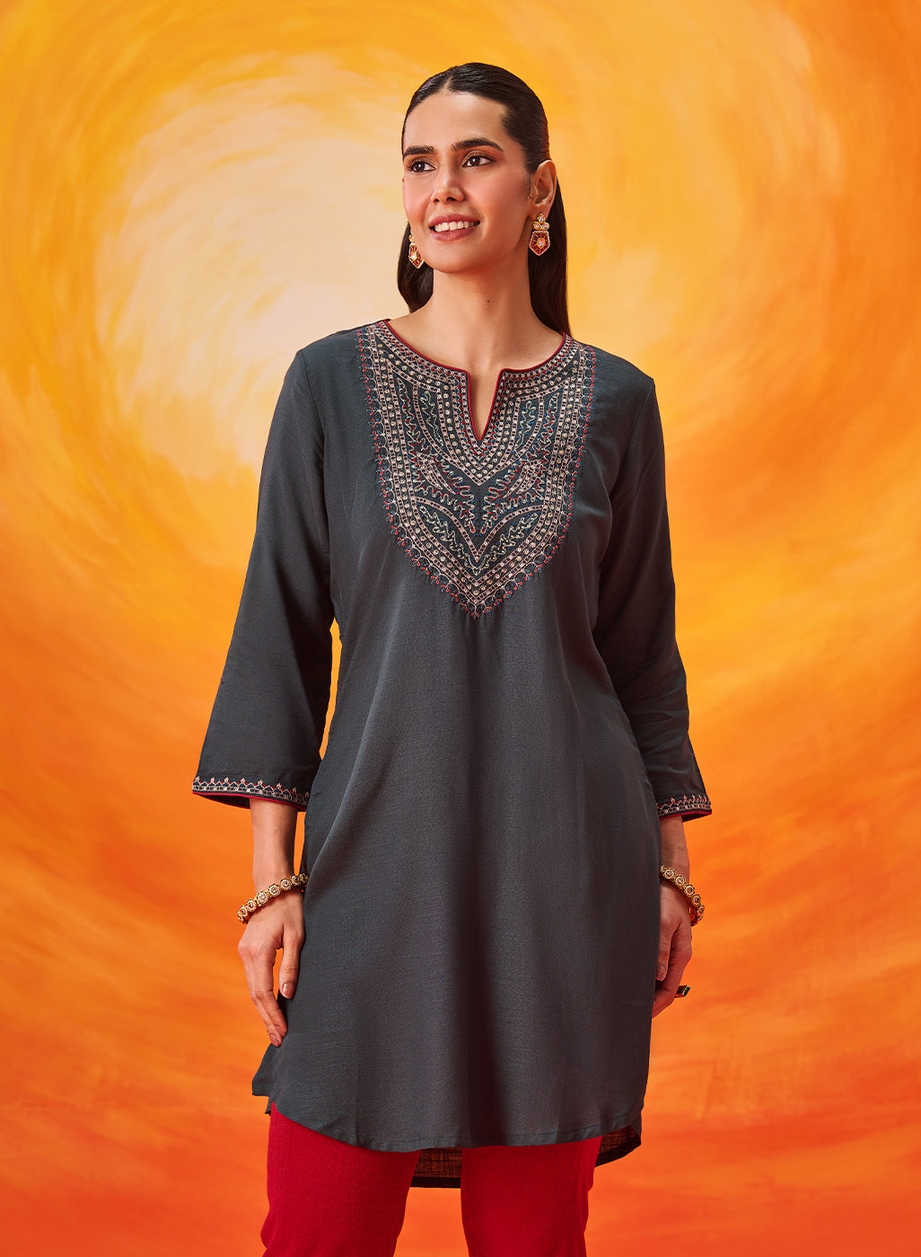 Grey Printed Viscose Chiffon Jacquard Tunic