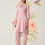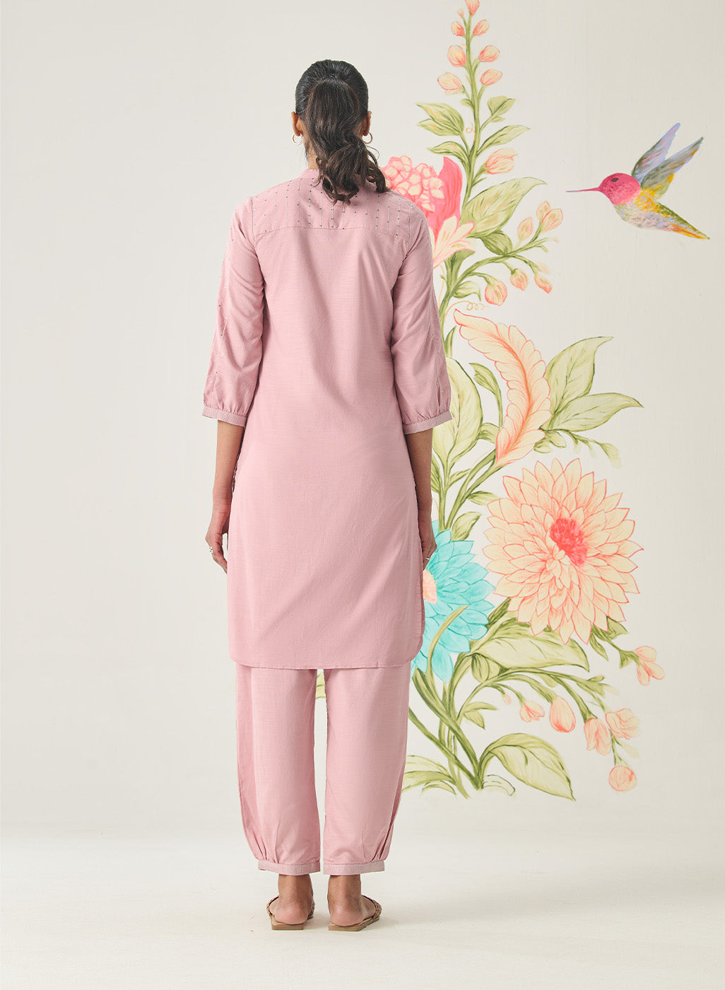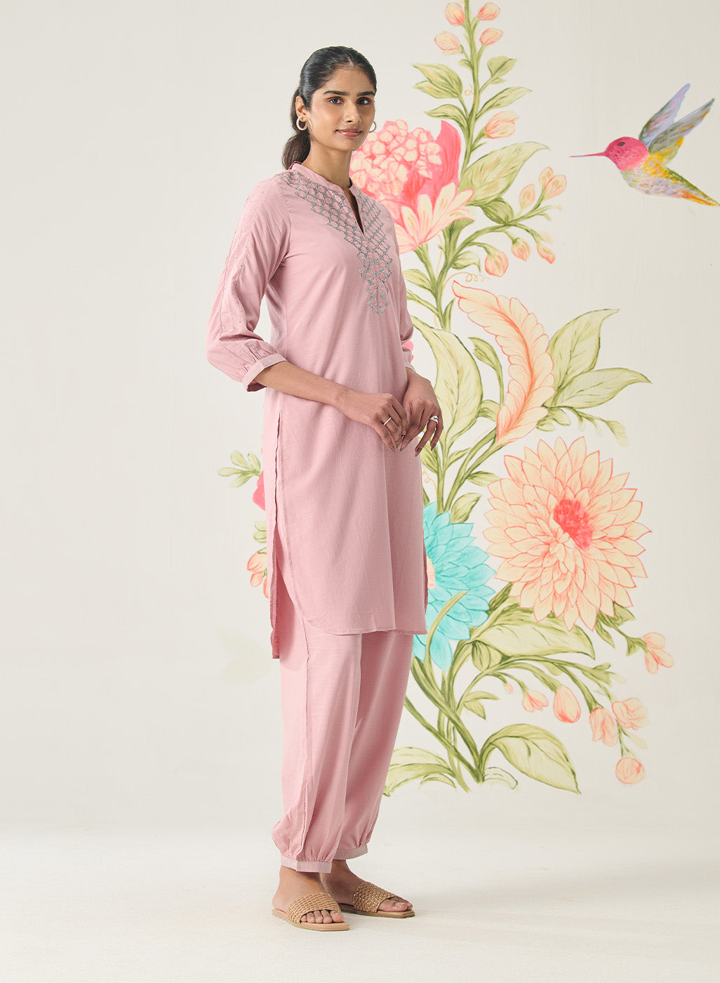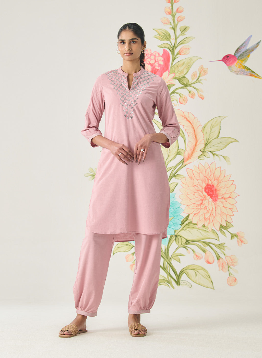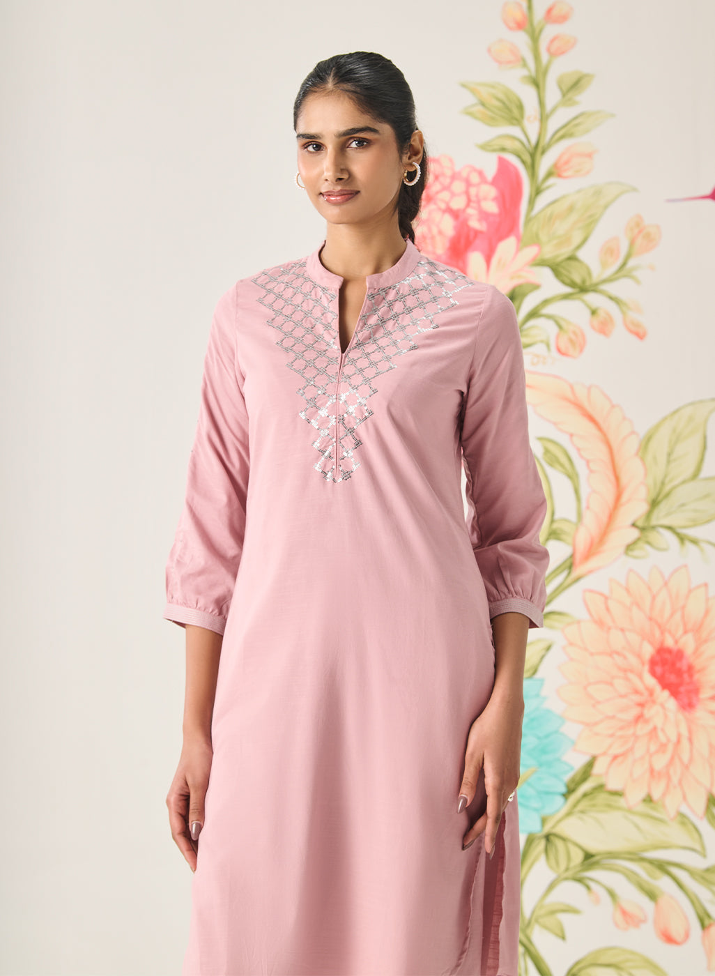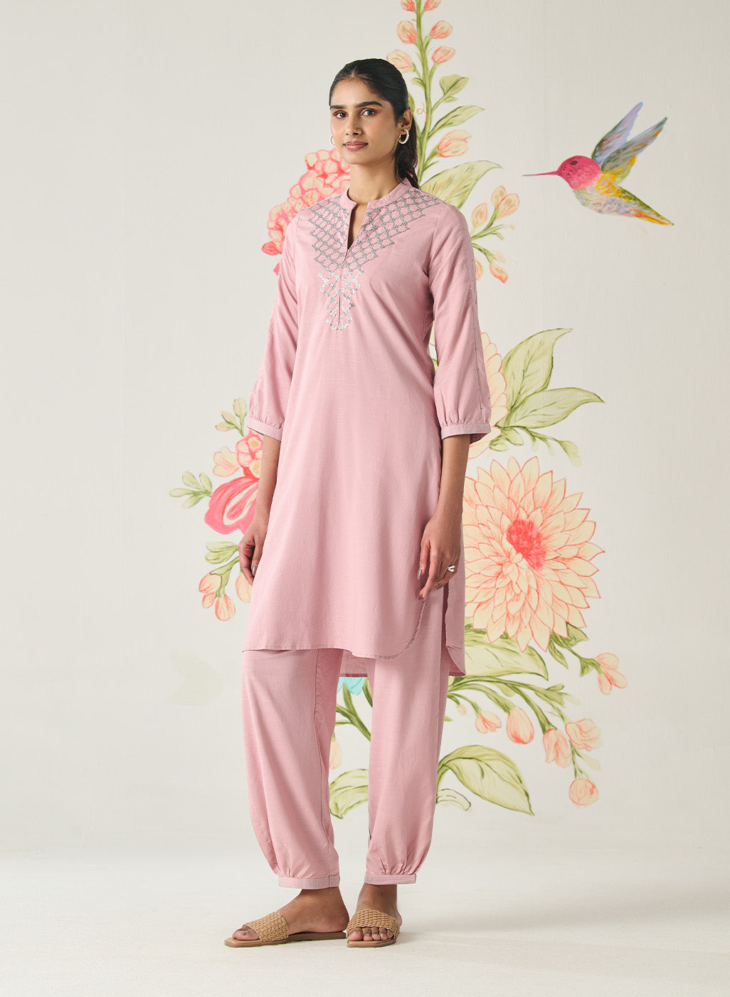 This pink kurta set brings together a graceful silhouette and delicate detailing, making it ideal for days when you want comfort with a touch of polish. The gentle sheen of sequin work adds just enough highlight without overpowering the look.