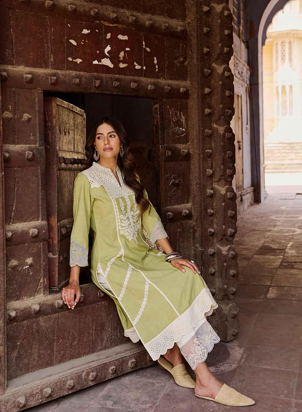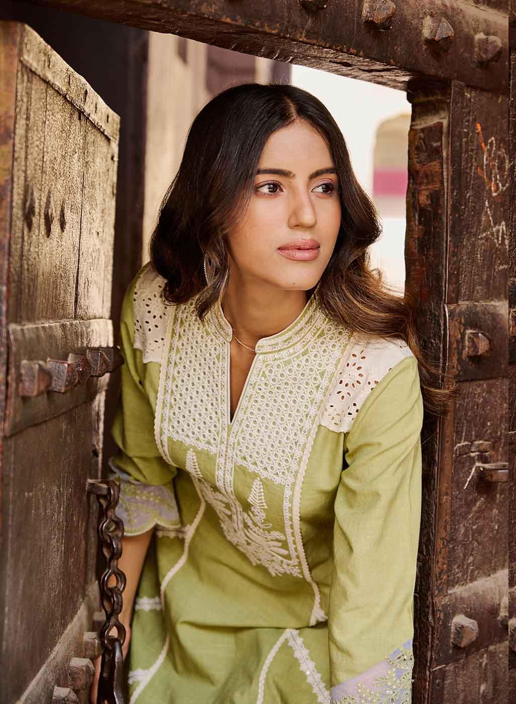 Olive Kurta Set With Intricate Embroidery & Front Slit - Lakshita