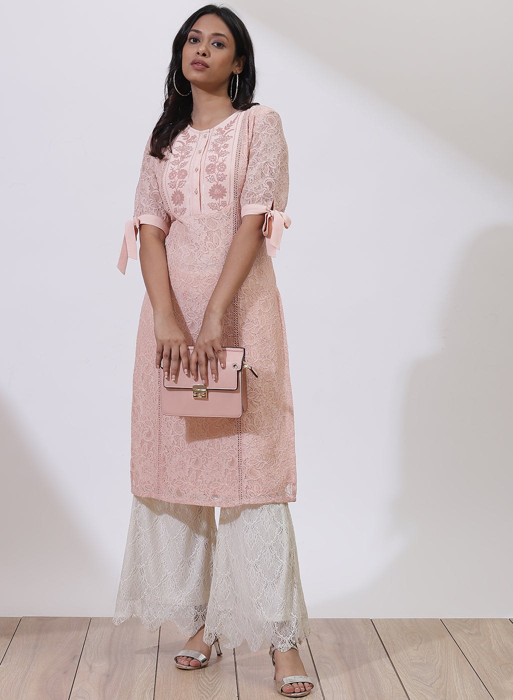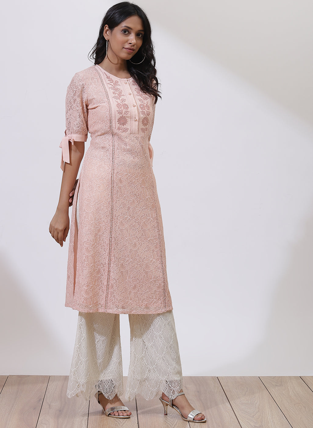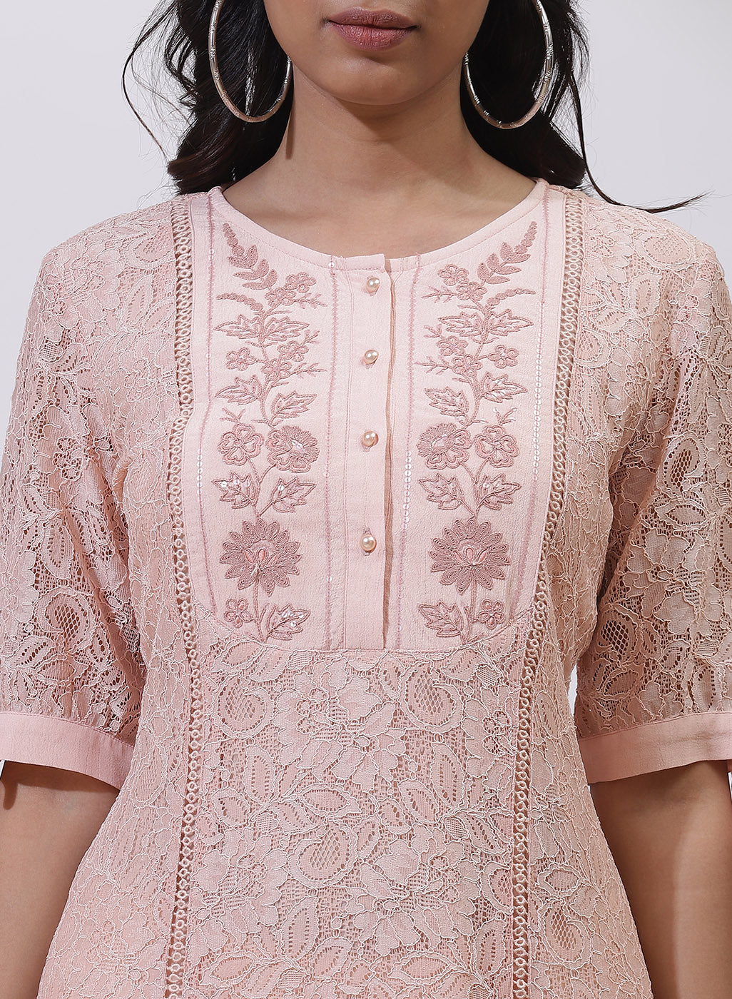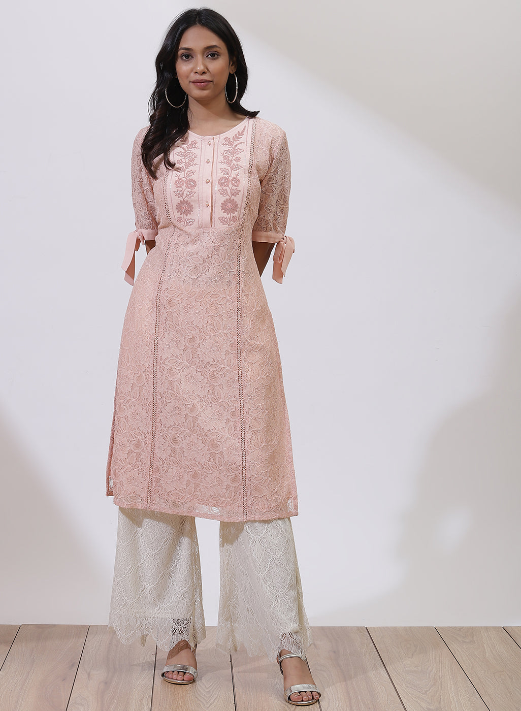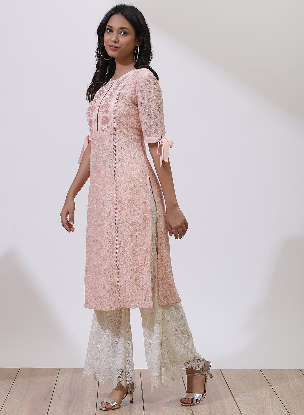 Pink Kurta for Women with Threadwork and Lace Detailing