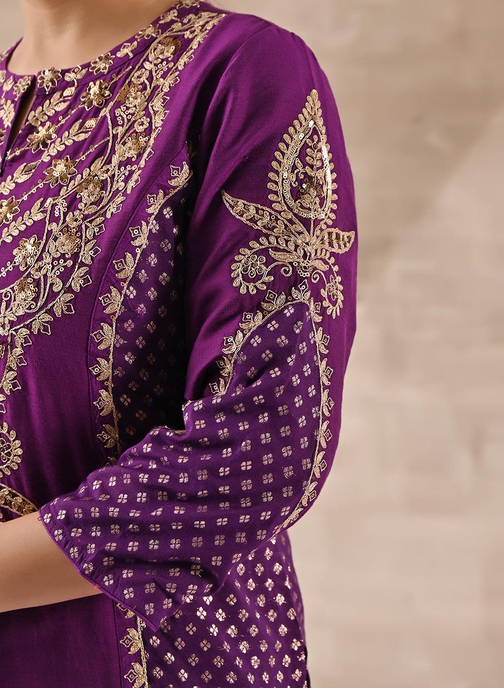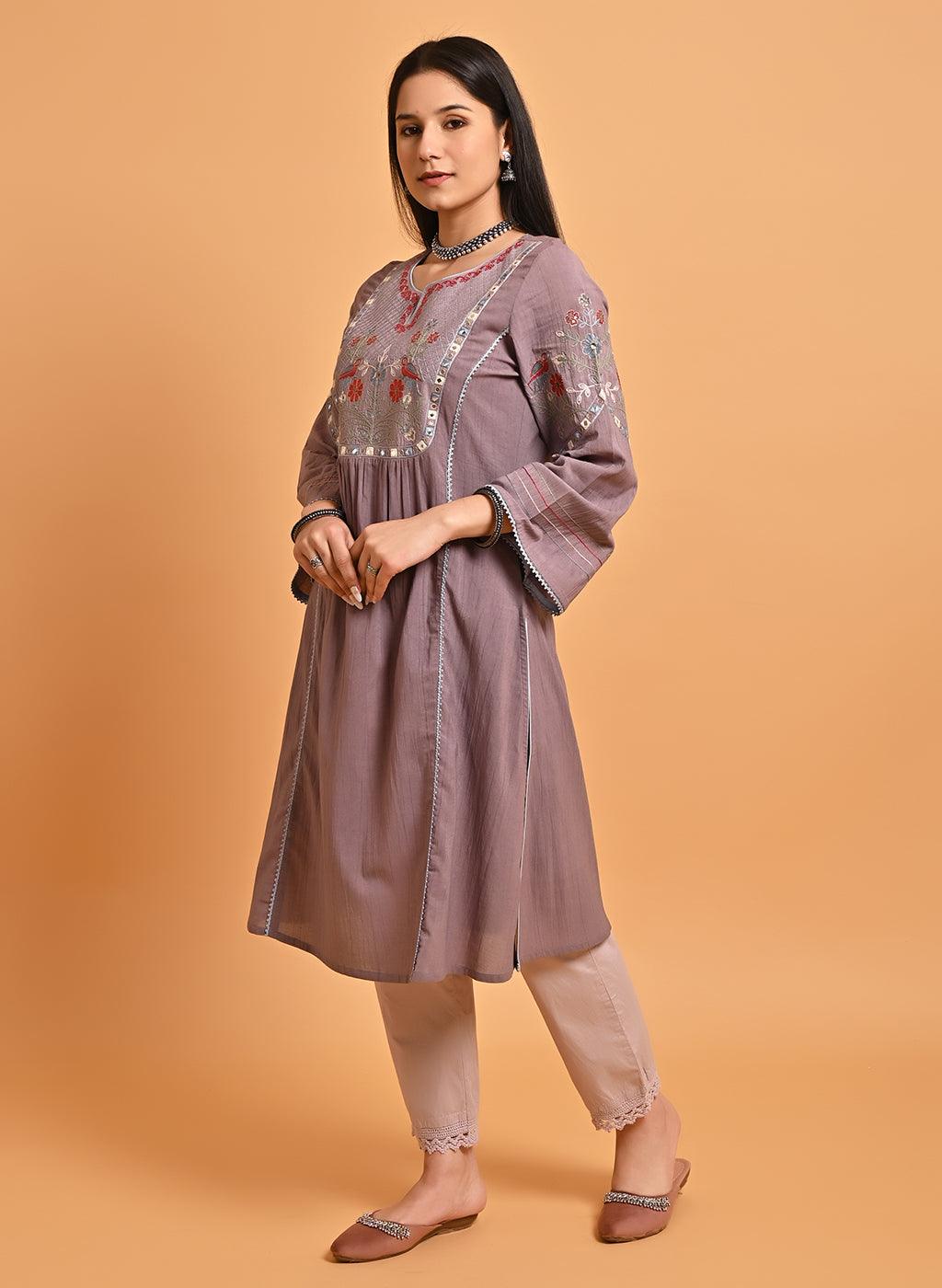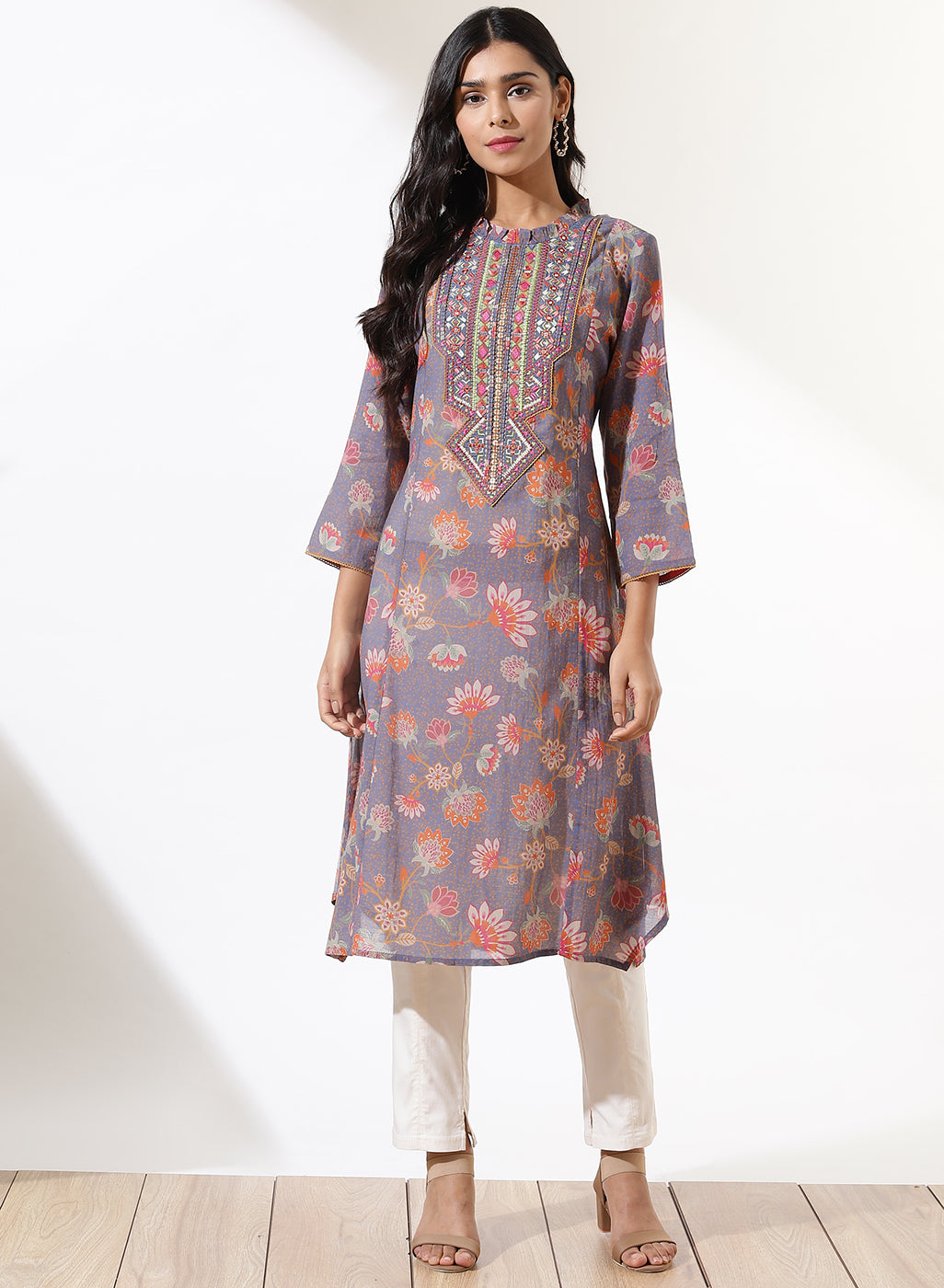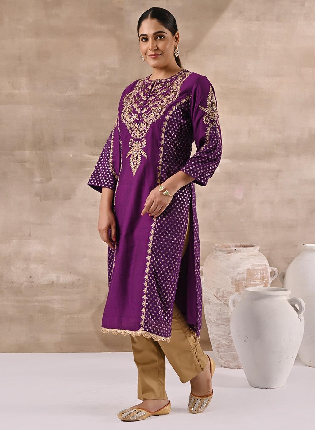 Purple Floral Print Dhaage Collection Kurta With Embroidery