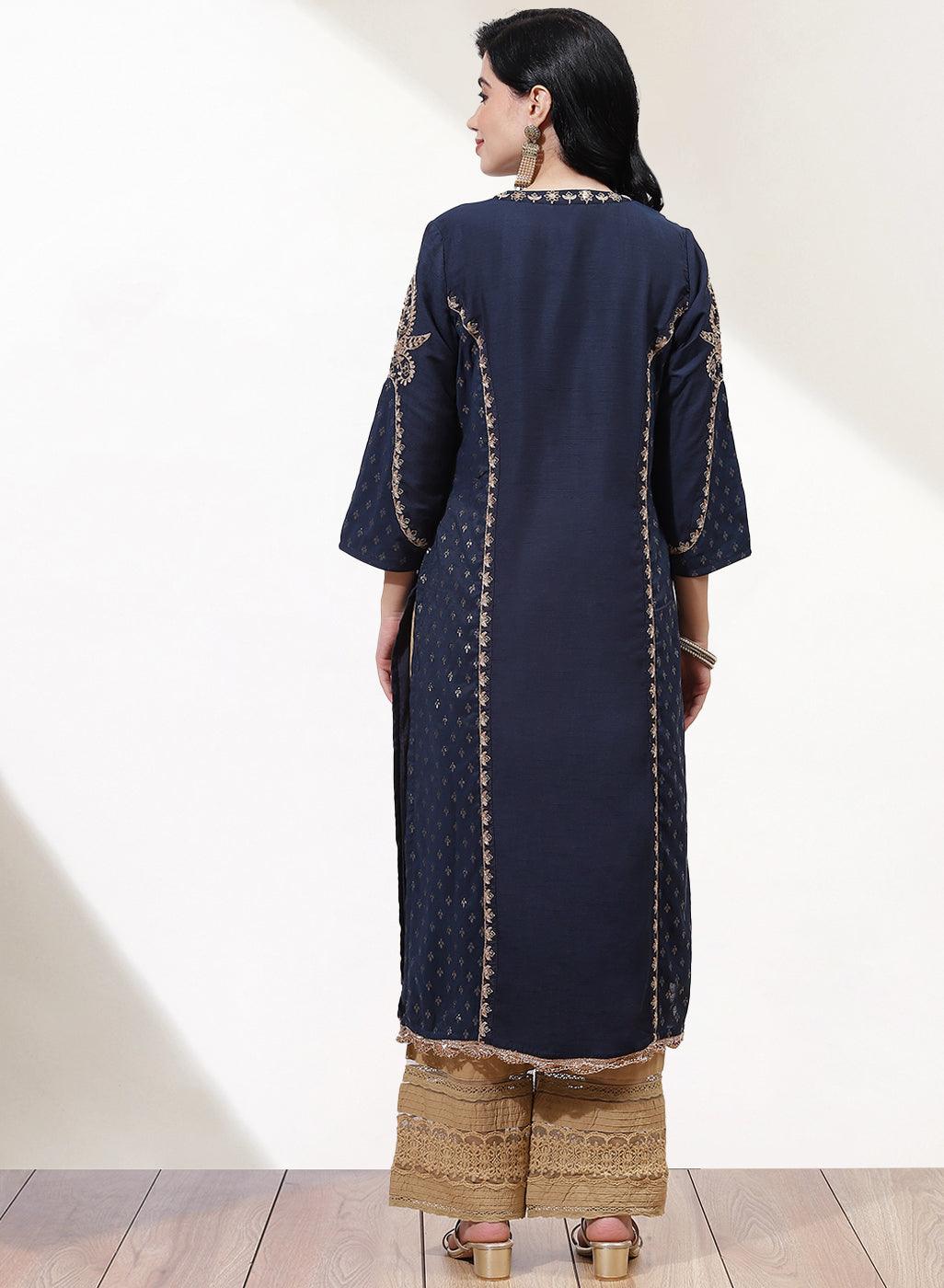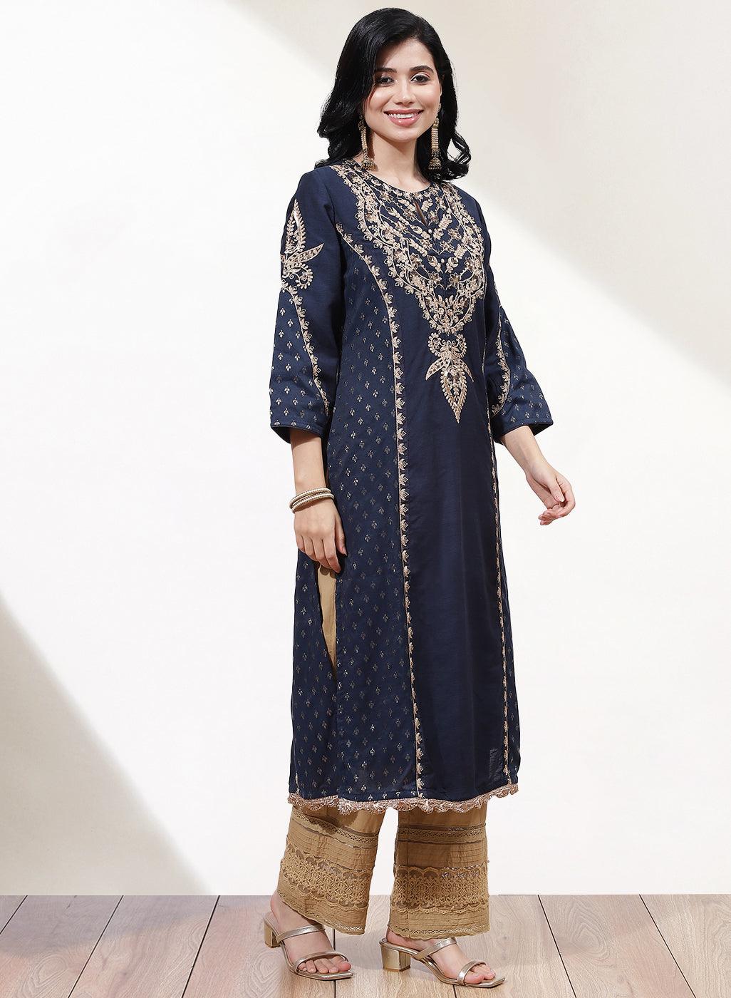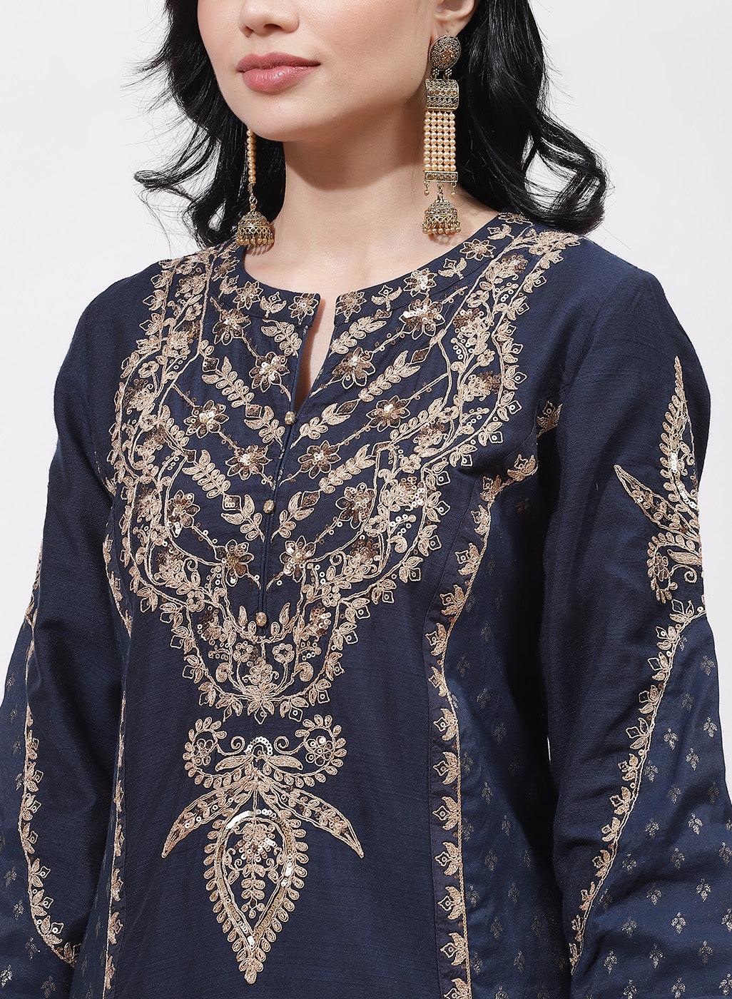 Navy Blue Printed Woollen Kurta Set for Women with Sequin Work