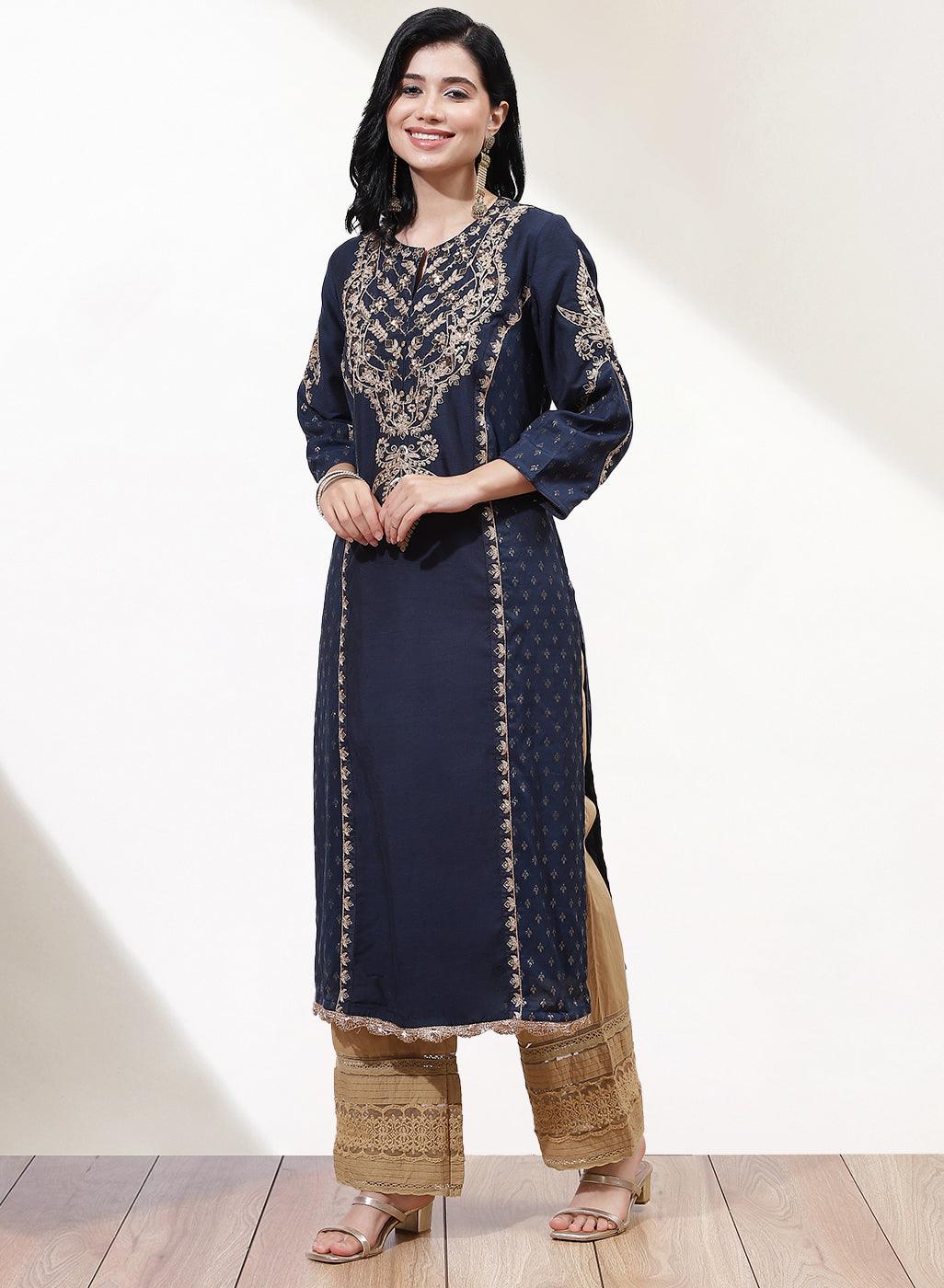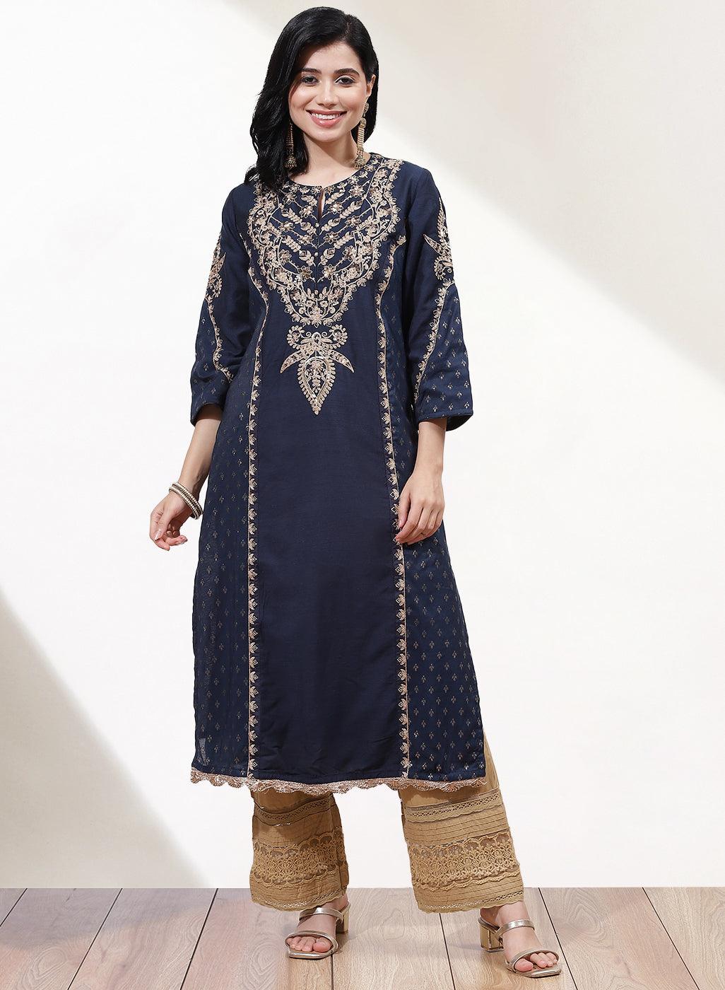 Elegant navy blue printed woollen kurta with sequin embellishments styled with straight trousers in minimal setup.