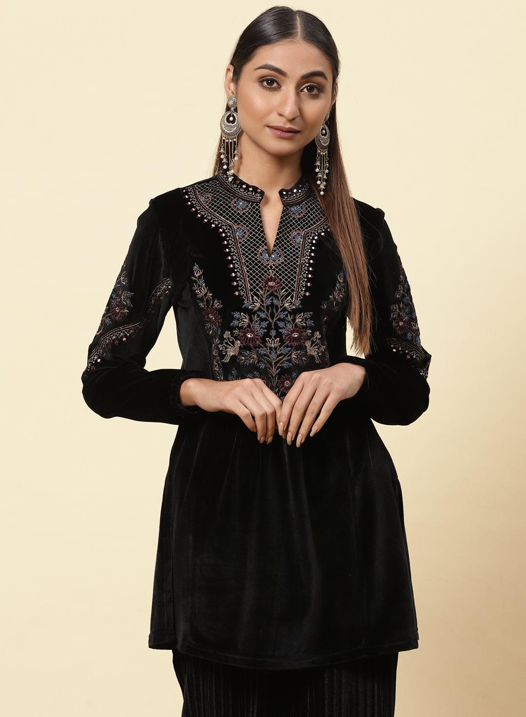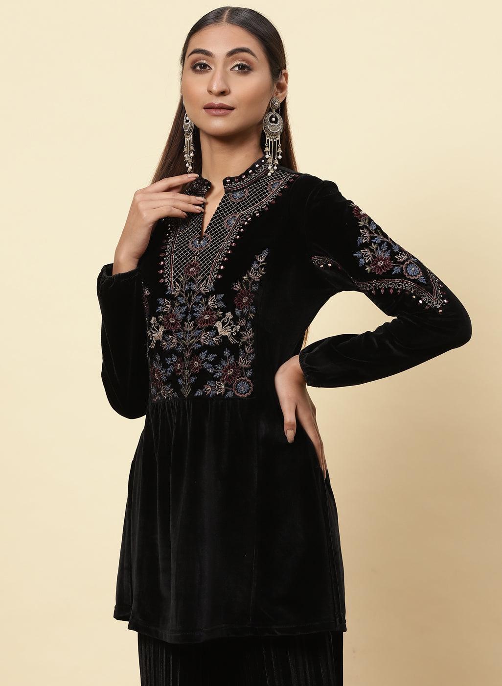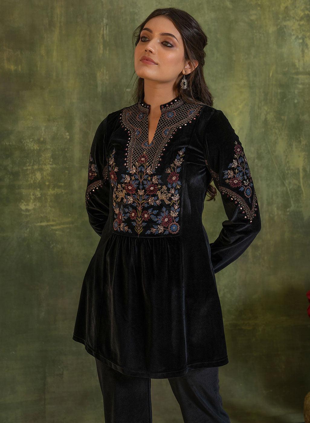 Girl poses with a black velvet kurti with coloured floral motifs, gold dori, sequin highlights, and a mandarin collar.
