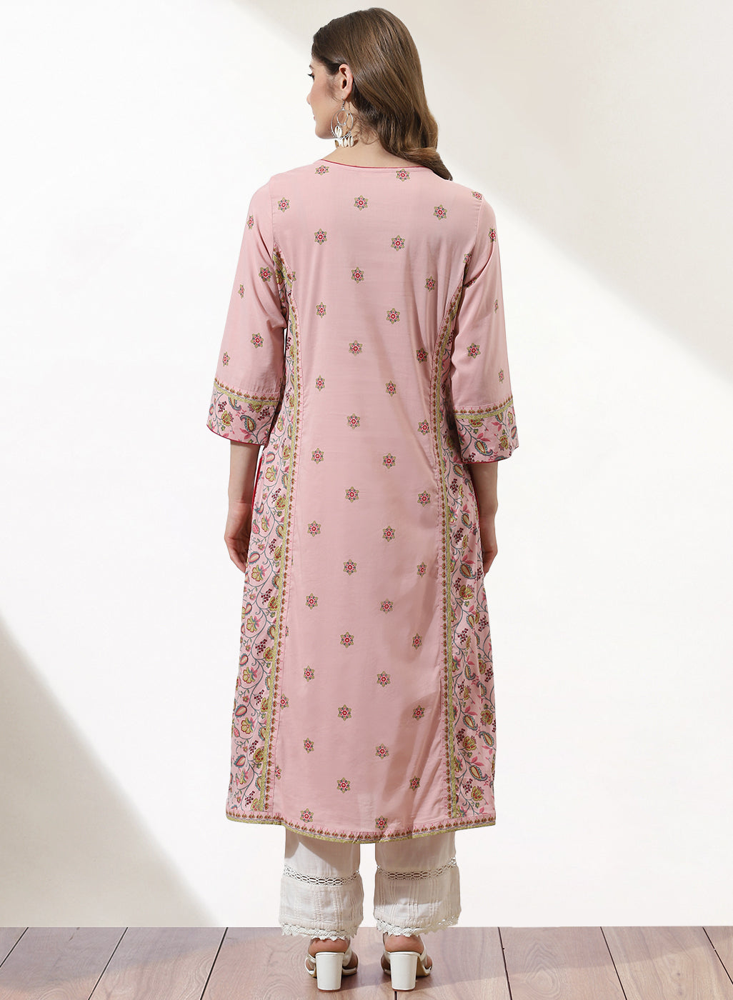Pink Floral Printed Loose Fit Kurta with Lace Inserts