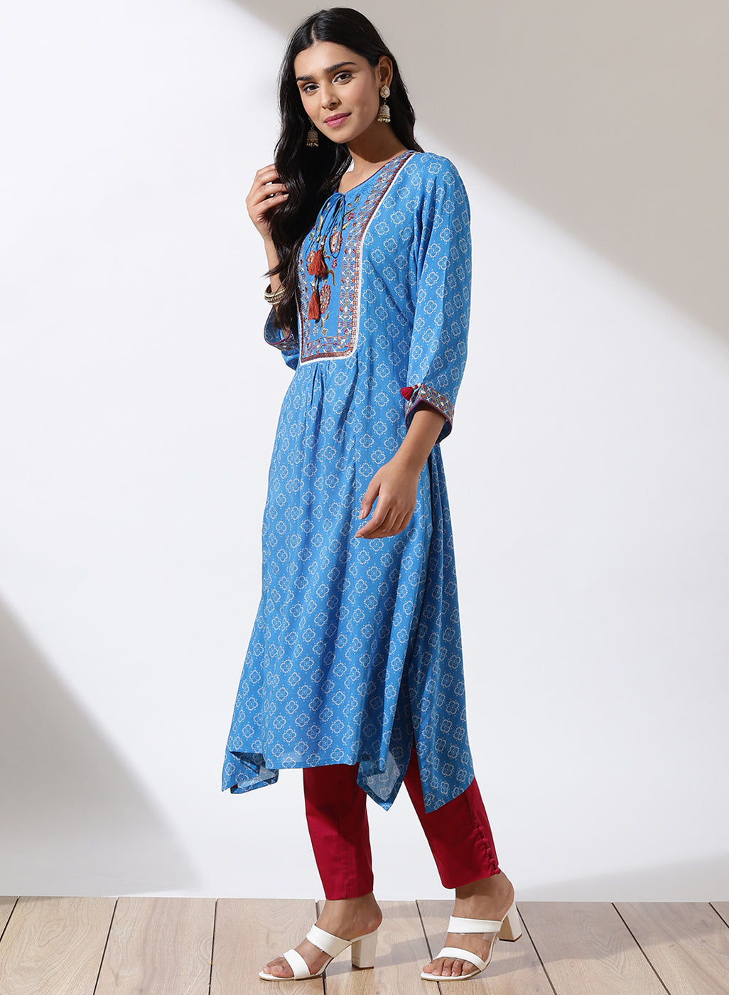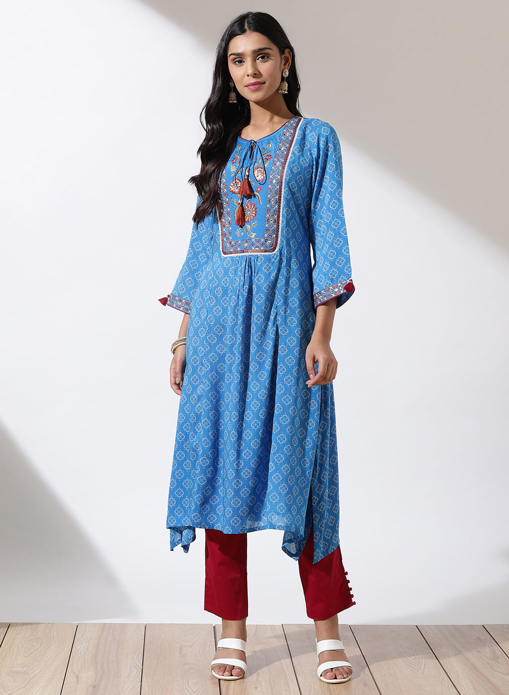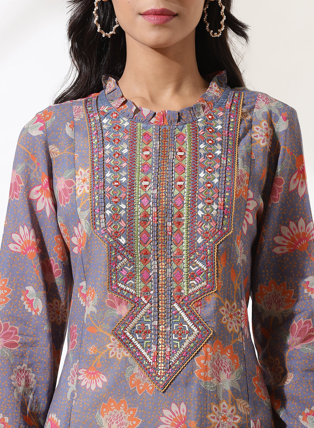 Spa Blue Floral Printed Loose Fit Kurta with Lace Inserts