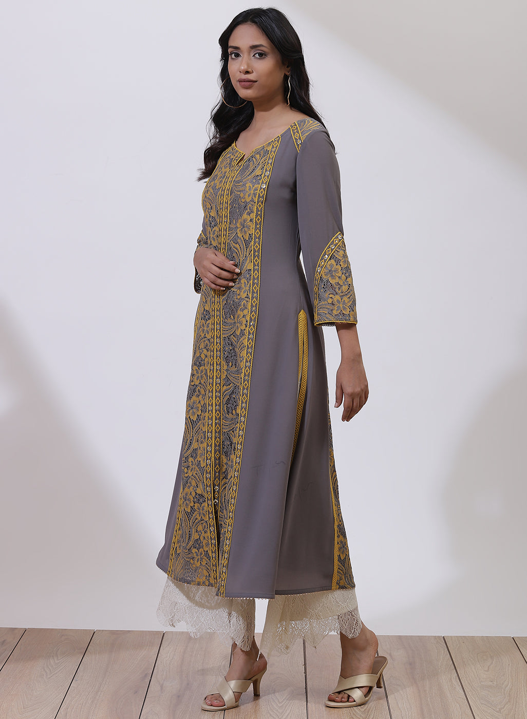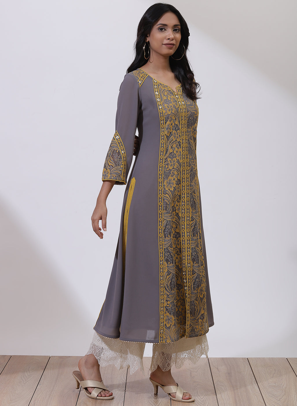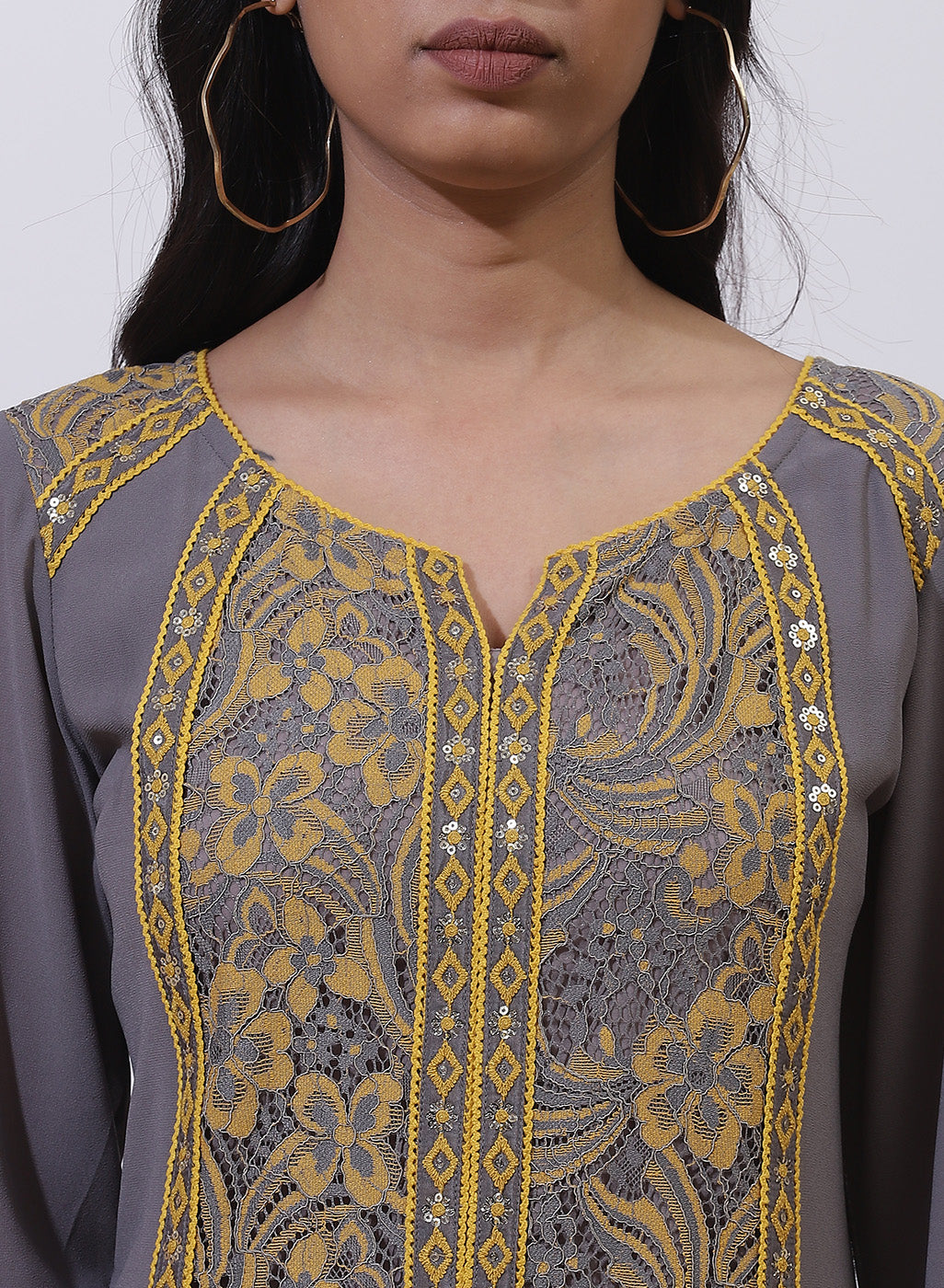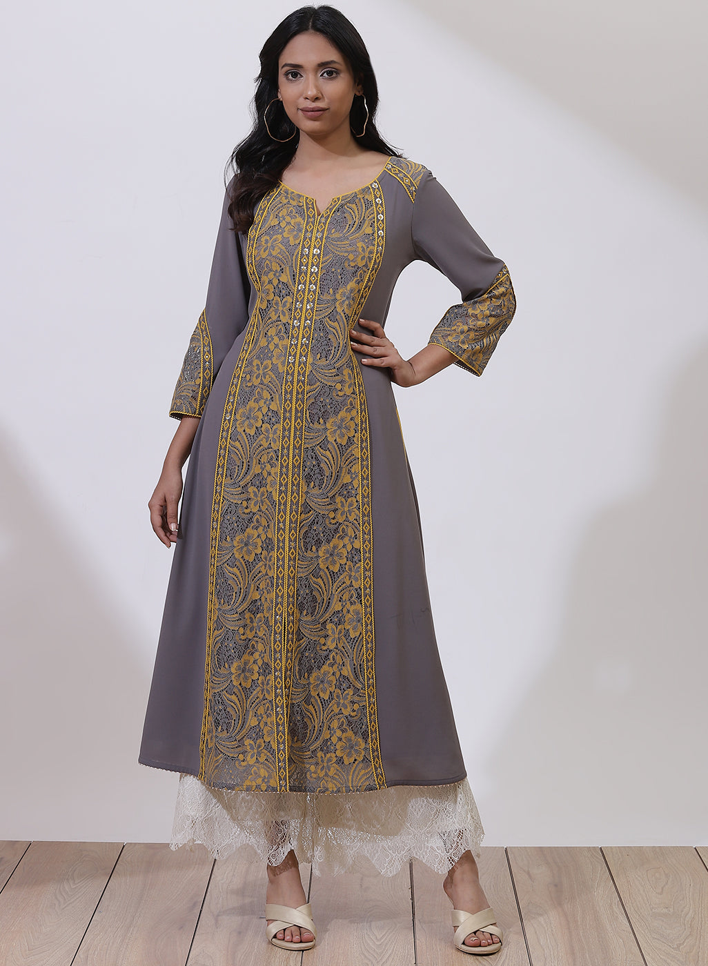 Golden Kurta for Women with Threadwork and Lace Detailing