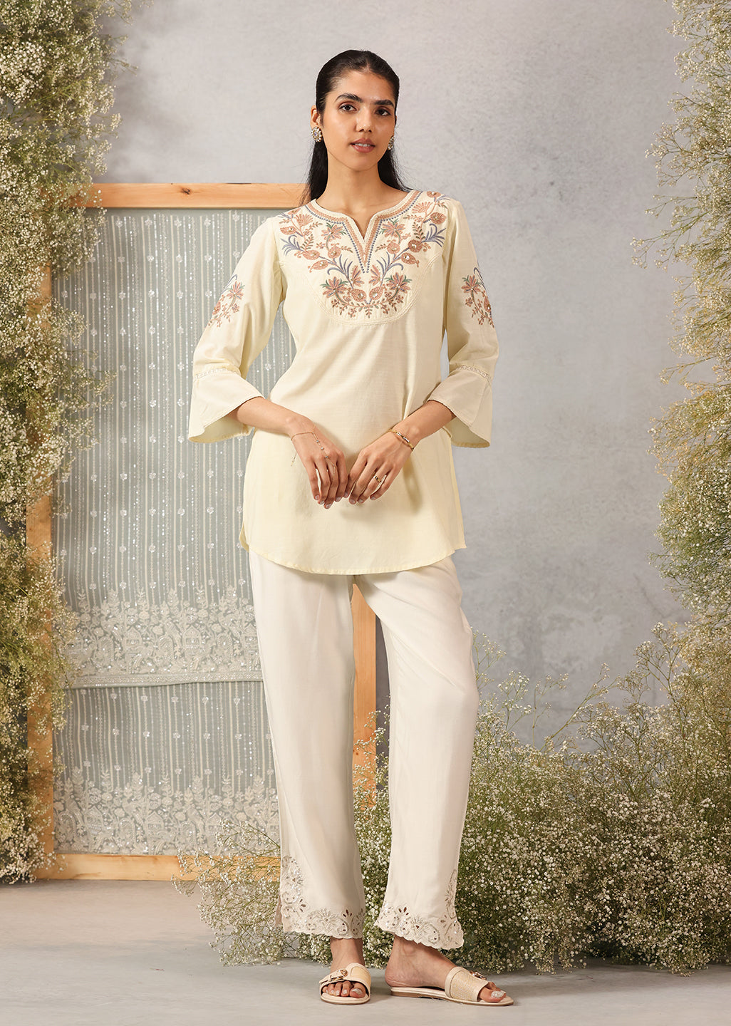 Lily yellow embroidered cotton co-ord set with resham, zari, mukaish work, and pants with elastic waistband for comfort