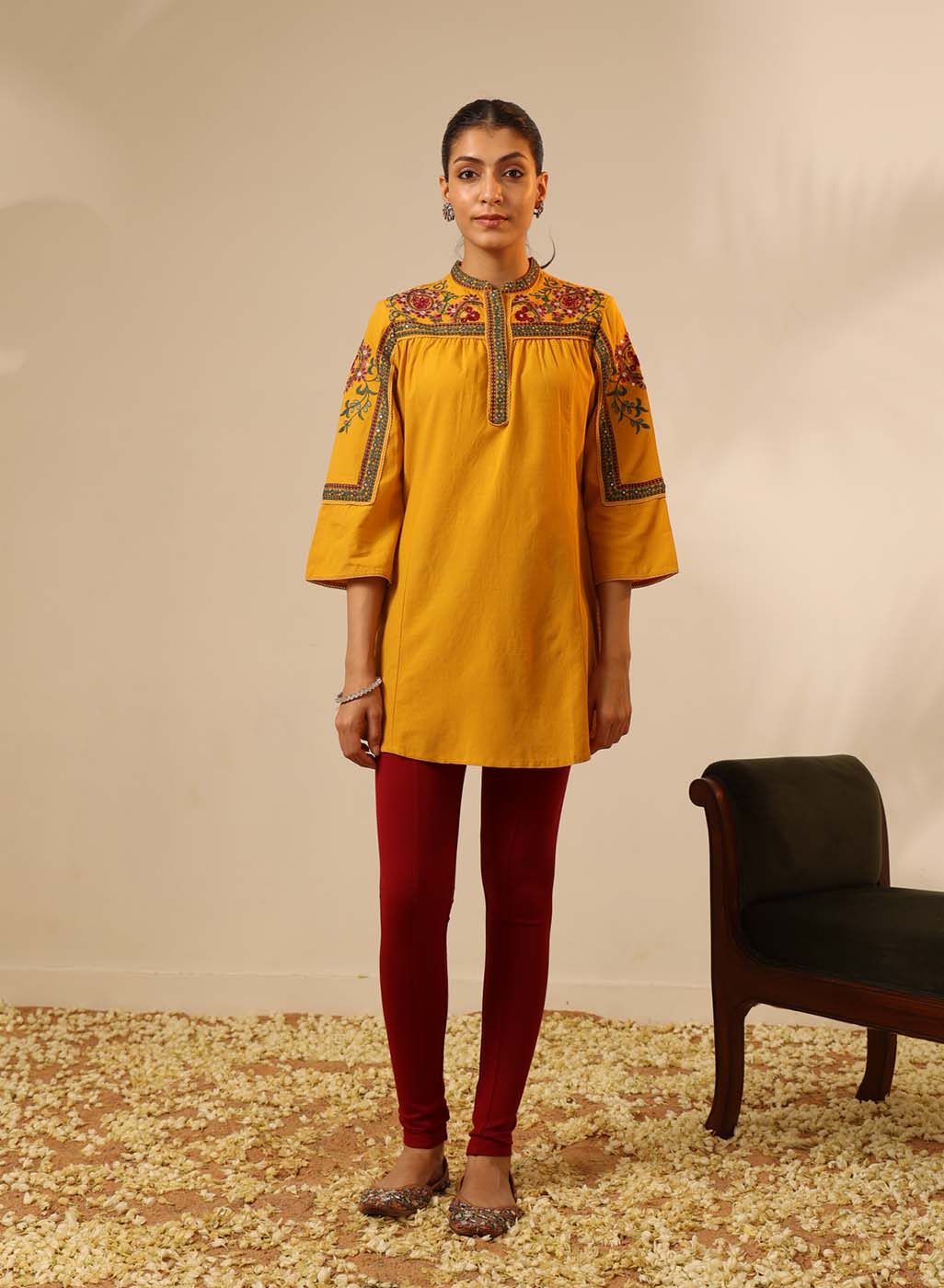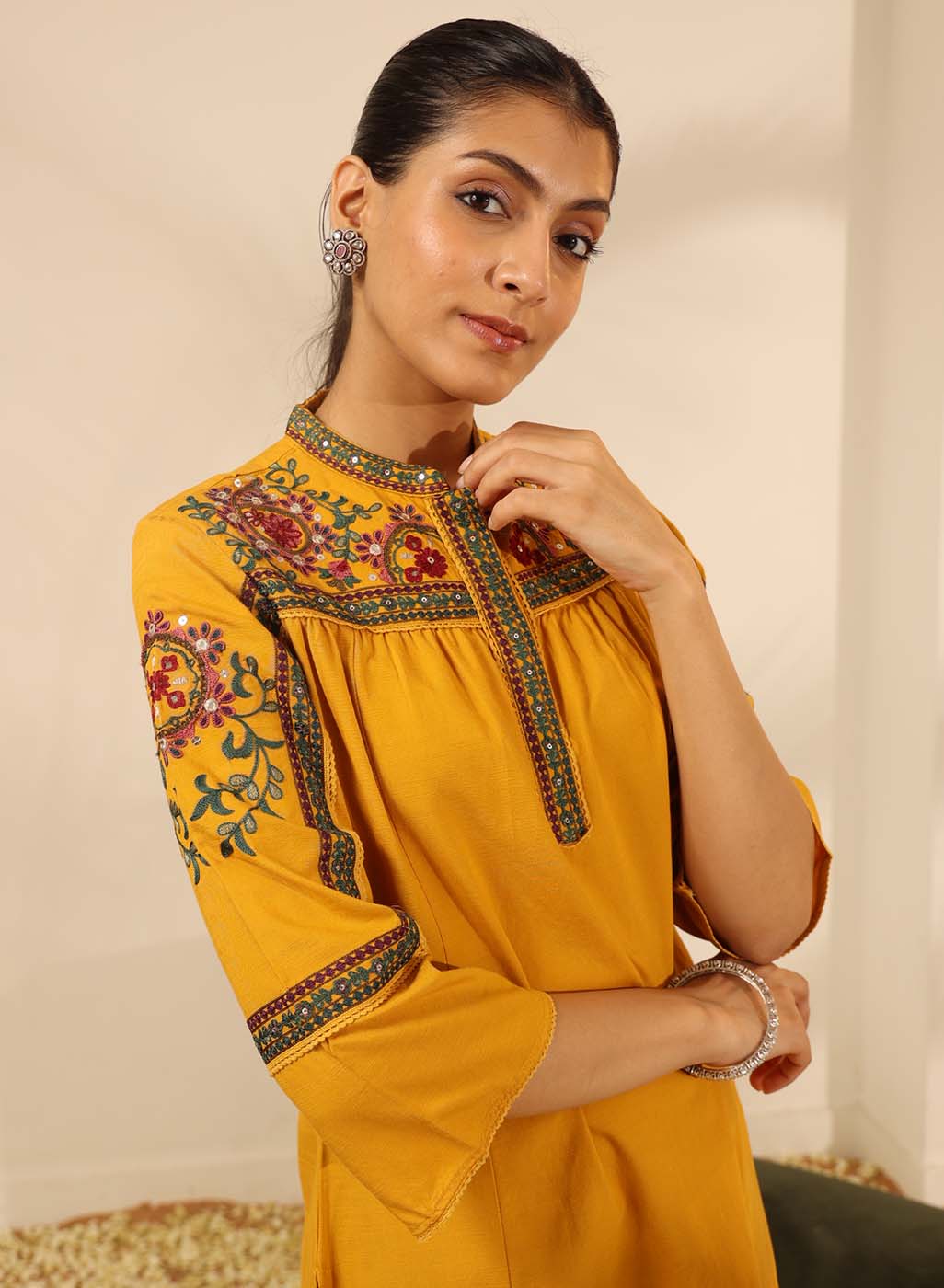 Golden Kurta for Women with Threadwork and Lace Detailing