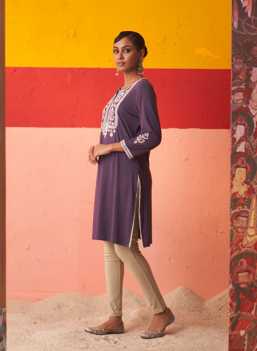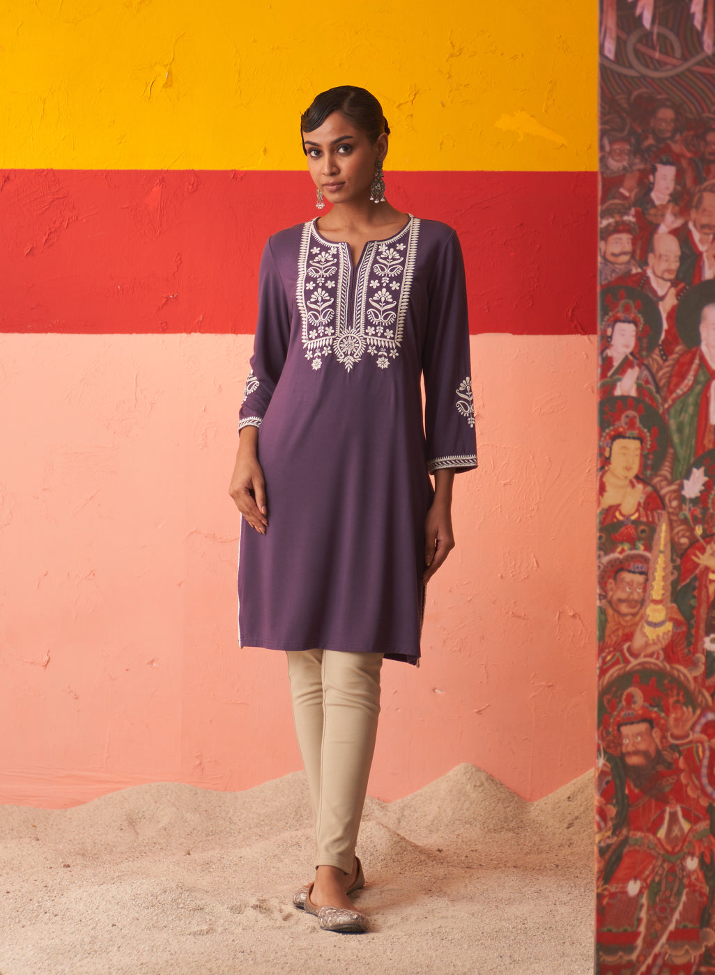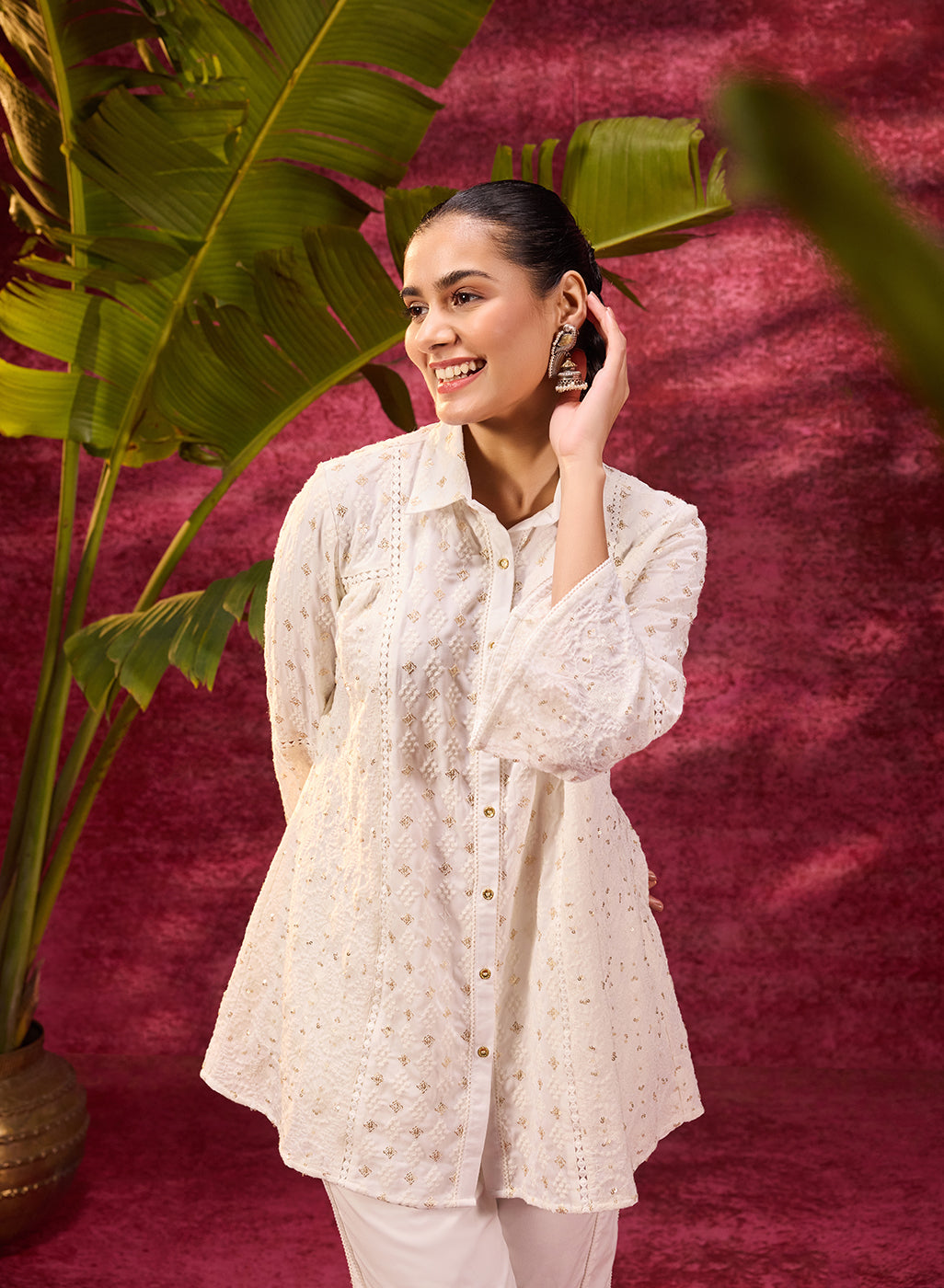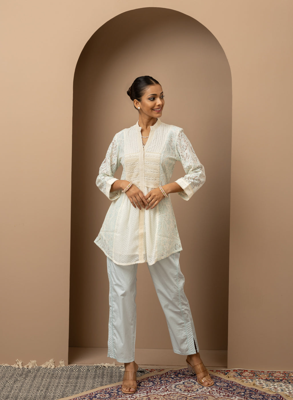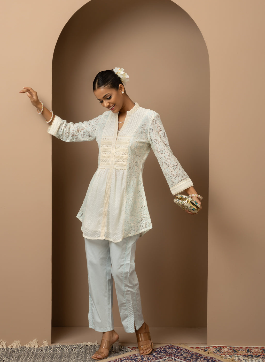 White Stretchable Kurti for Women with Threadwork and Lace Work