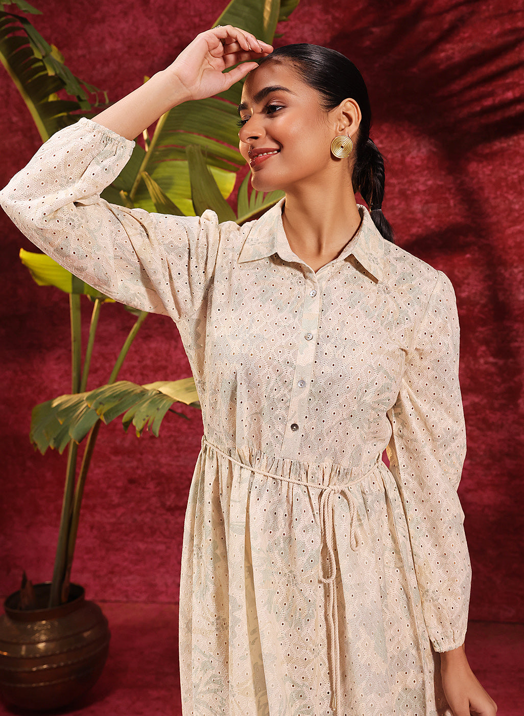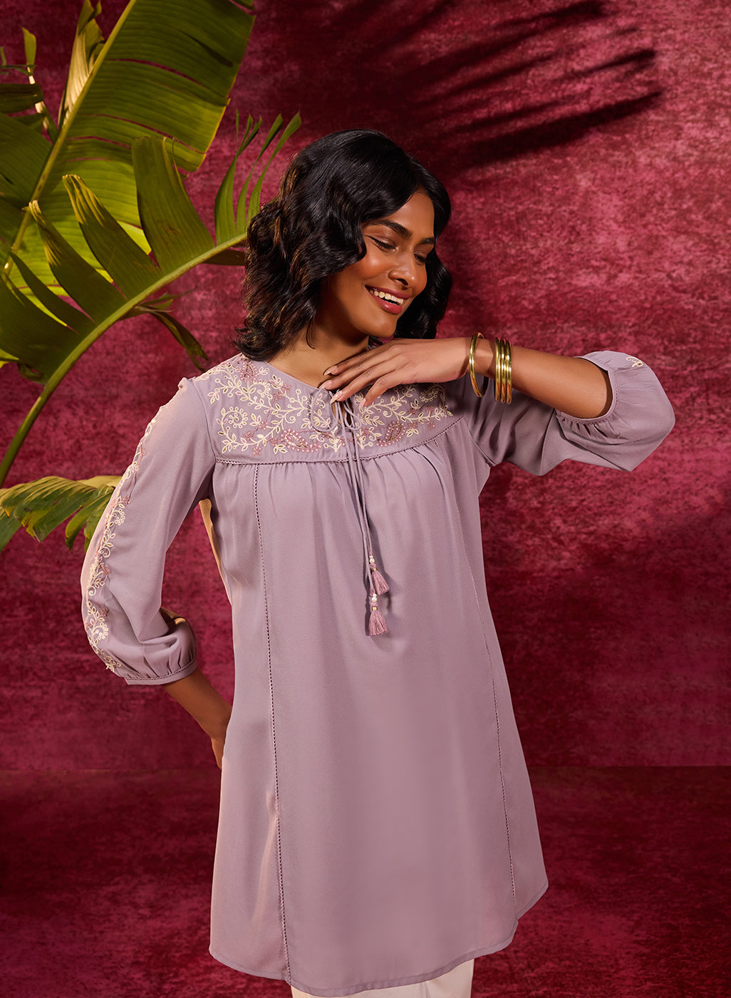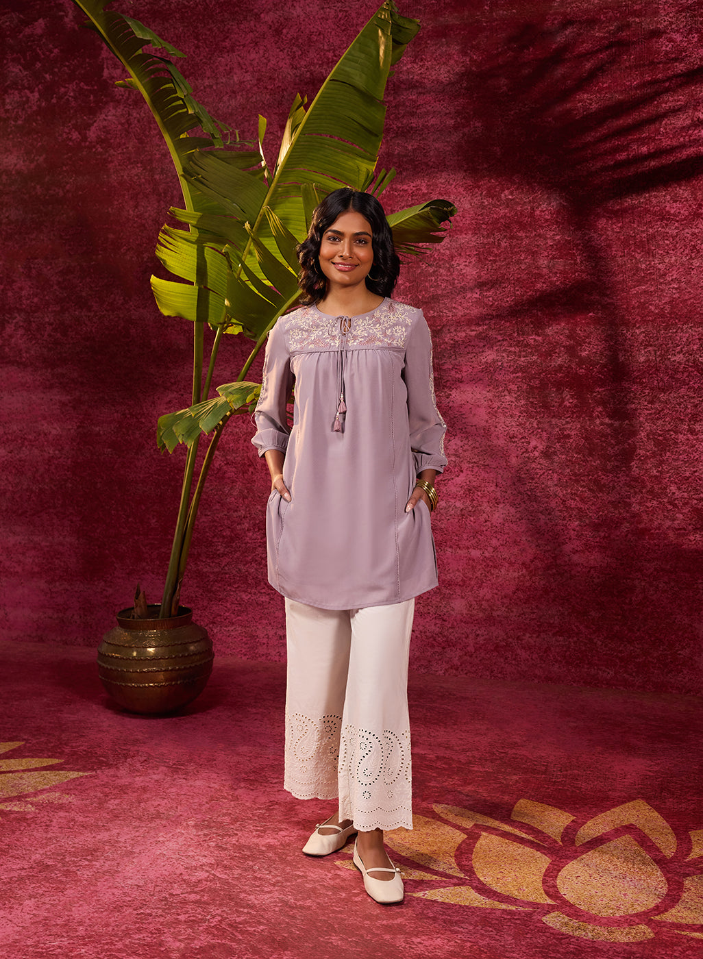 Ivory A line Rayon Tunic with Embroidery and Smocking effect Puffed Sleeve