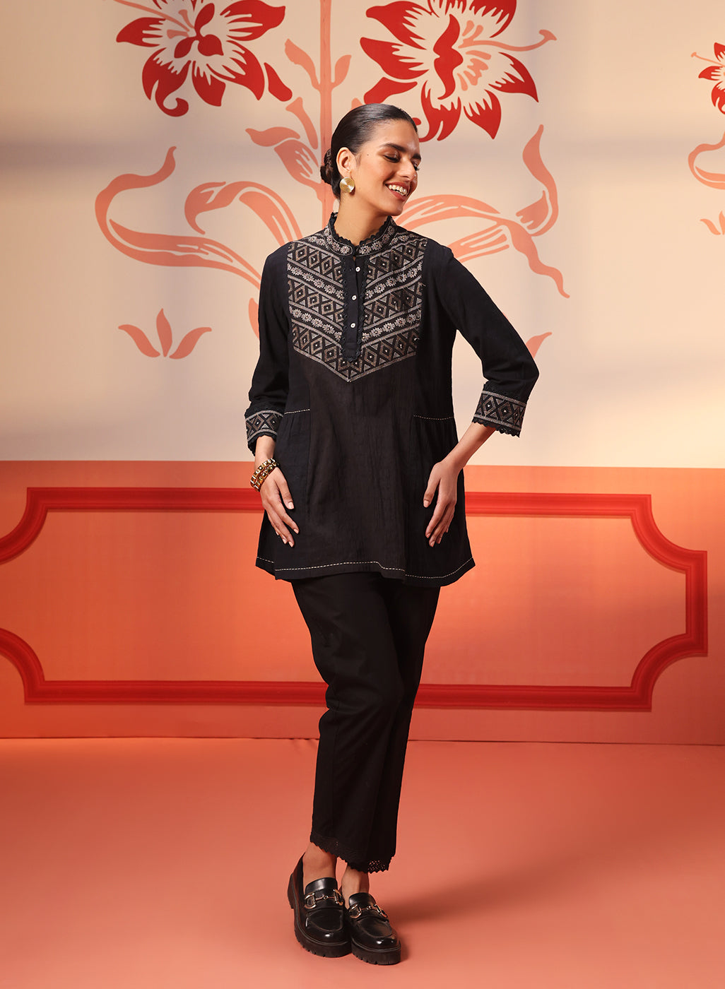 Black Woollen Kurta for Women with Leather Collar and Sequin Work