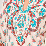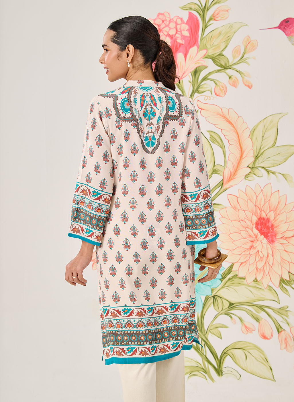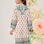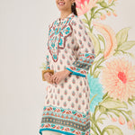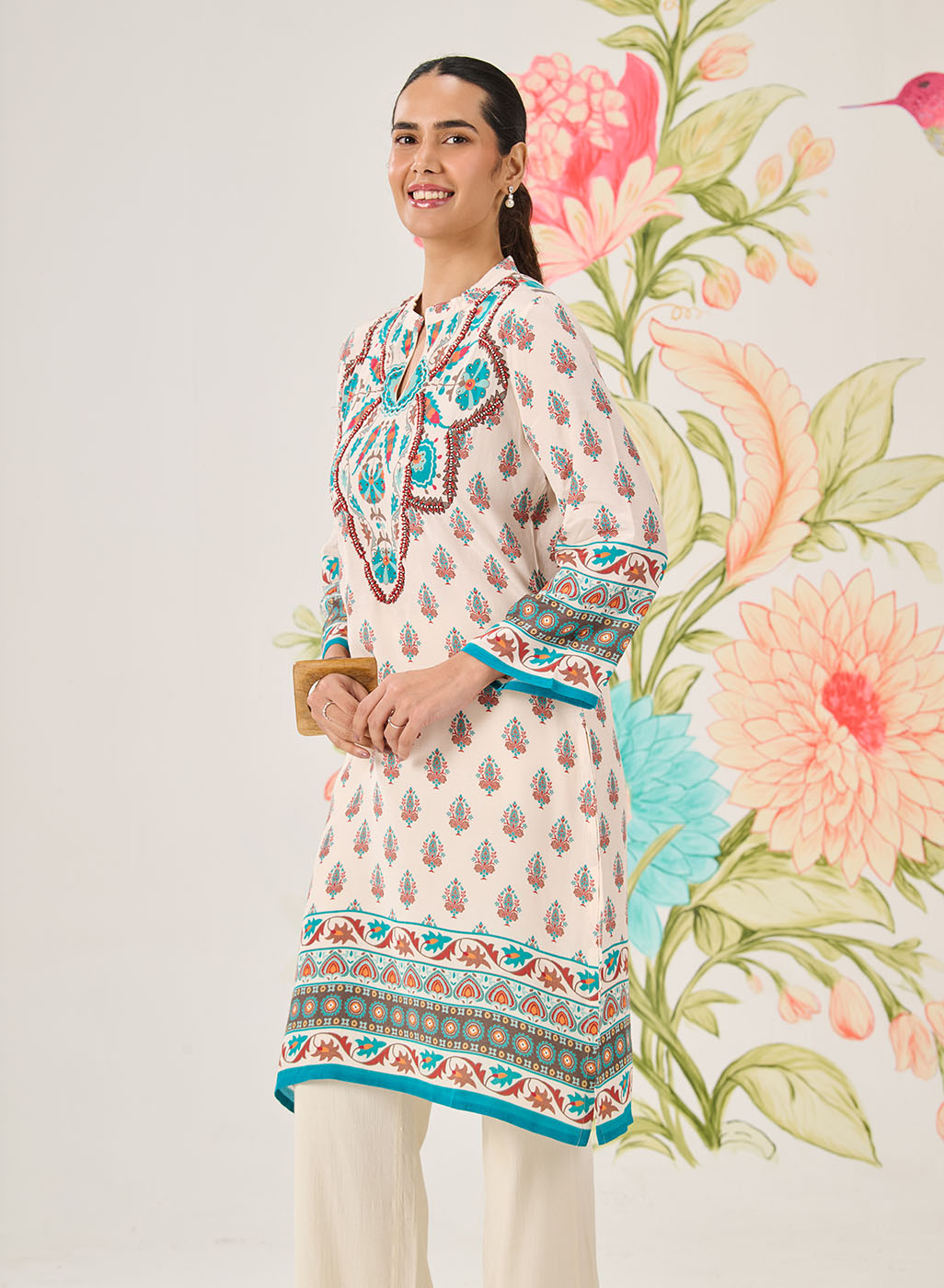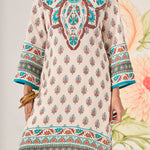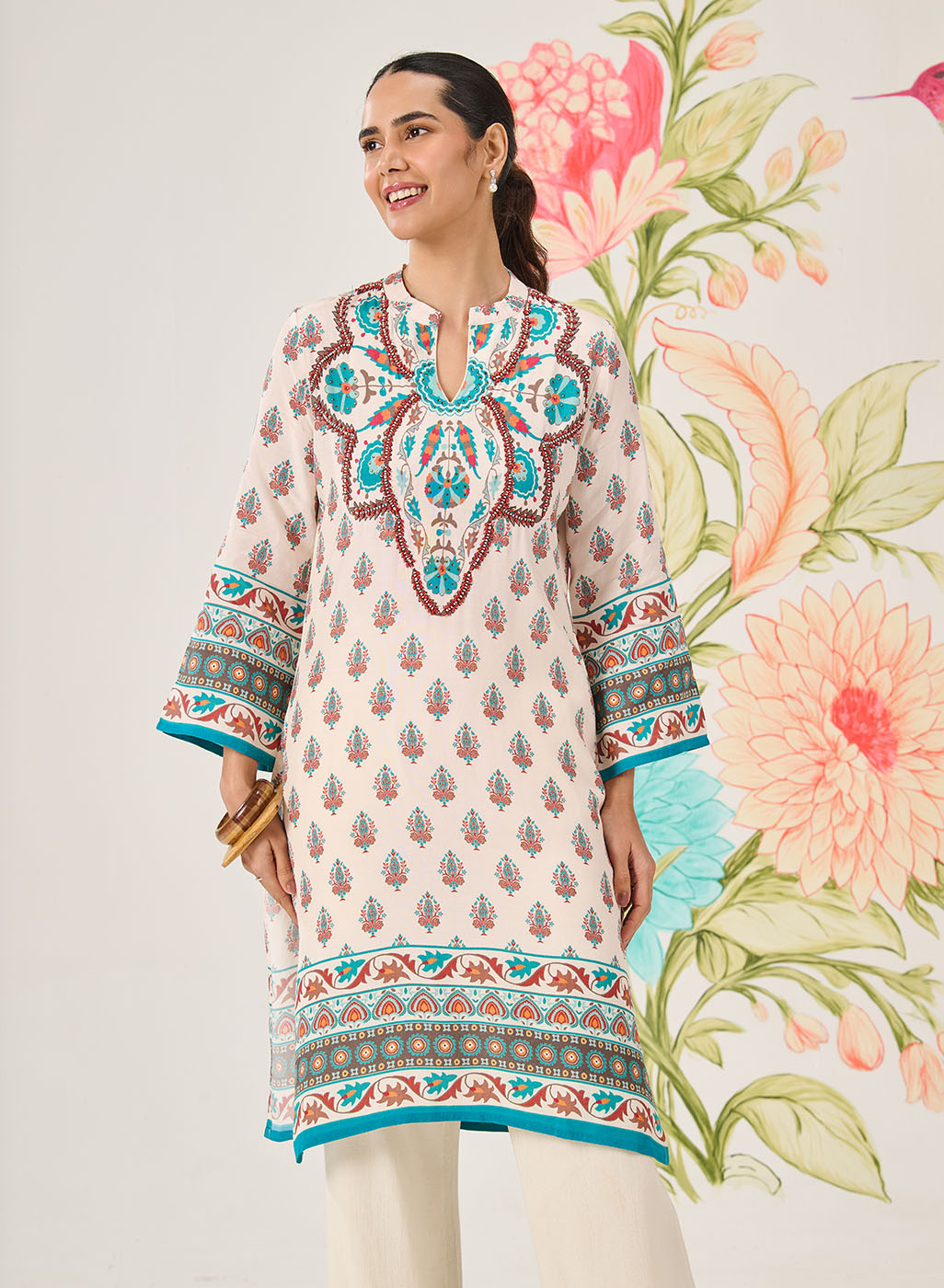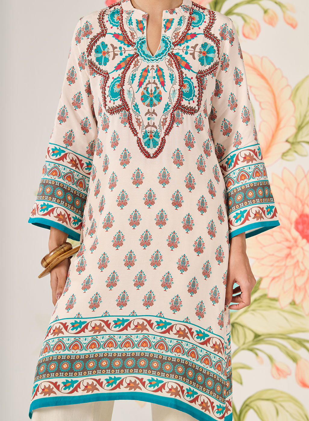 In a rich teal hue, this kurti blends tradition with everyday comfort. The Mughal-inspired print lends timeless appeal, while bead and rhinestone embellishments at the neckline keep the look festive yet understated.