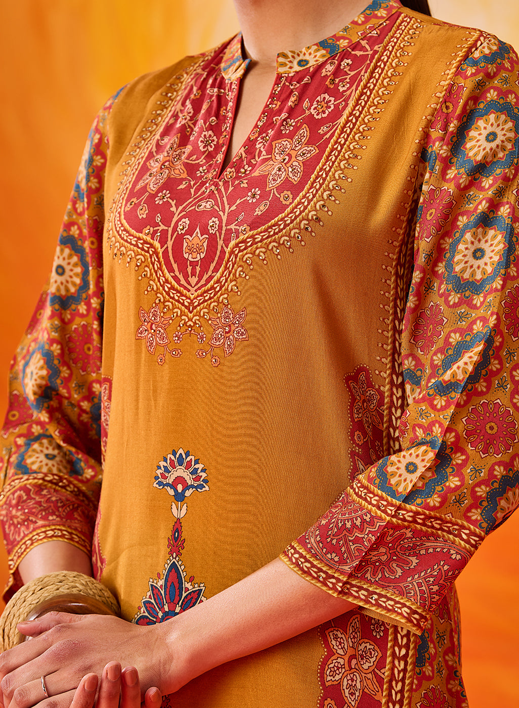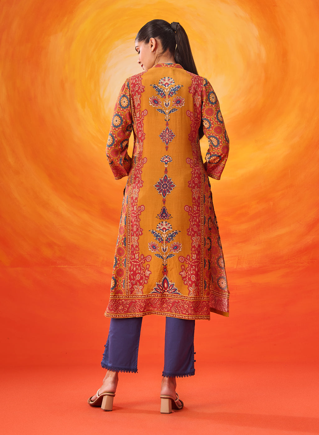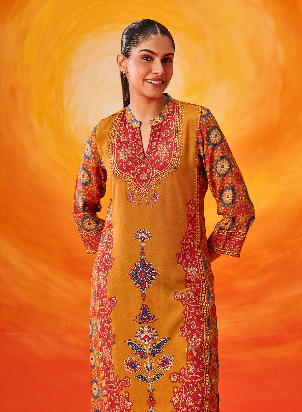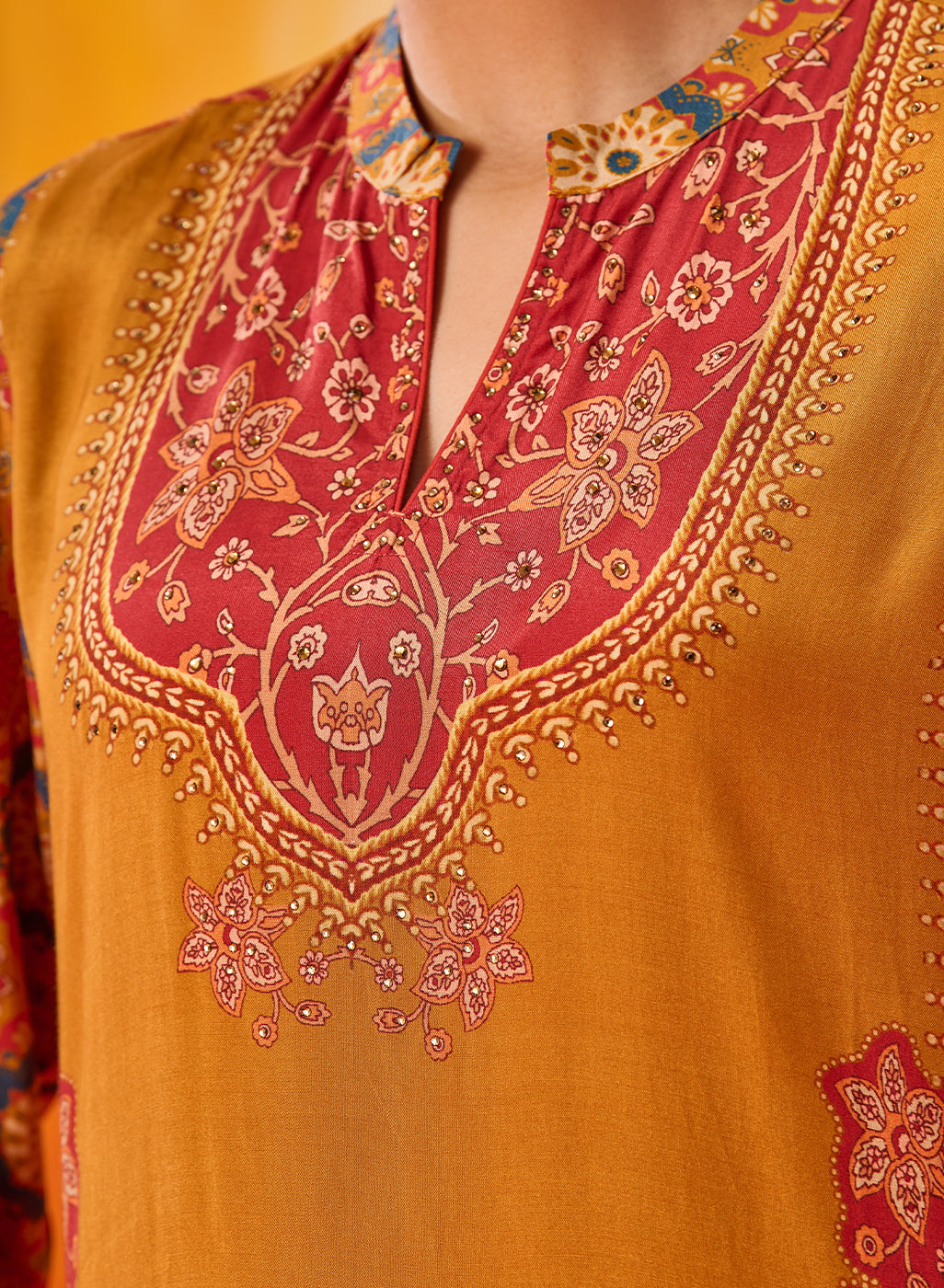 A beautiful play of colour and craftsmanship, this mustard floral printed kurta stands out with its shantoon texture and delicate rhinestone embellishment detailing. The look feels refined yet relaxed—perfect for daytime festivities. Inspired by Mughal floral motifs, it carries an added layer of visual charm.