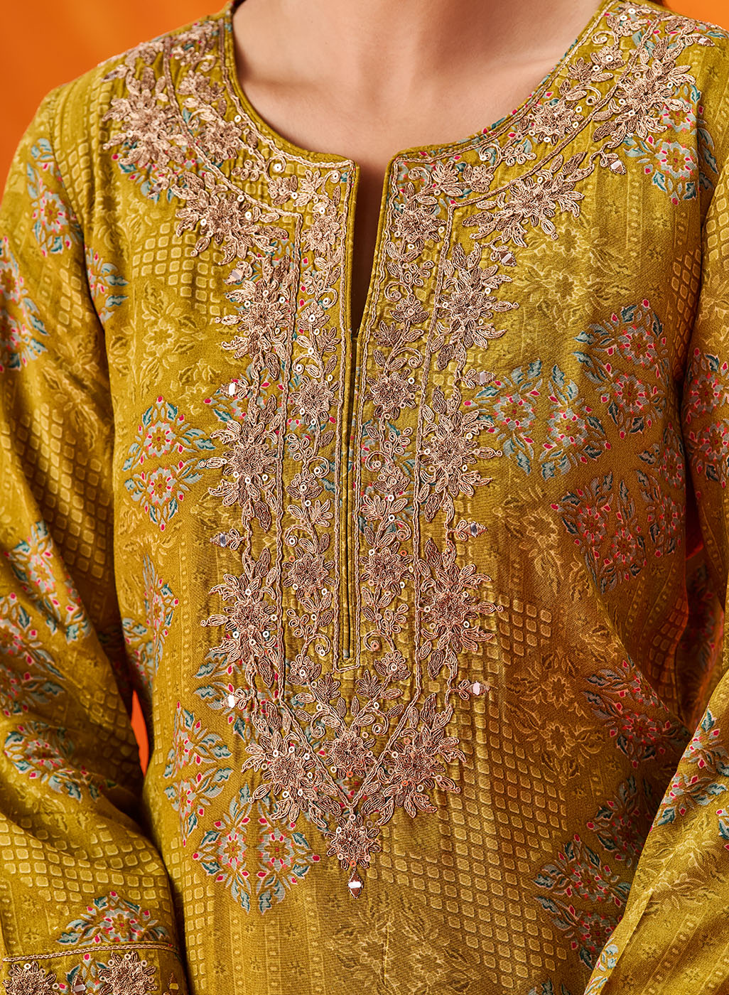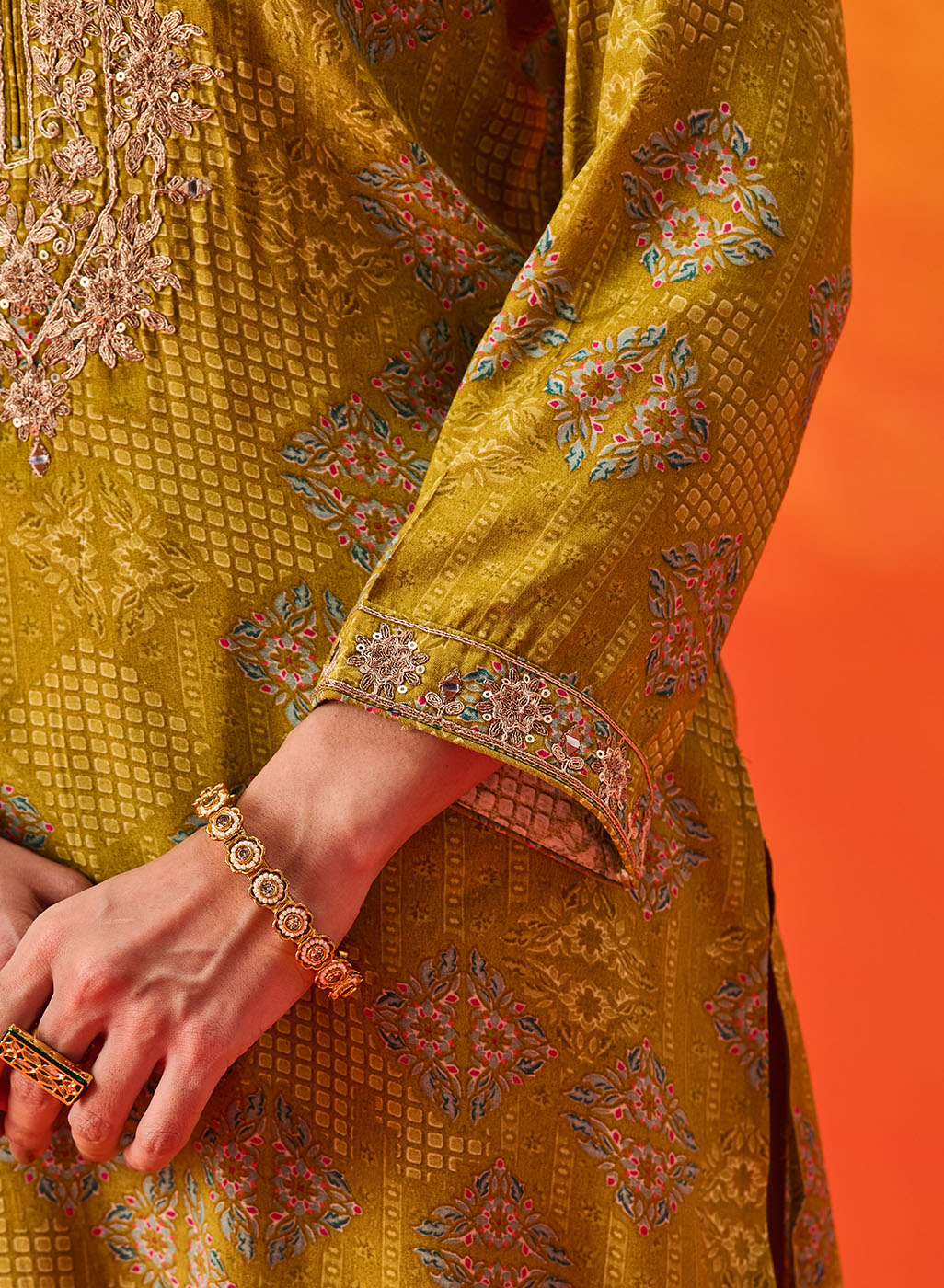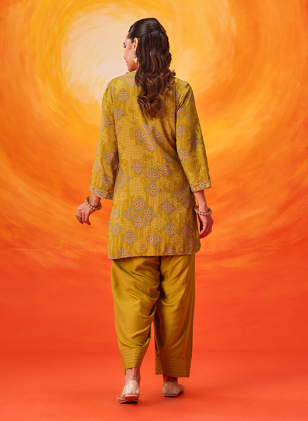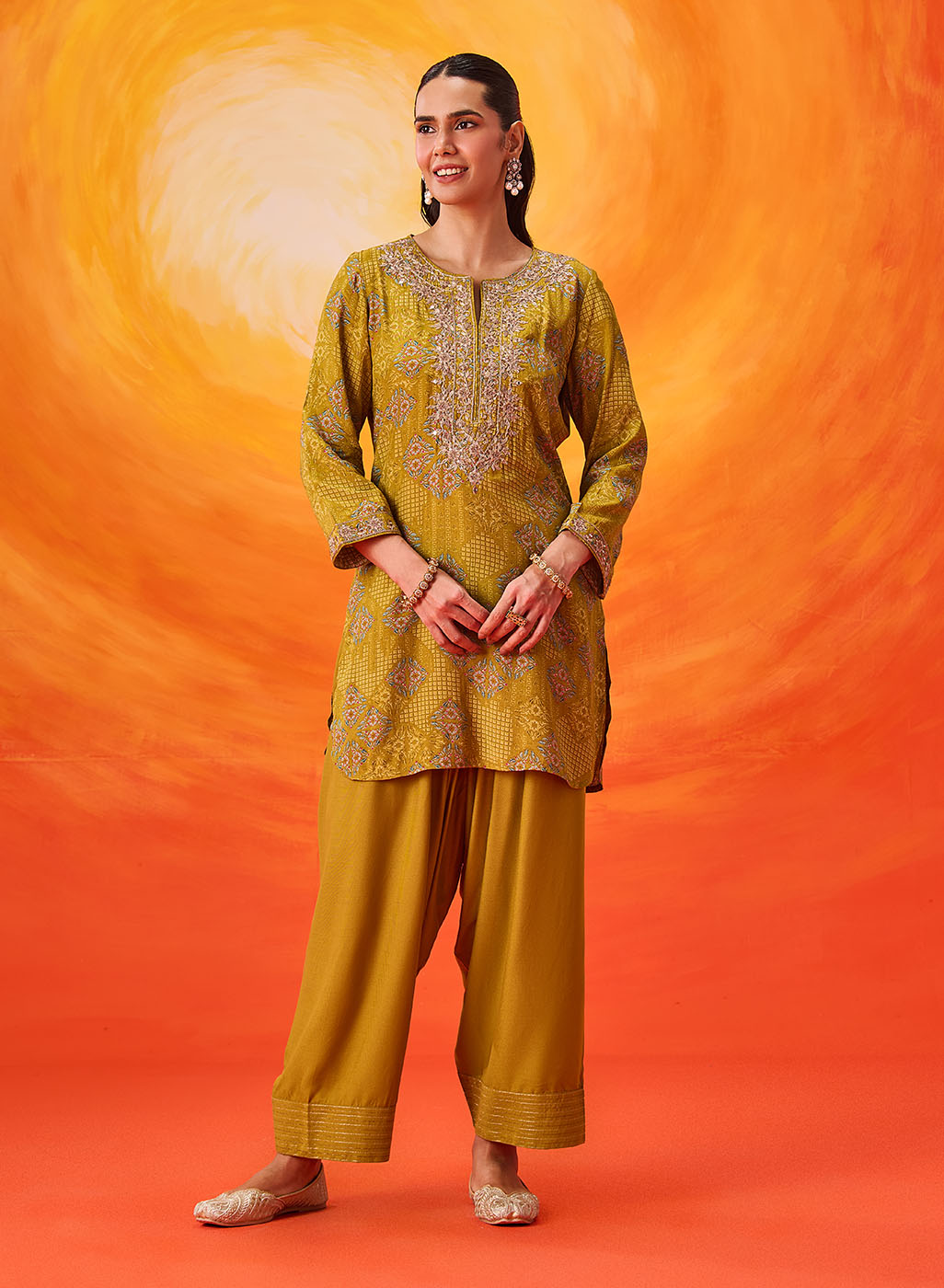 Easy, breezy and full of charm, this green co-ord set is a youthful twist on Indian festive dressing. The all-over block-print-inspired motifs add visual interest, while delicate dori embroidery with sequin highlights brings just the right hint of shimmer. Comfortable yet polished, it’s a set you’ll reach for often.