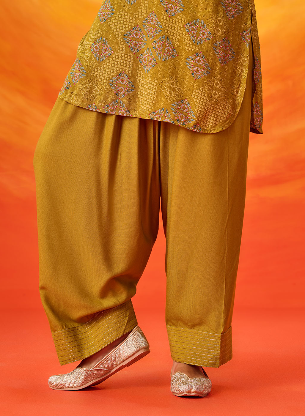 - Mid-rise salwar with elastic waistband, pockets and zari lines on the hem.