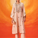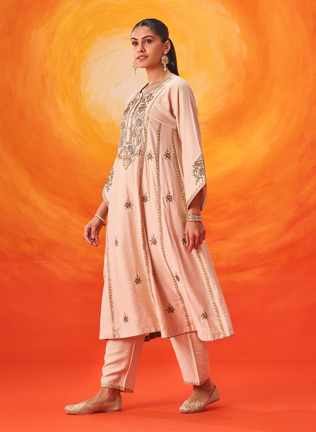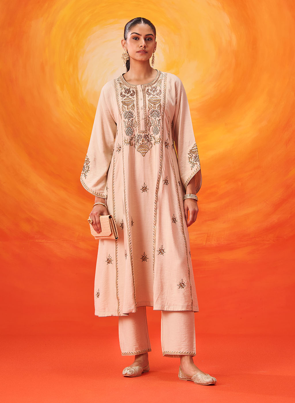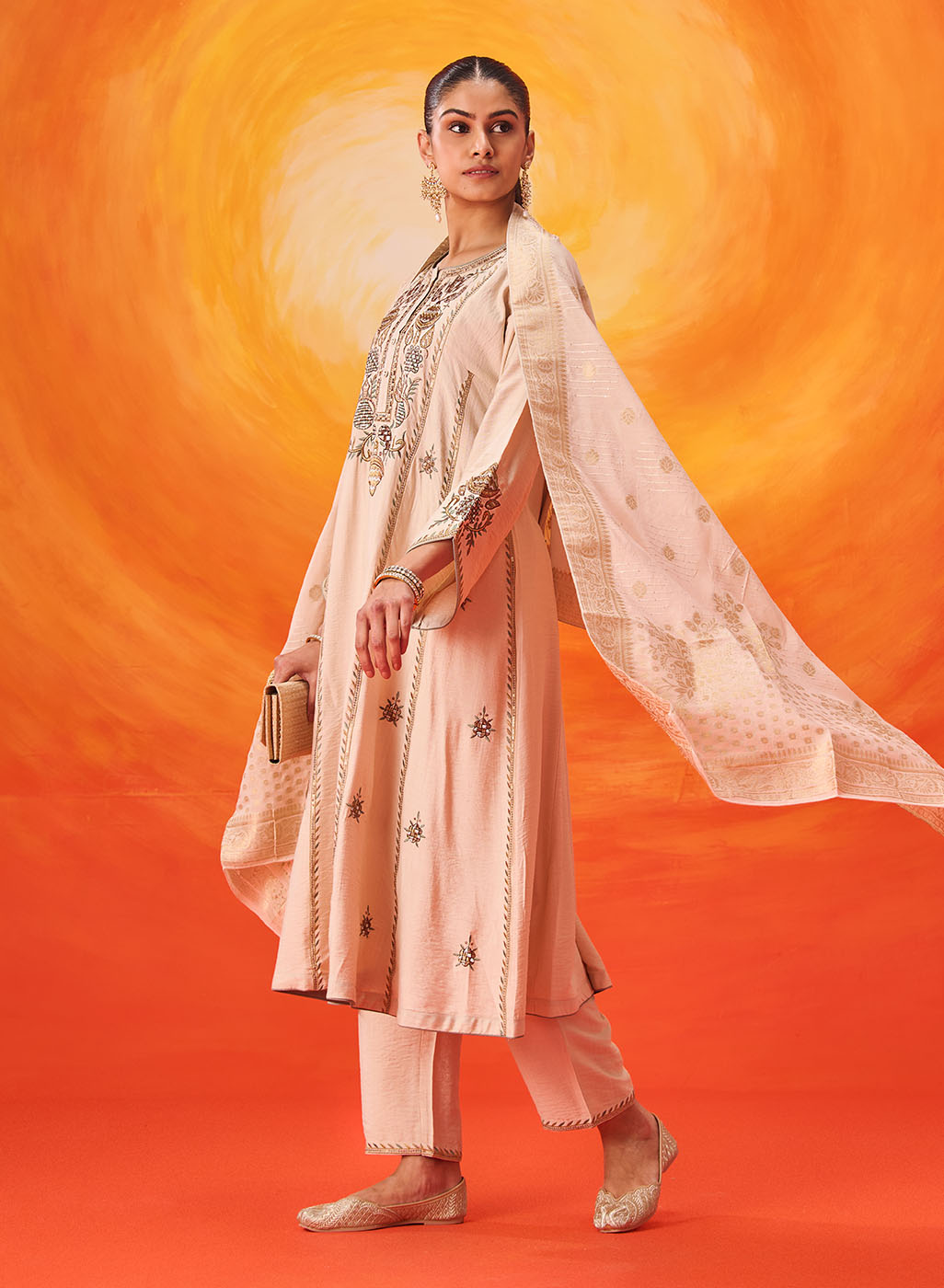 This ivory suit set is crafted for moments that call for understated grandeur. The A-line kurta, accented with princess seams, flows softly. Inspired by Indian florals, the embroidery and the silhouette are feminine and delicate. The contrast piping with Banarasi accents refines the look and makes it fit for royalty.